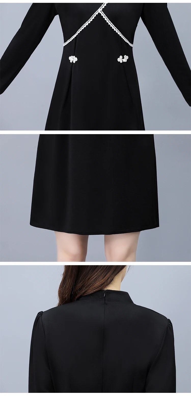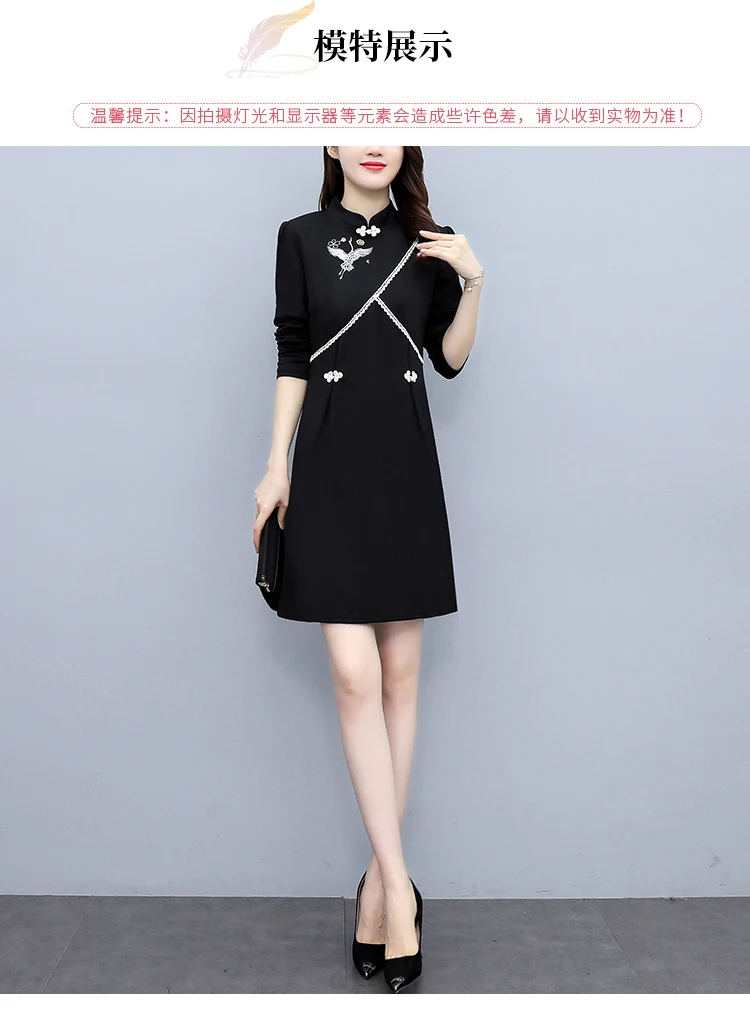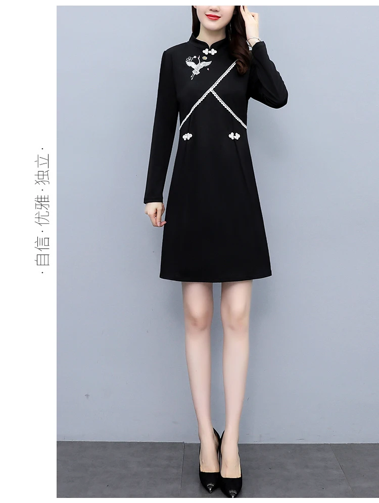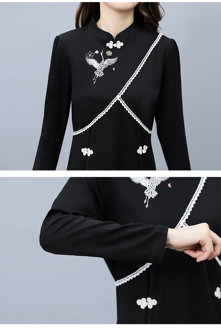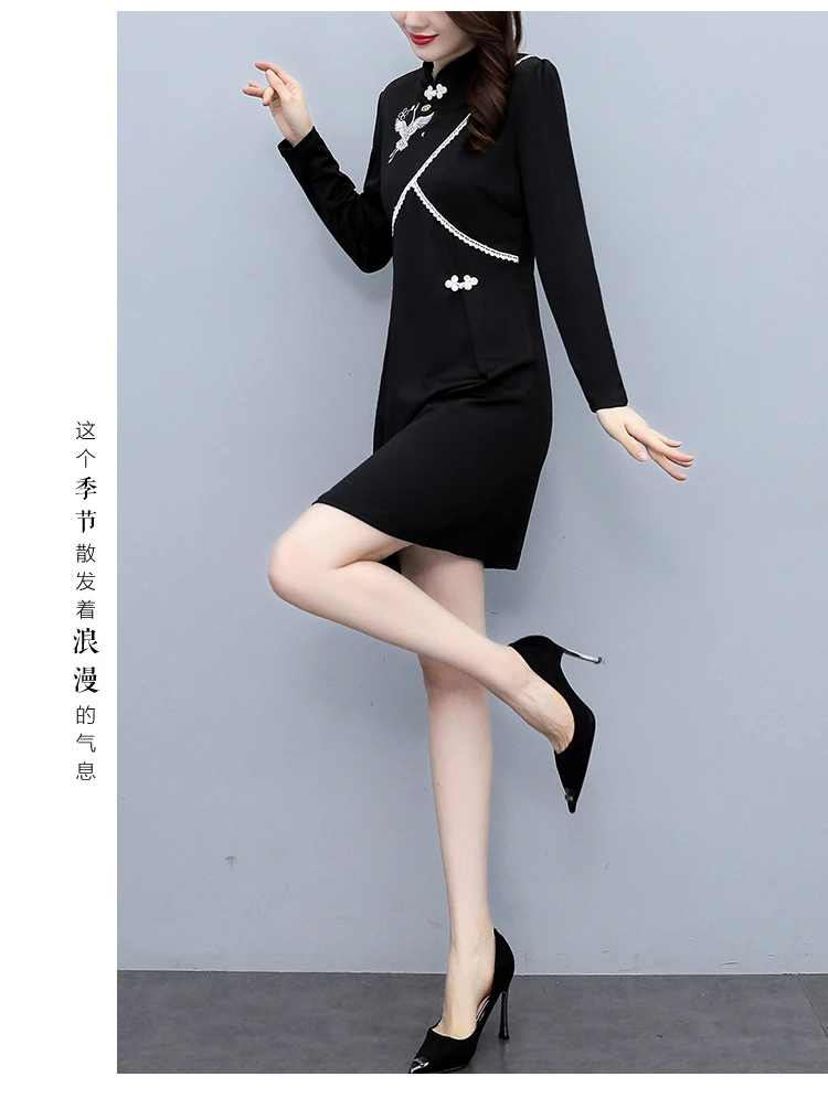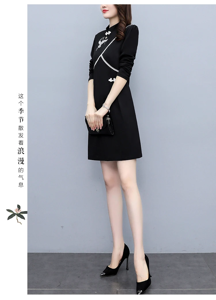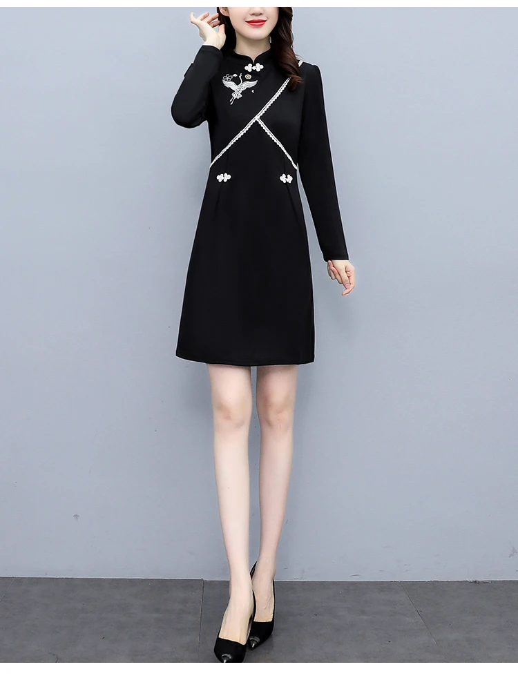 2021 Autumn Long Sleeve Vintage Chinese Style Mini Dress Women Stand Collar Buckle Crane Embroidery Improved Cheongsam Female