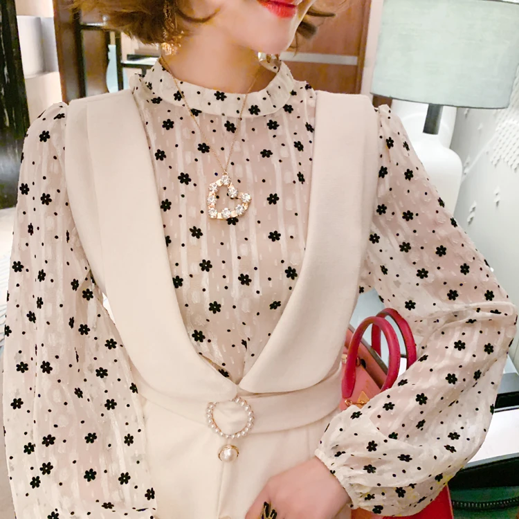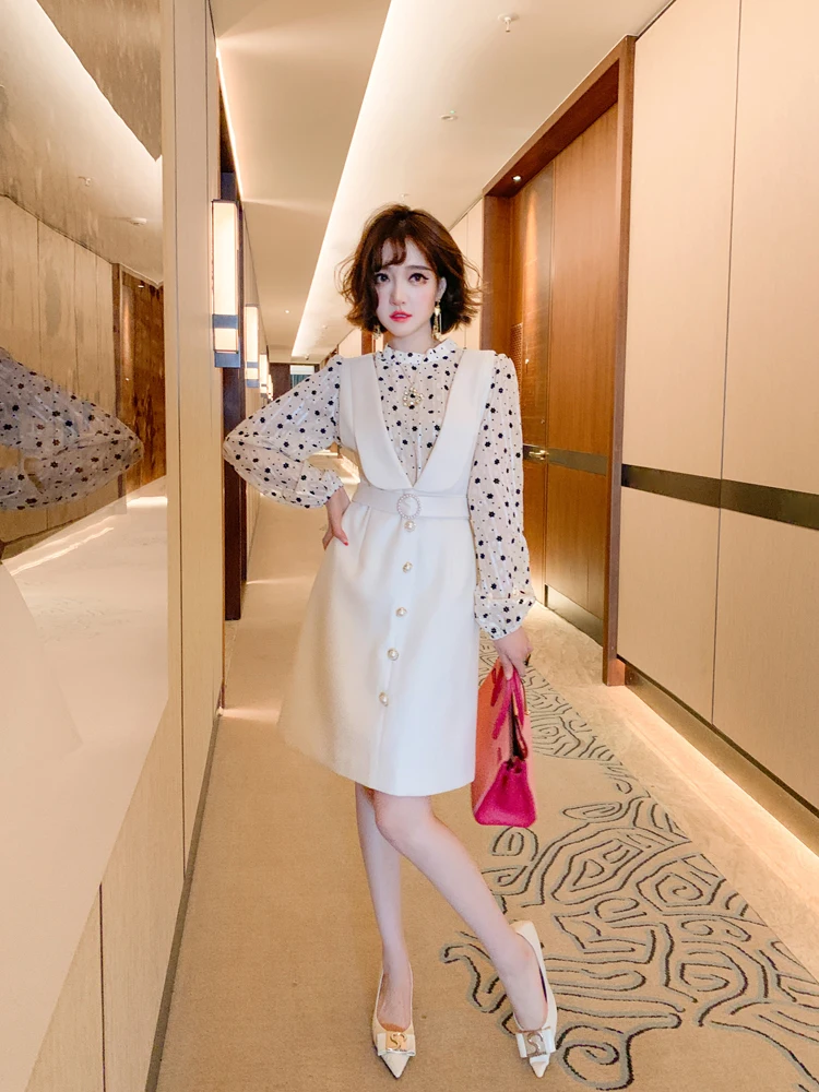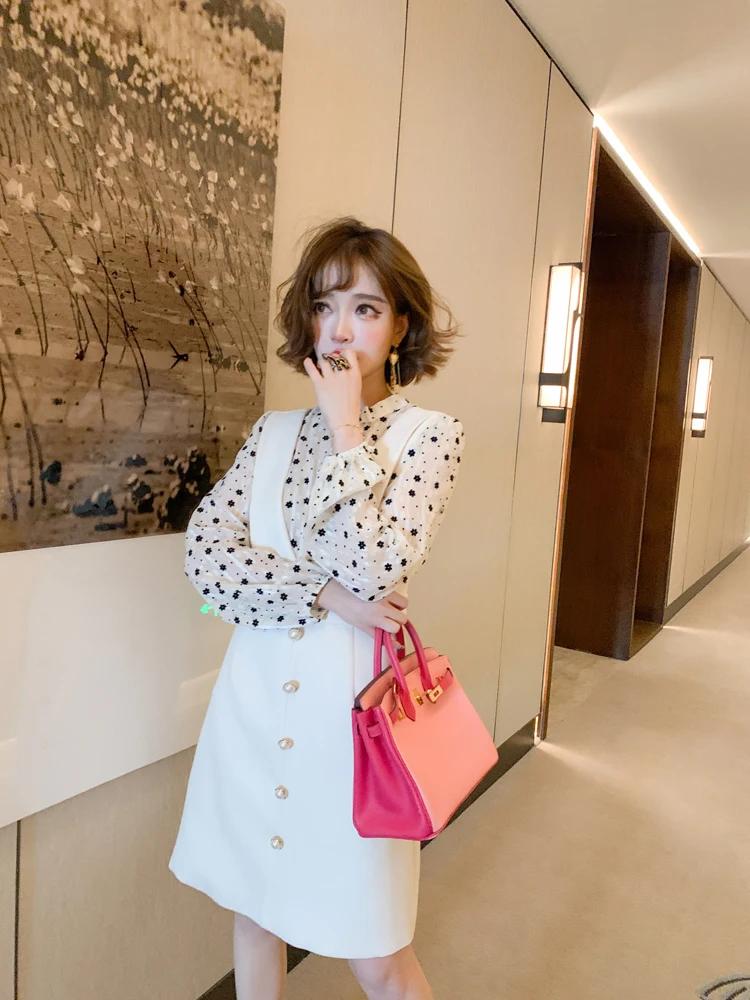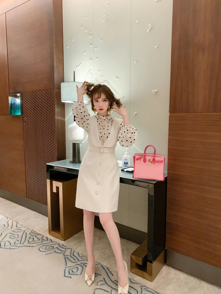 2021 Autunm Wave Point Floral Long Sleeve Top + Beaded Button High Waist Vest Dress Two Piece Women Elegant Spring Dresses Ladies Clothes