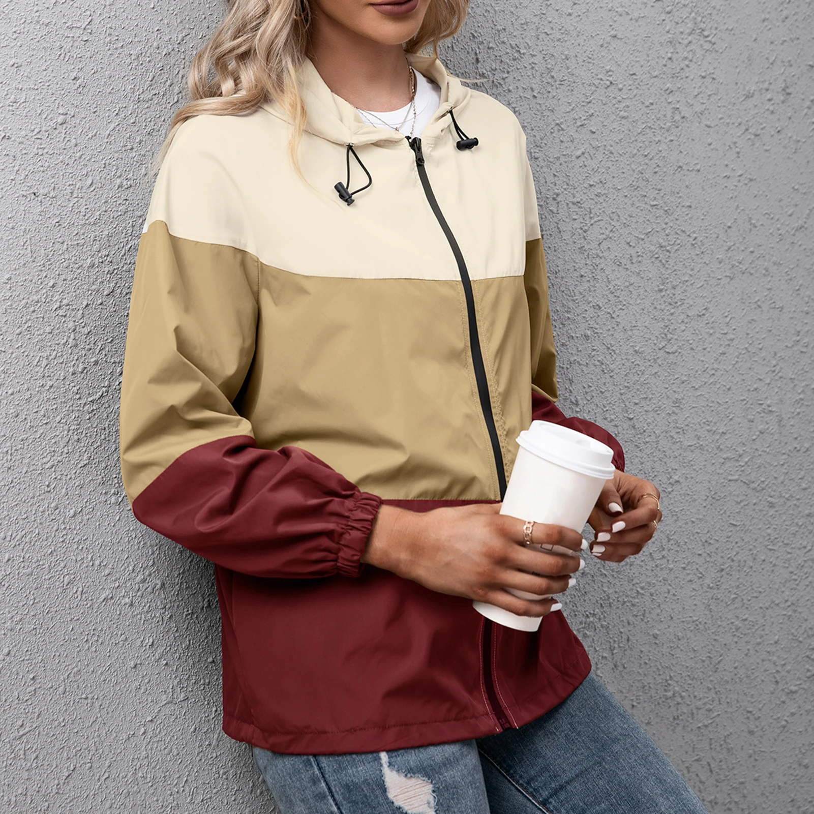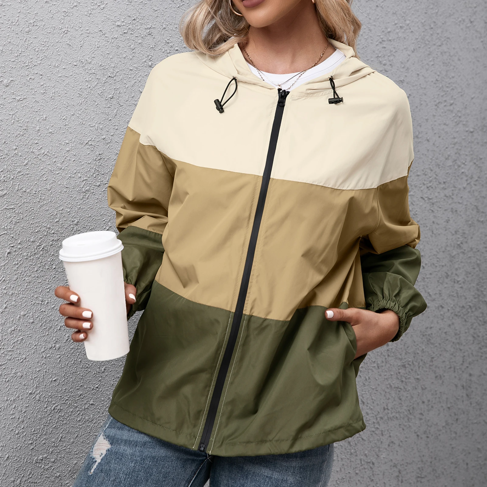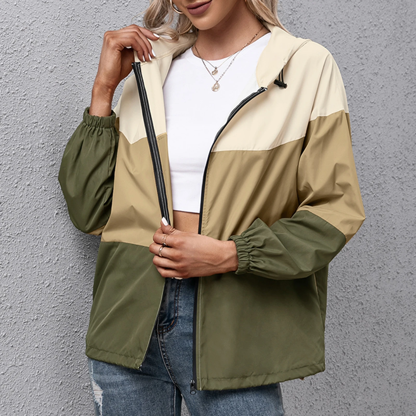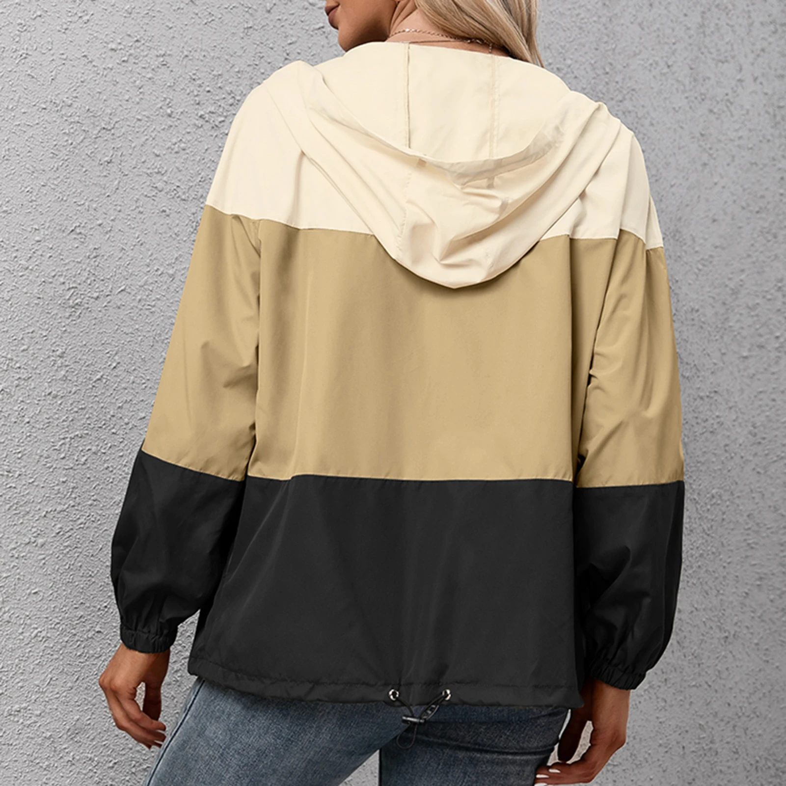 Windbreaker with splicing design features a fixed hood, long sleeves, zipper closure and side pockets. The windproof and waterproof fabric keeps you dry and cool on rainy days. Suitable for hiking, running, cycling and so on.