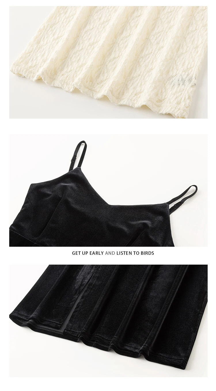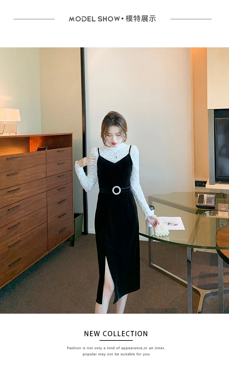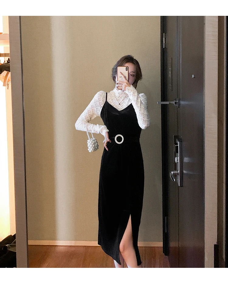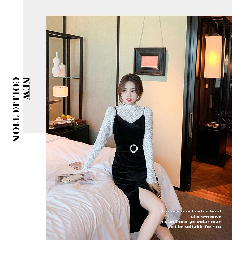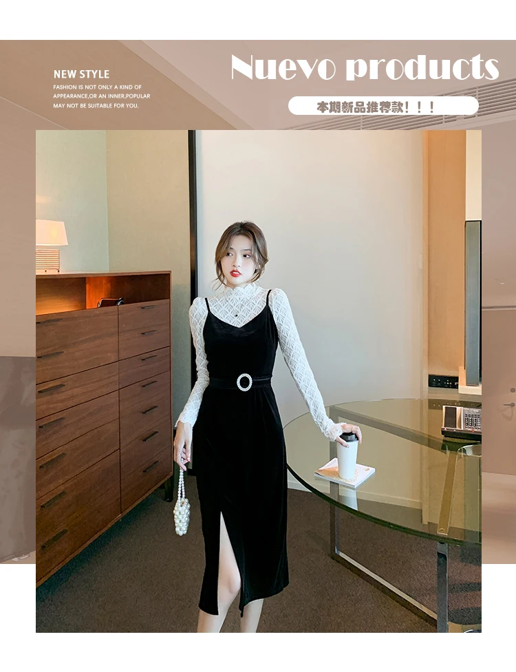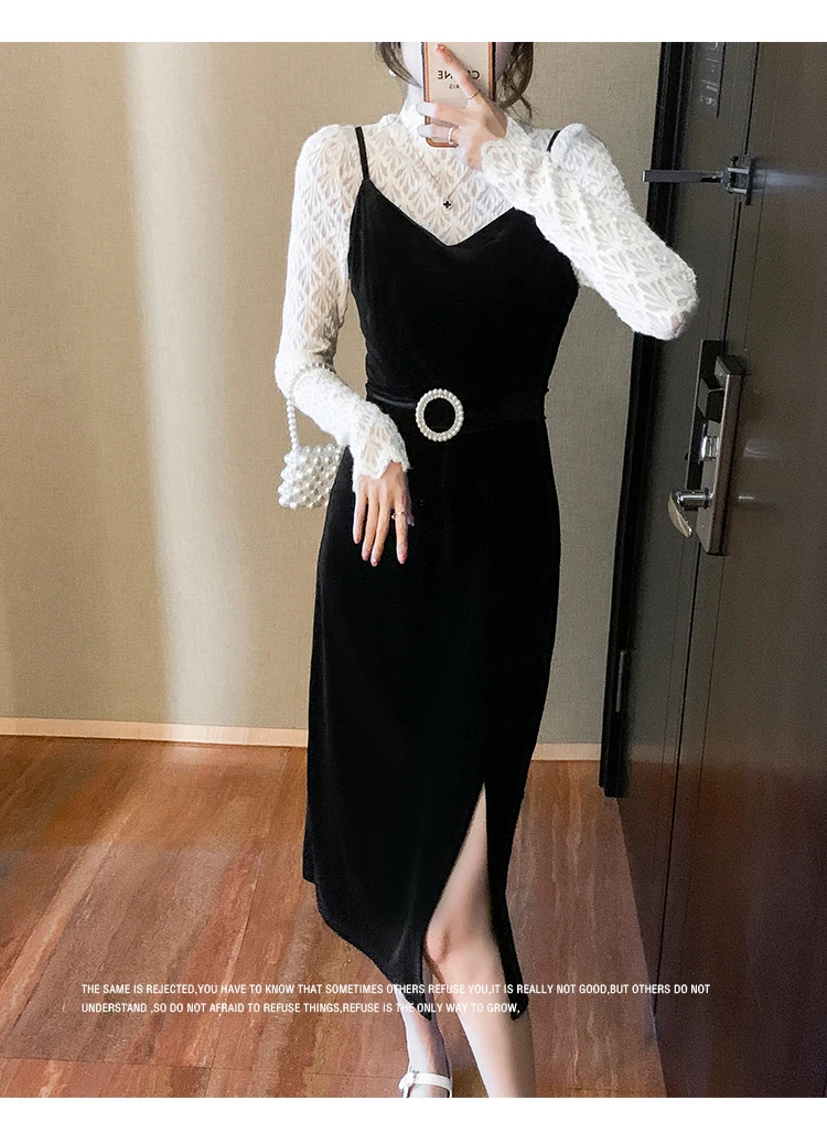 2021 Long Sleeve Lace Stand Collar Top High Waist Split Fork Slim Golden Velvet Sling Dress Women Autumn 2 Piece Clothes Set