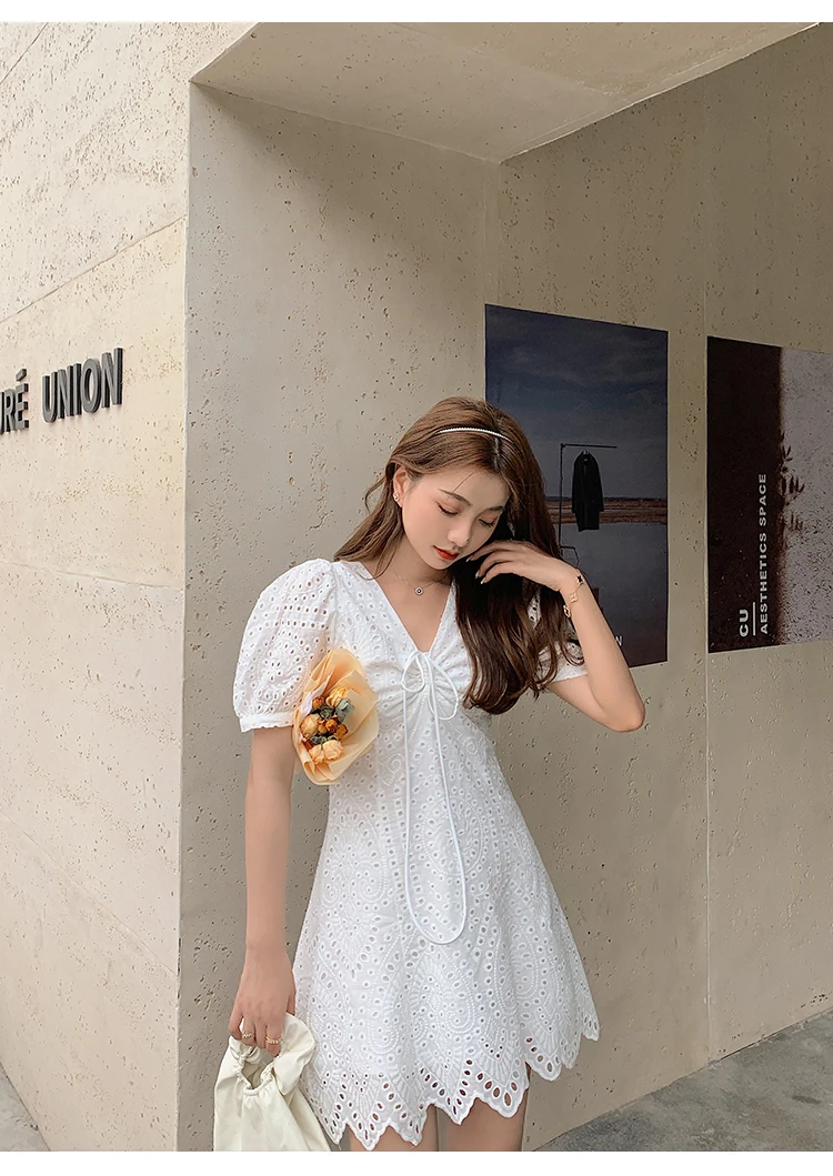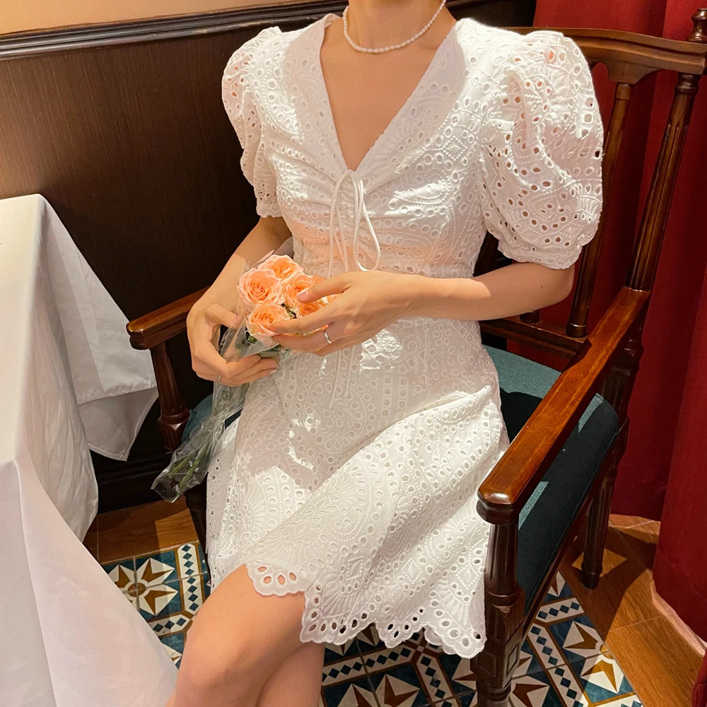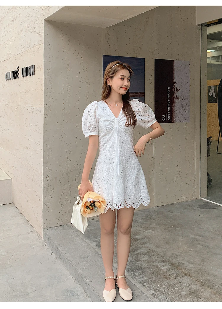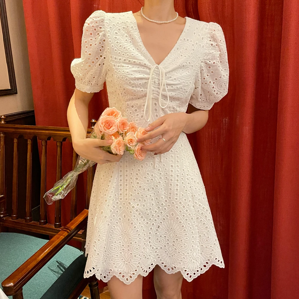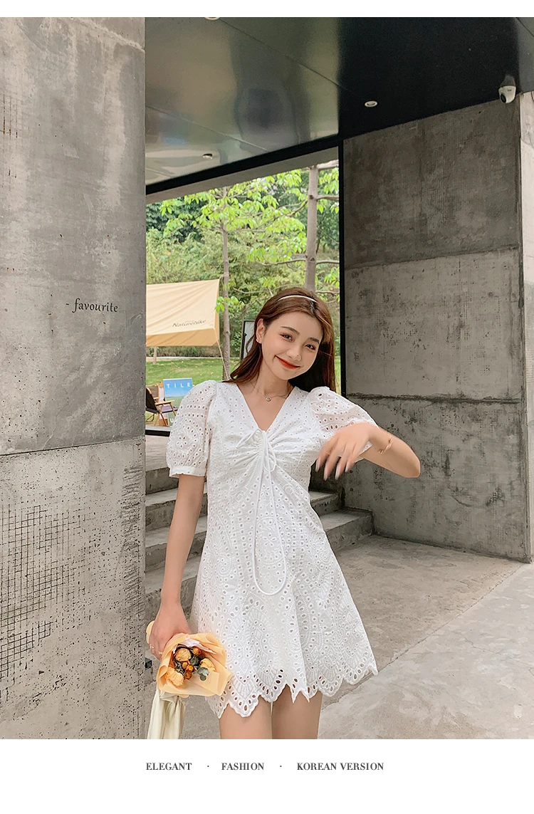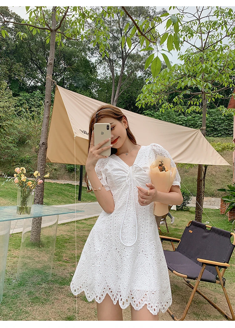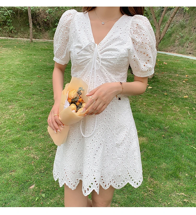 2021 New Korean Fashion Casual Summer Dress Women Sexy Drawstring V-Neck Lace Hollow Out White Mini Dresses Party Vestidos