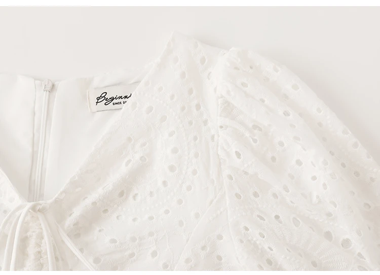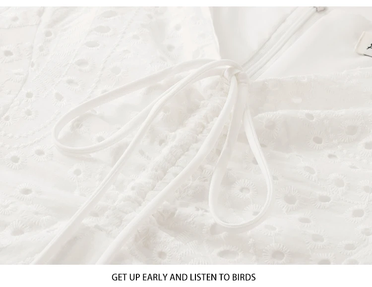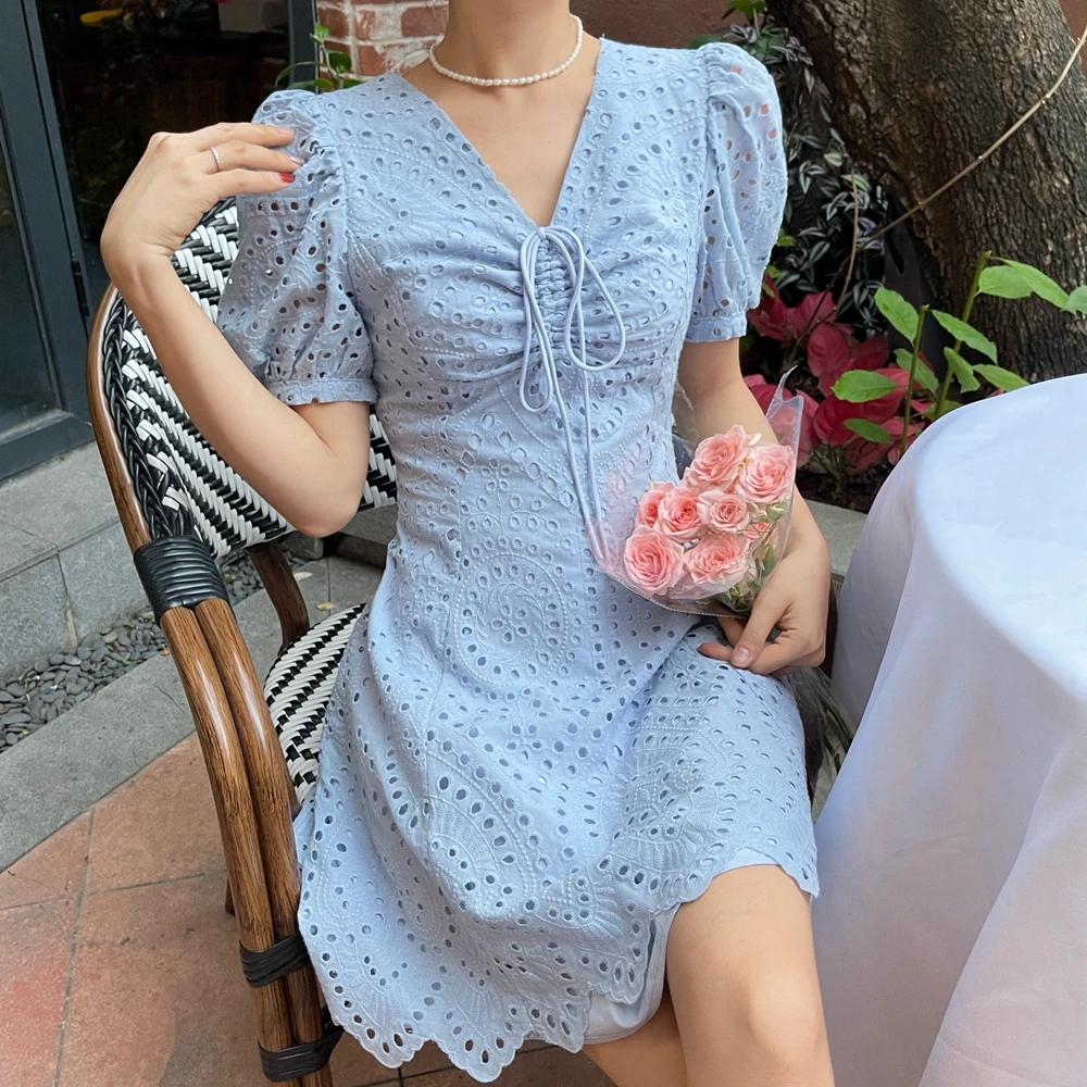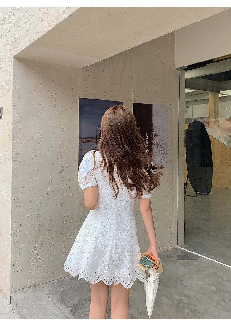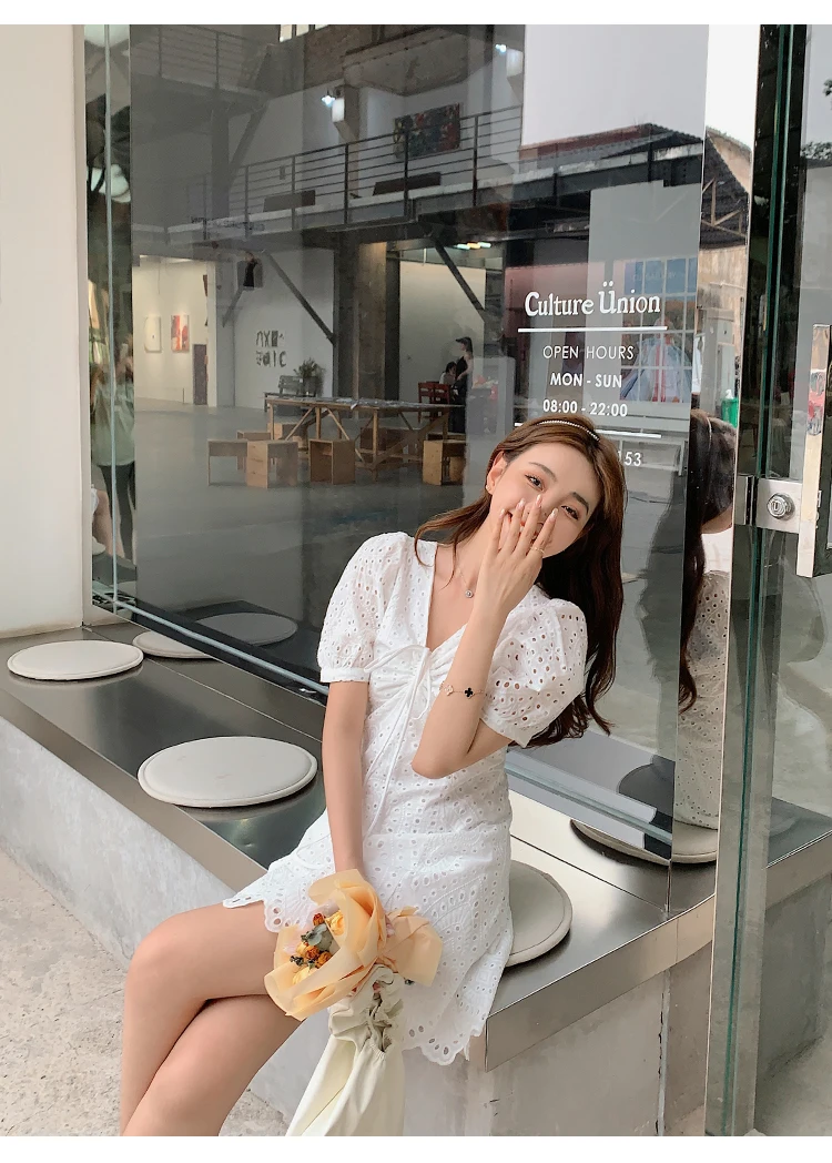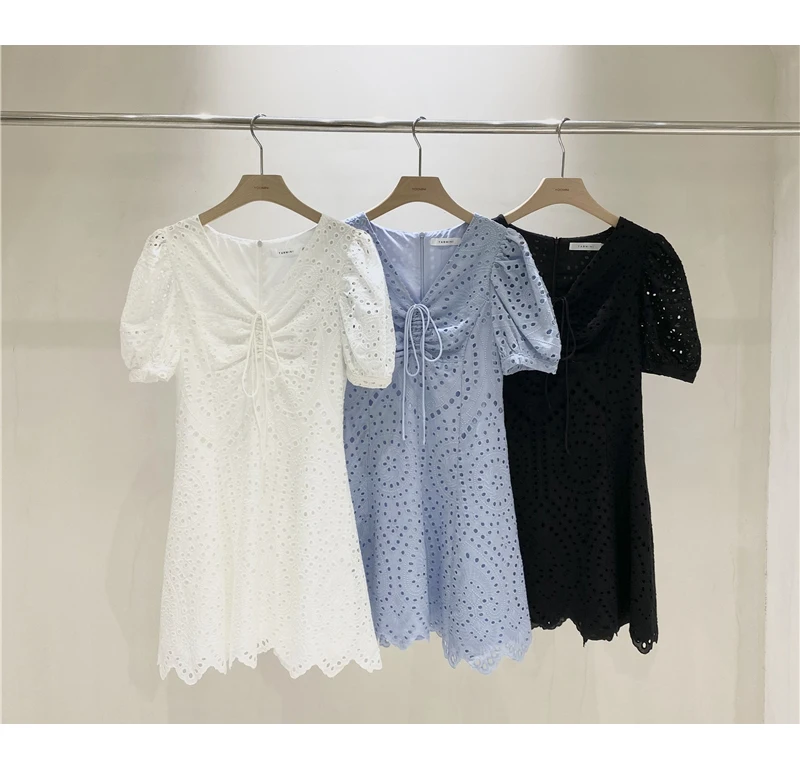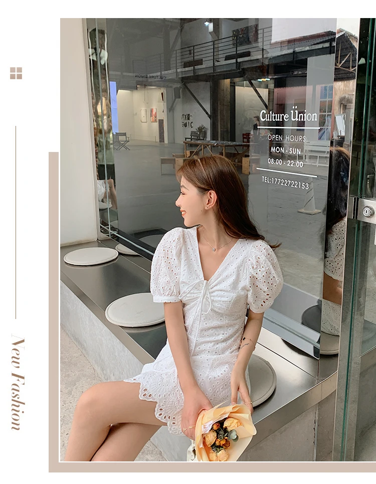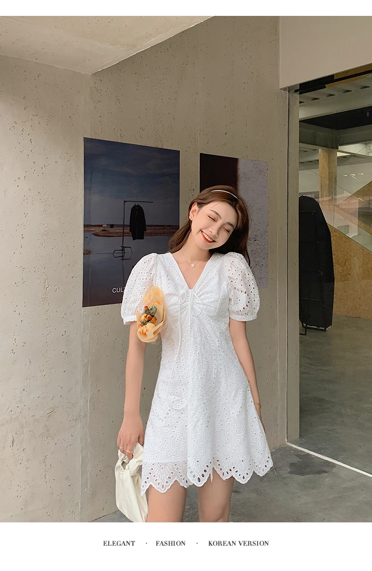 2021 New Korean Fashion Casual Summer Dress Women Sexy Drawstring V-Neck Lace Hollow Out White Mini Dresses Party Vestidos