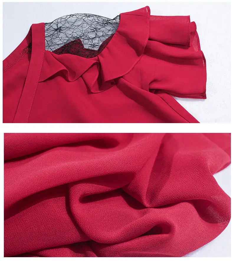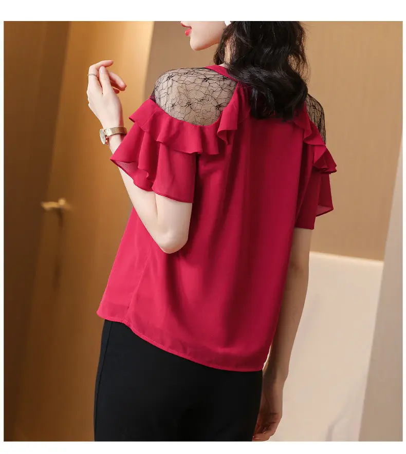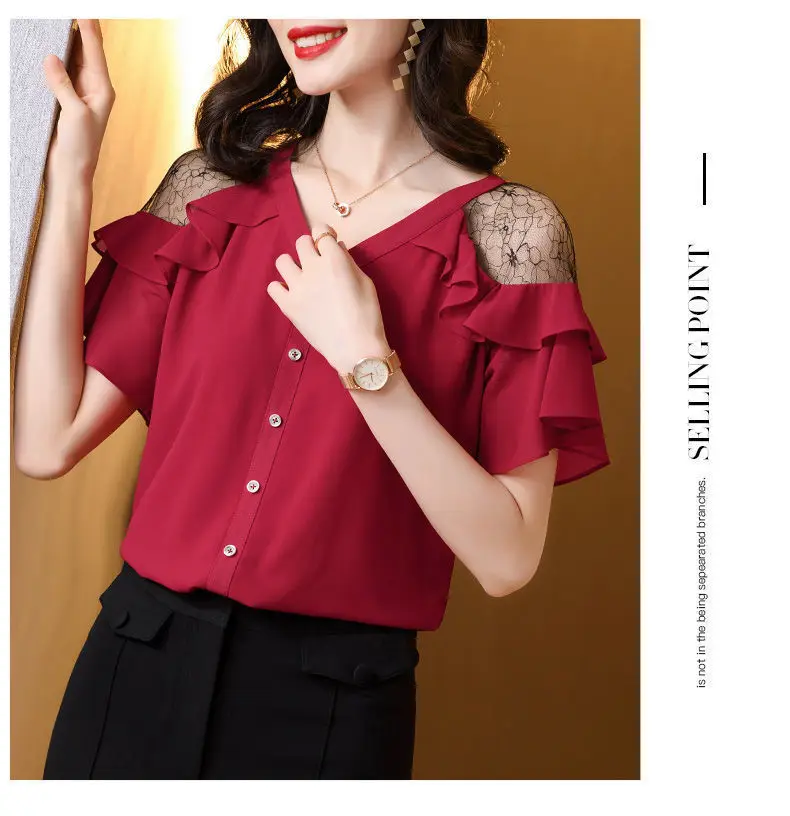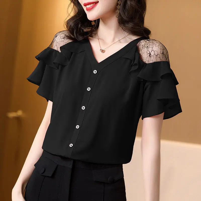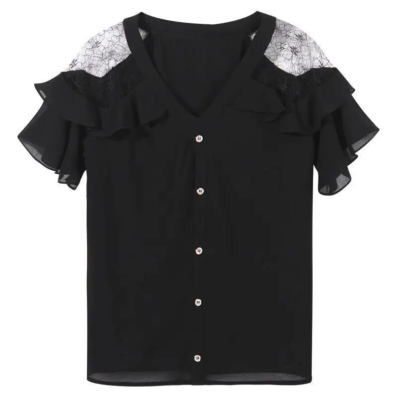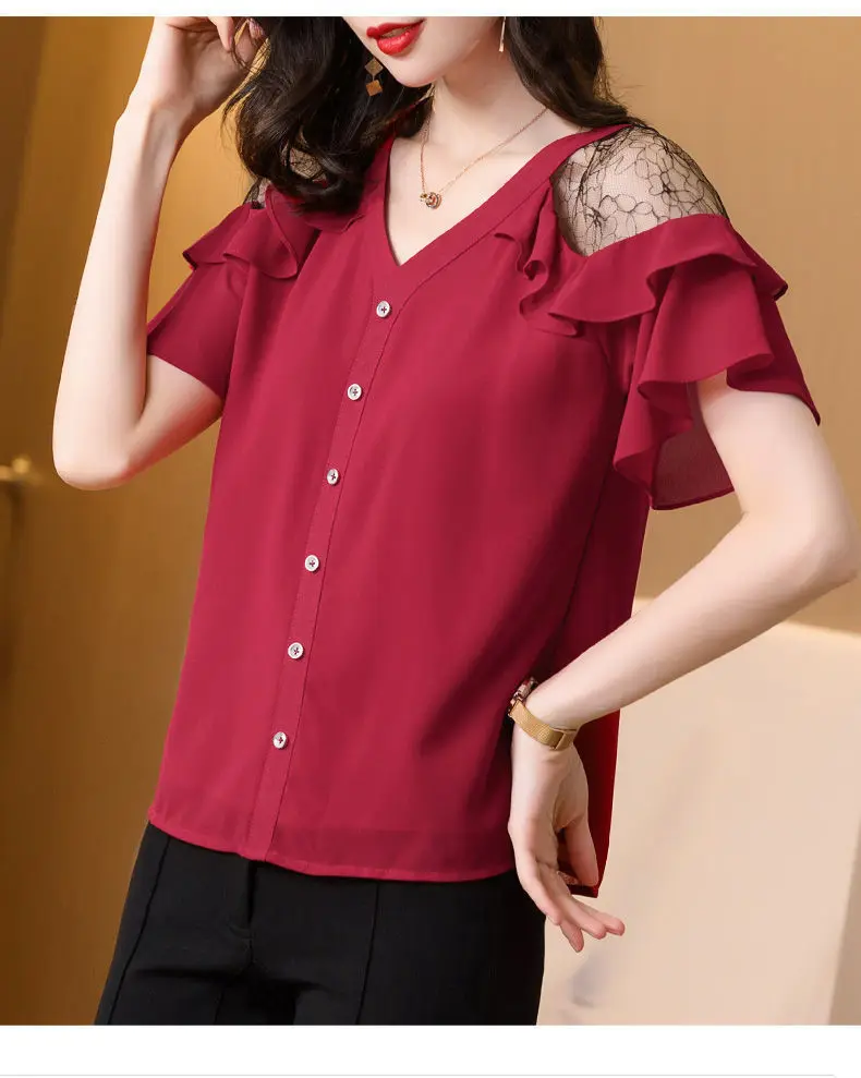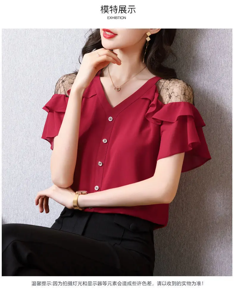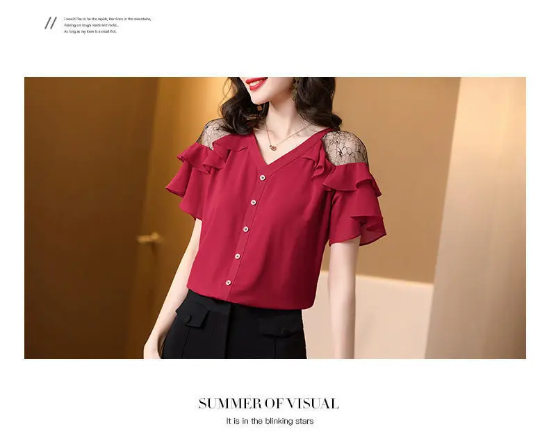 2021 New V-Neck Women Shirt Summer All-Match Short Sleeve Chiffon Top Solid Single Breasted Decoration Strapless Female Blouse