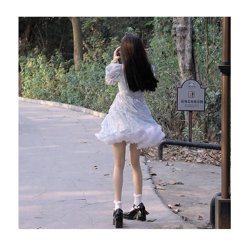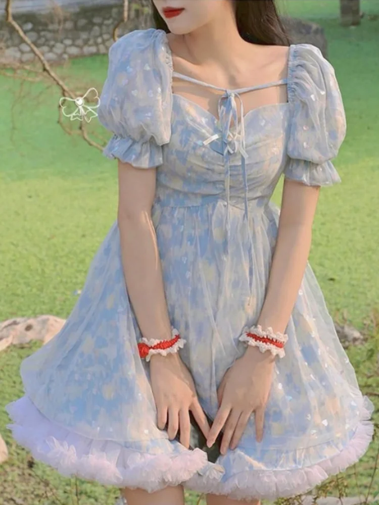 2021 Print Sweet Kawaii Mini Dress Women Japanese Vintage Cute Blue Lace-up Dress French Princess Sequin Puff Sleeve Fairy Dress