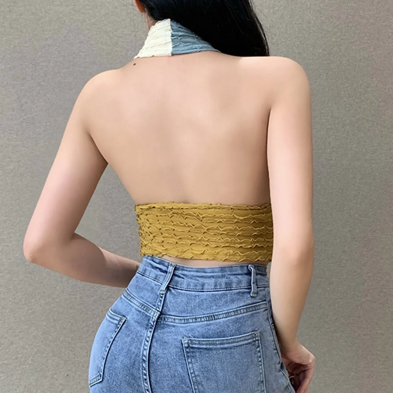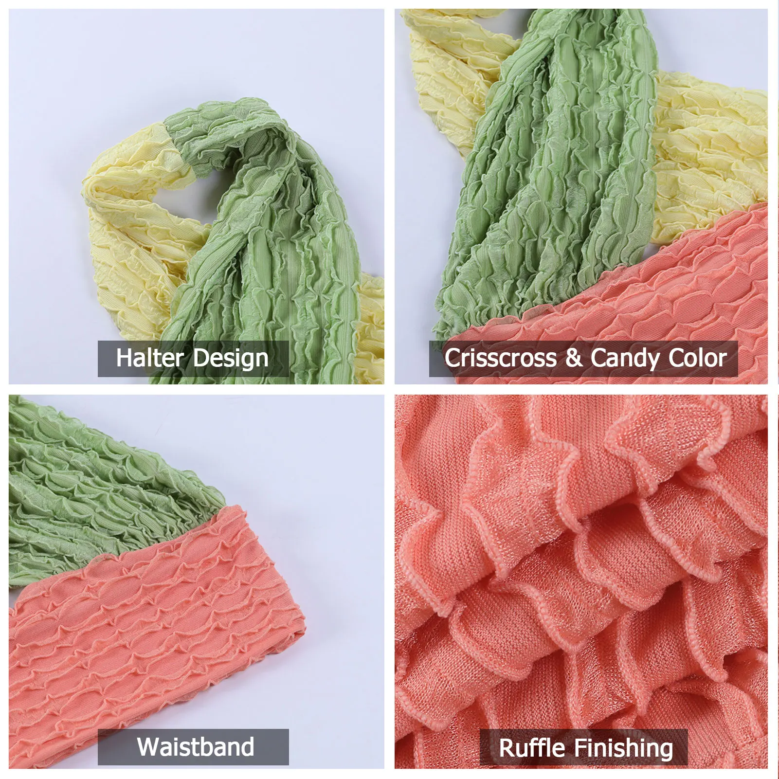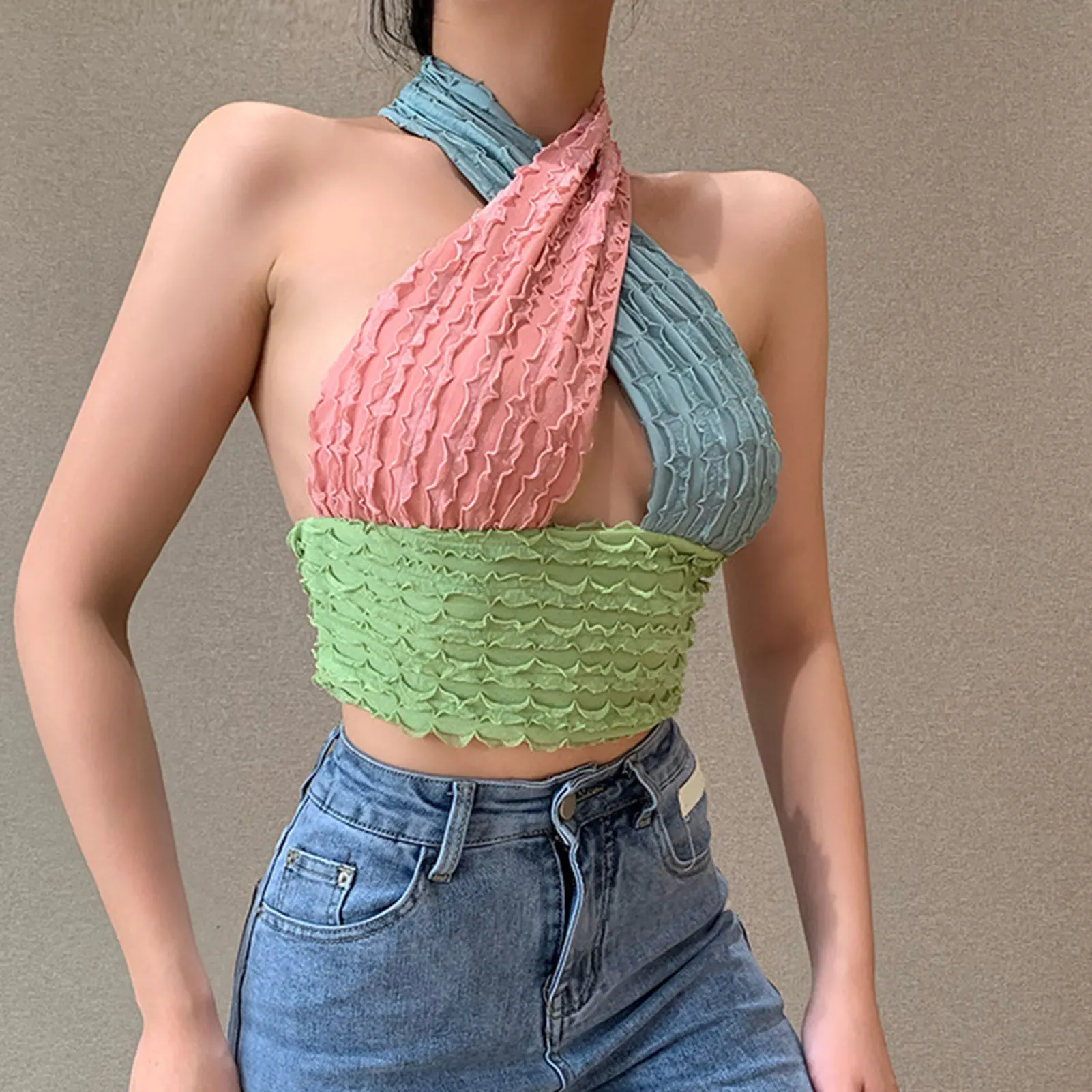 This halter vest in ruffle finishing features 3 different color blocks, a hollow chest, and a backless design, stylish and sexy for summer wear, beach, holiday, party. Put it on to be the most radiant girl in the crowds.