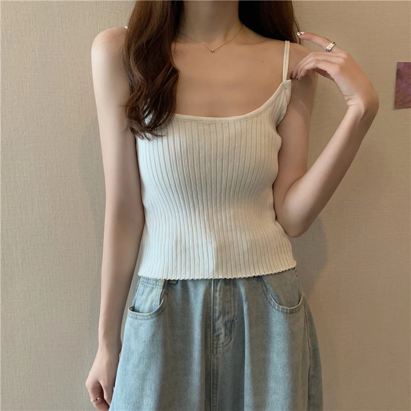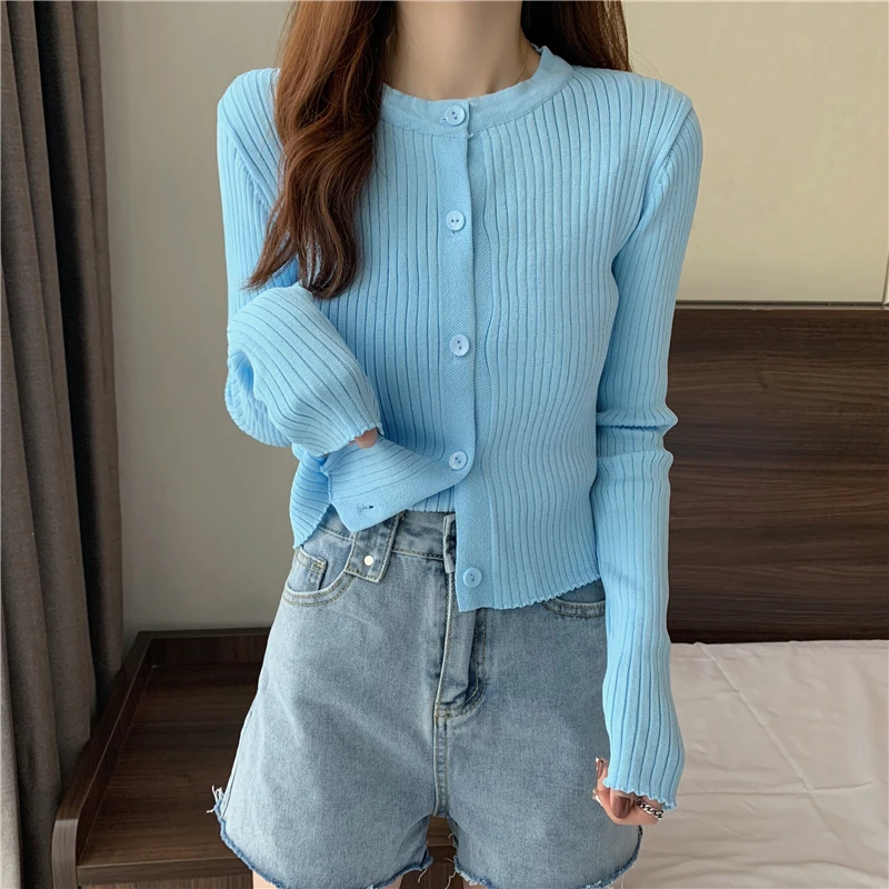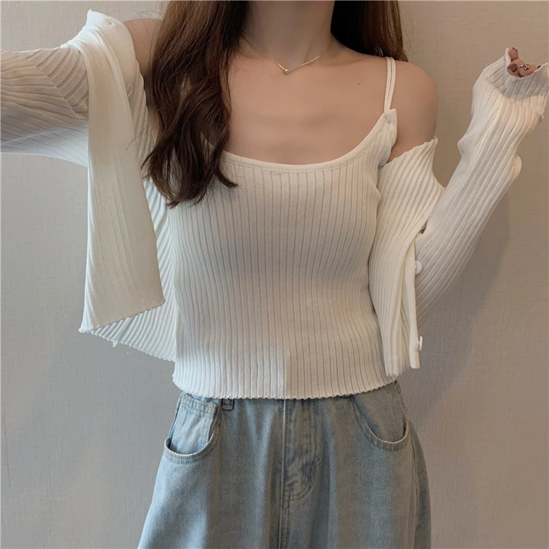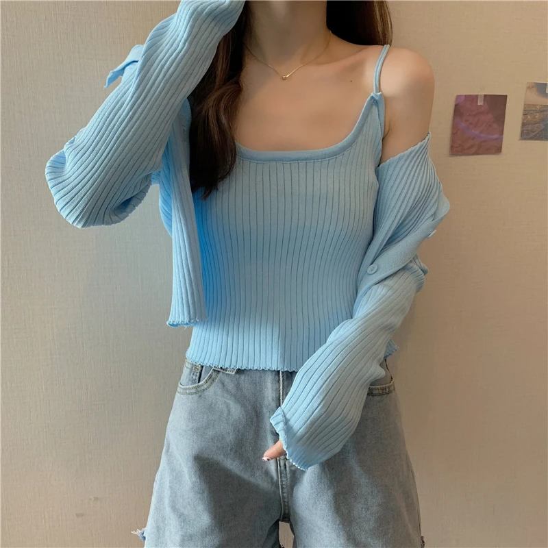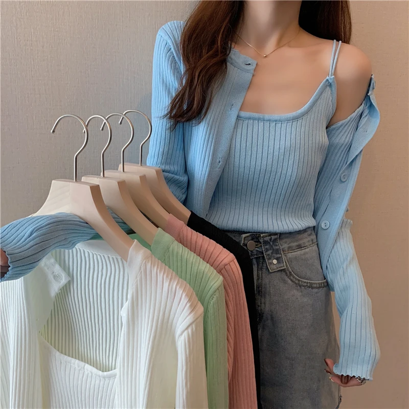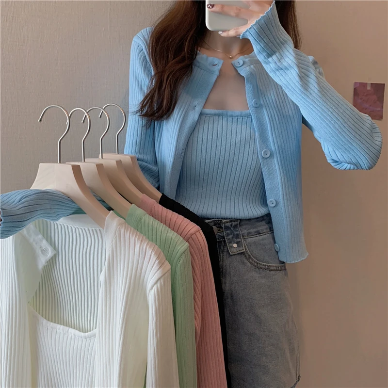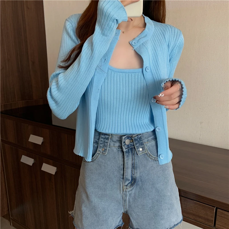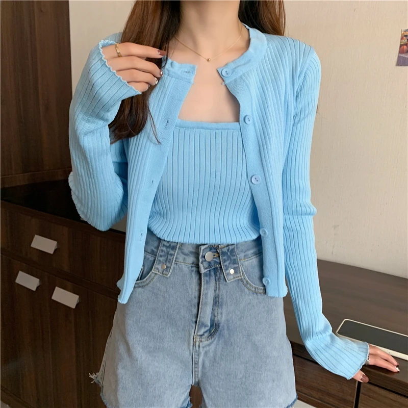 2021 Spring Knitted Suit Casual Fashion Single-Breasted Long-Sleeve Cardigan And Short Sling Vest Two-Piece Set Femme