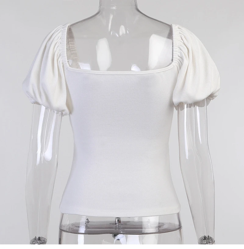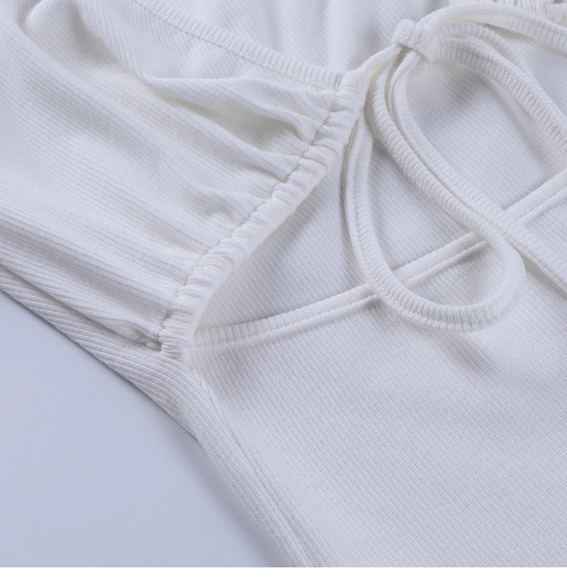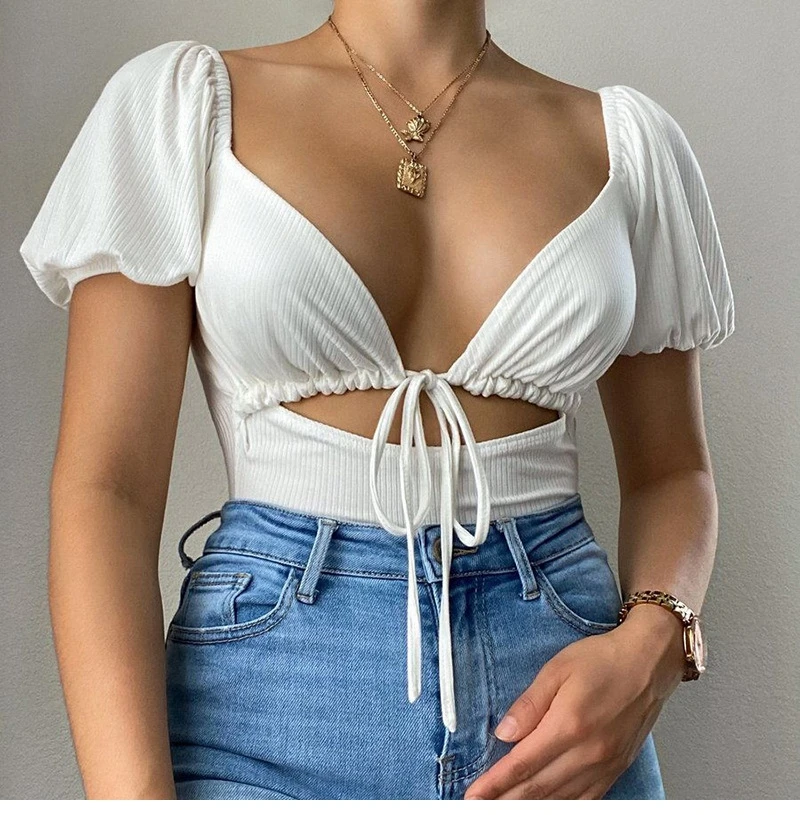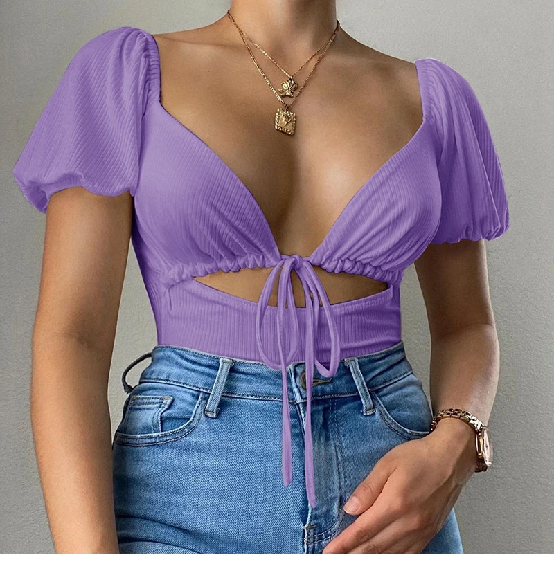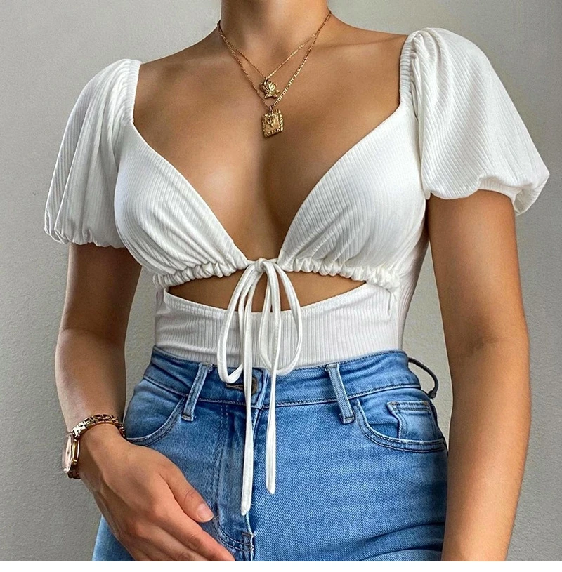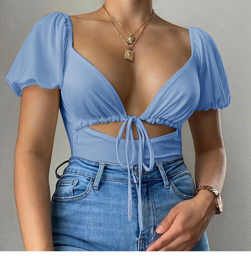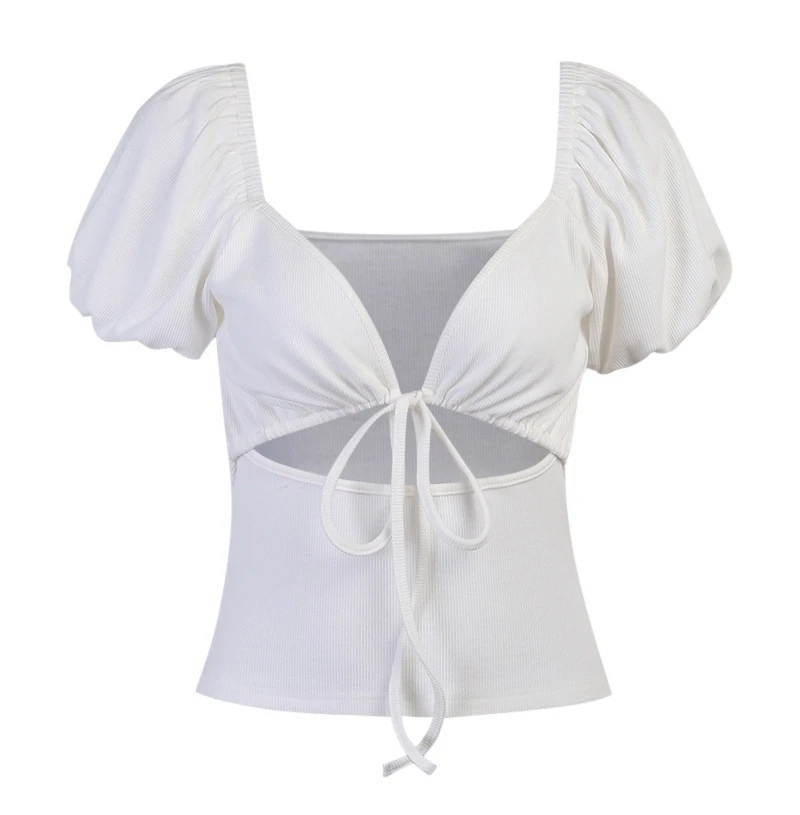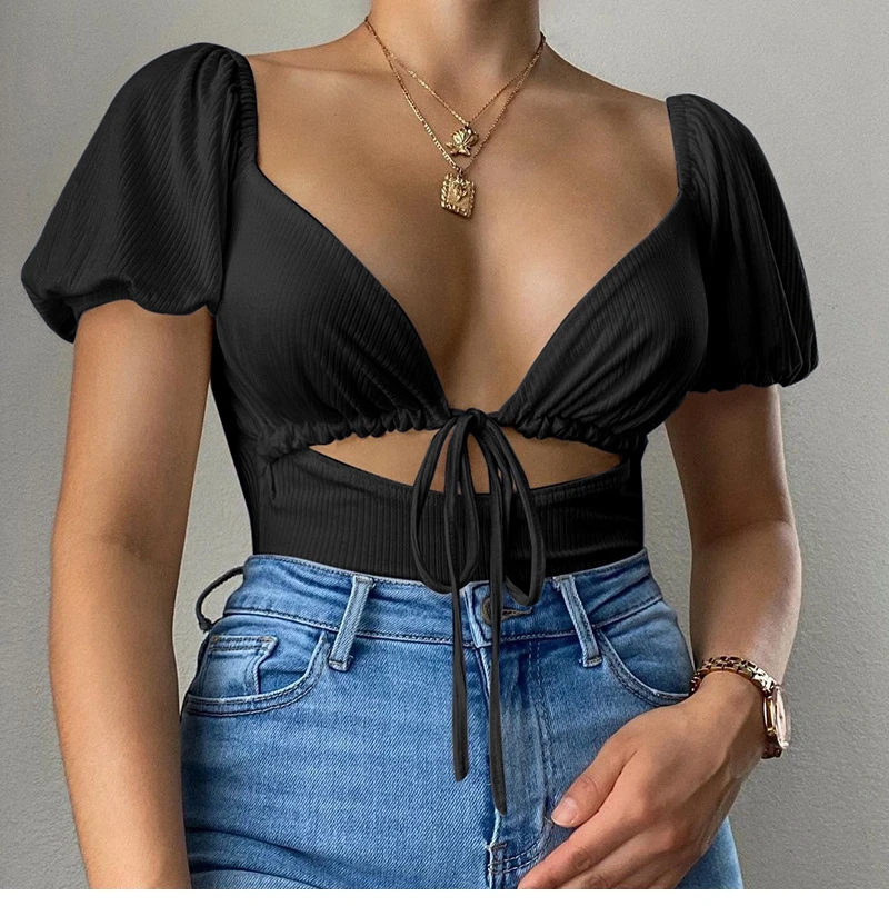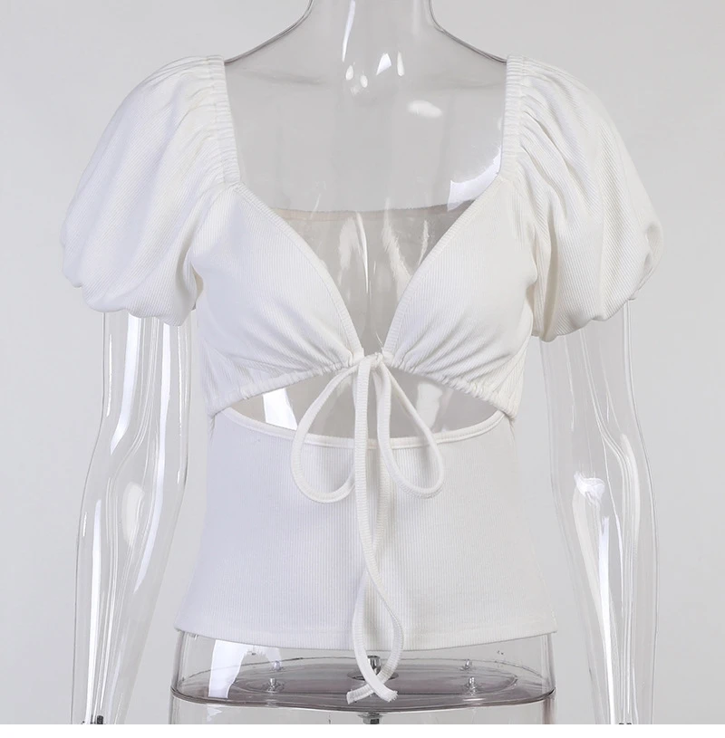 2021 Summer Fashion New Personality V Neck Hollow Beautiful Drawstring Bubble Short Sleeved Tie Short Women's Top