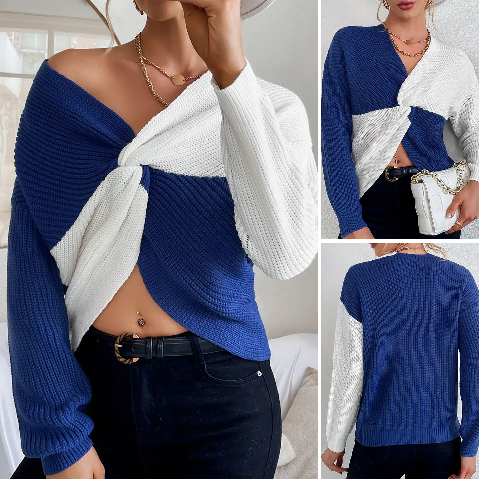 Have this sexy and stylish knitted pullover to make a chic ensemble. Splicing color makes it cool in the crowds. Twisted front showed V neck and waist curves. Have it pair skinny pants.
