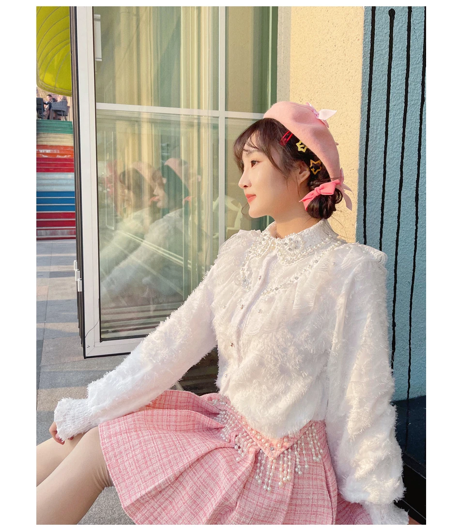 2022 Sweet Kawaii Pink Mini Skirts Women High Waist Schoolgirl Lolita Pleated Skirt Fresh Beading Pearl Short Jupe Cute Spring
