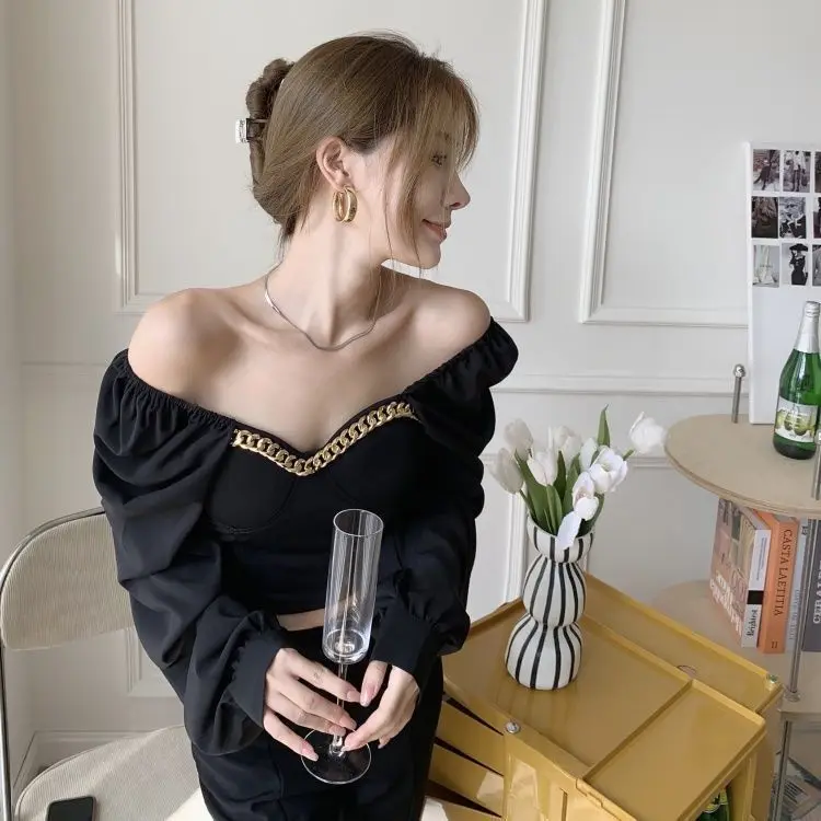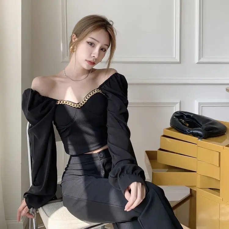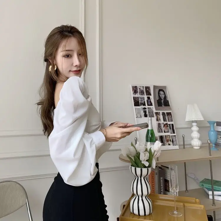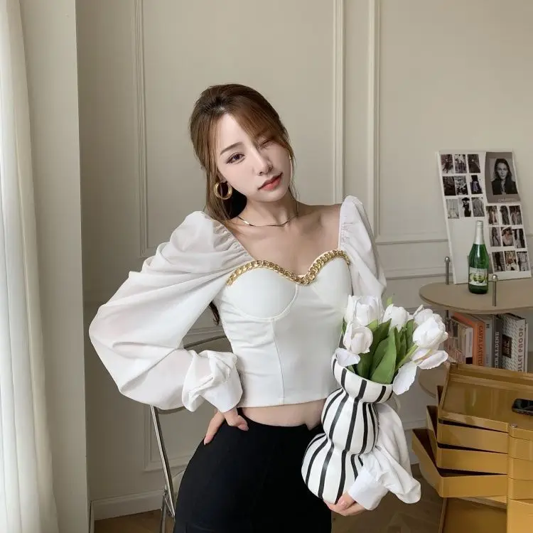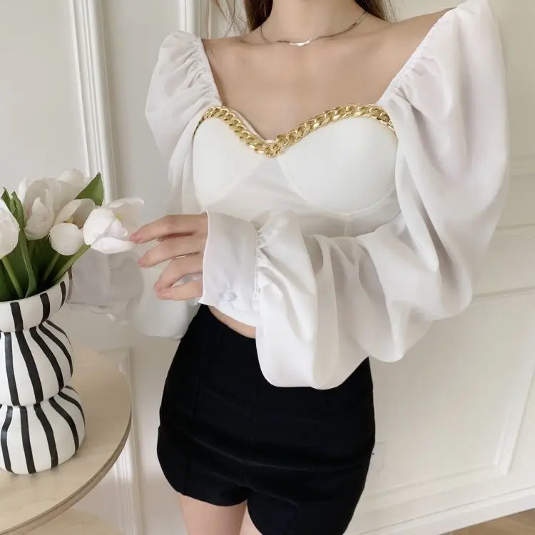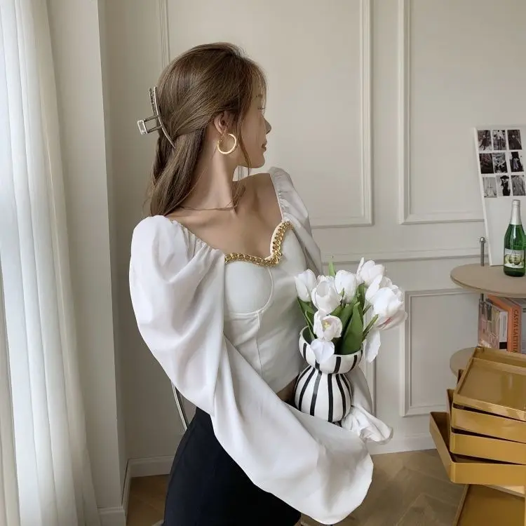 Atumn Y2K Chiffon Blouse Shirt Women Long Sleeve White Sexy Elegant Crop Tops Female Casual High Street Elegant Korean Tops 2021
