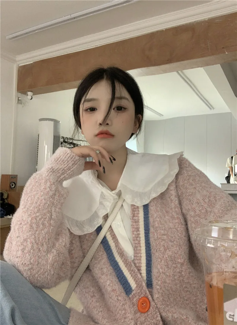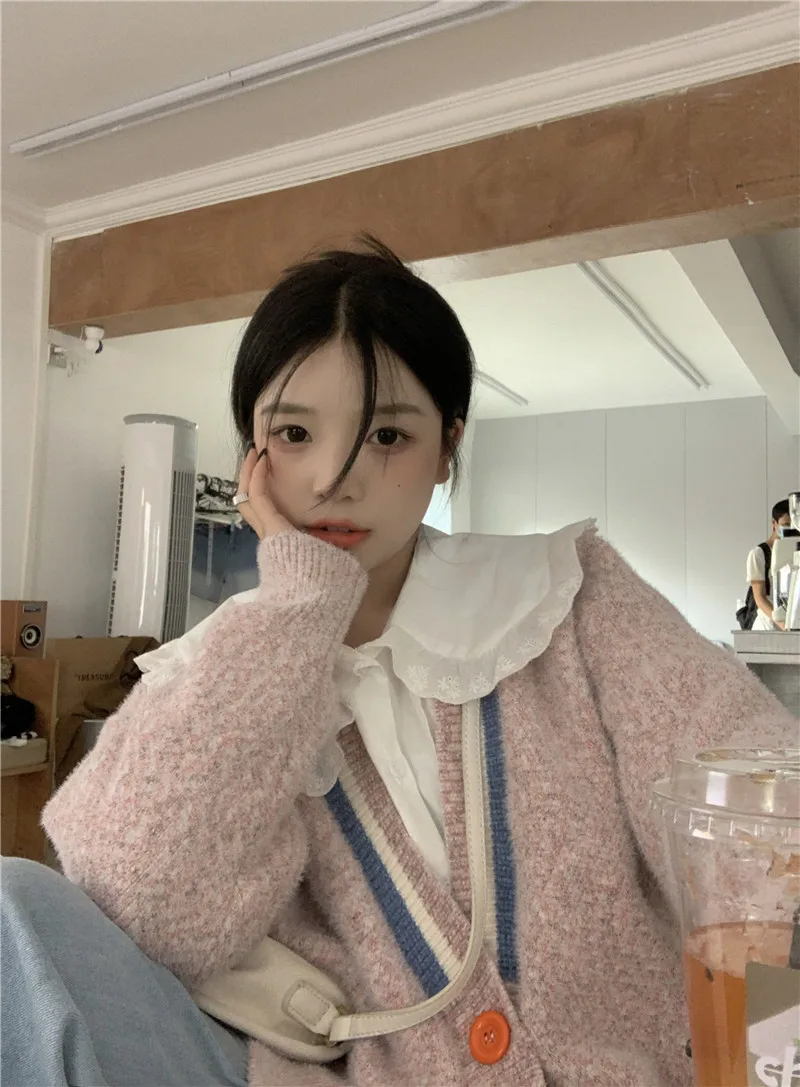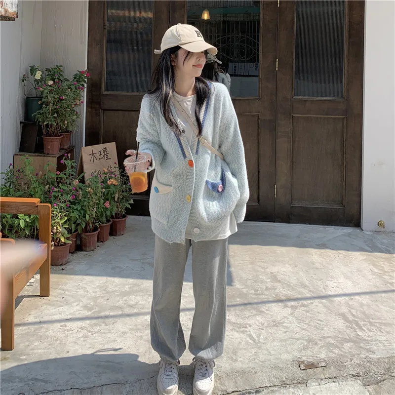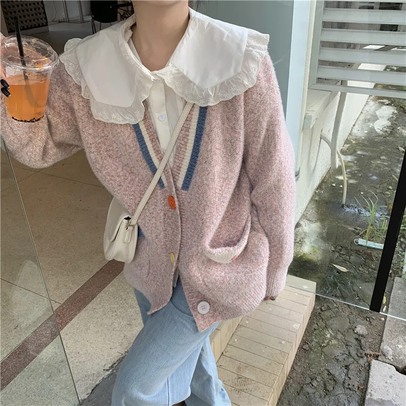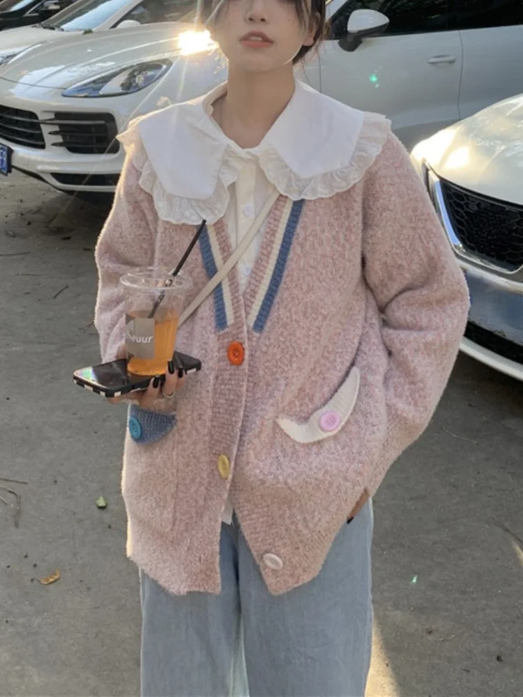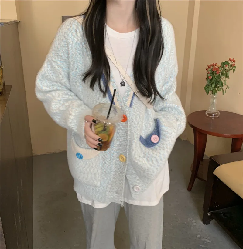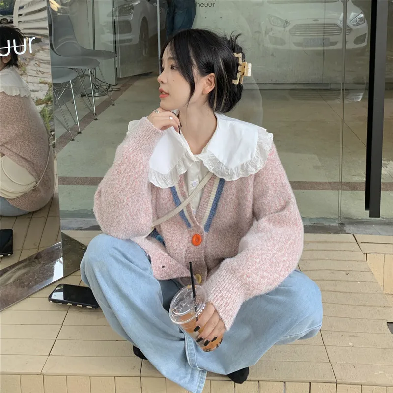 Autumn Casual V-neck Knitted Cardigan Women Colour Button Long Sleeve Sweater Korean Fashion Loose Elegant Designer Coat 2021