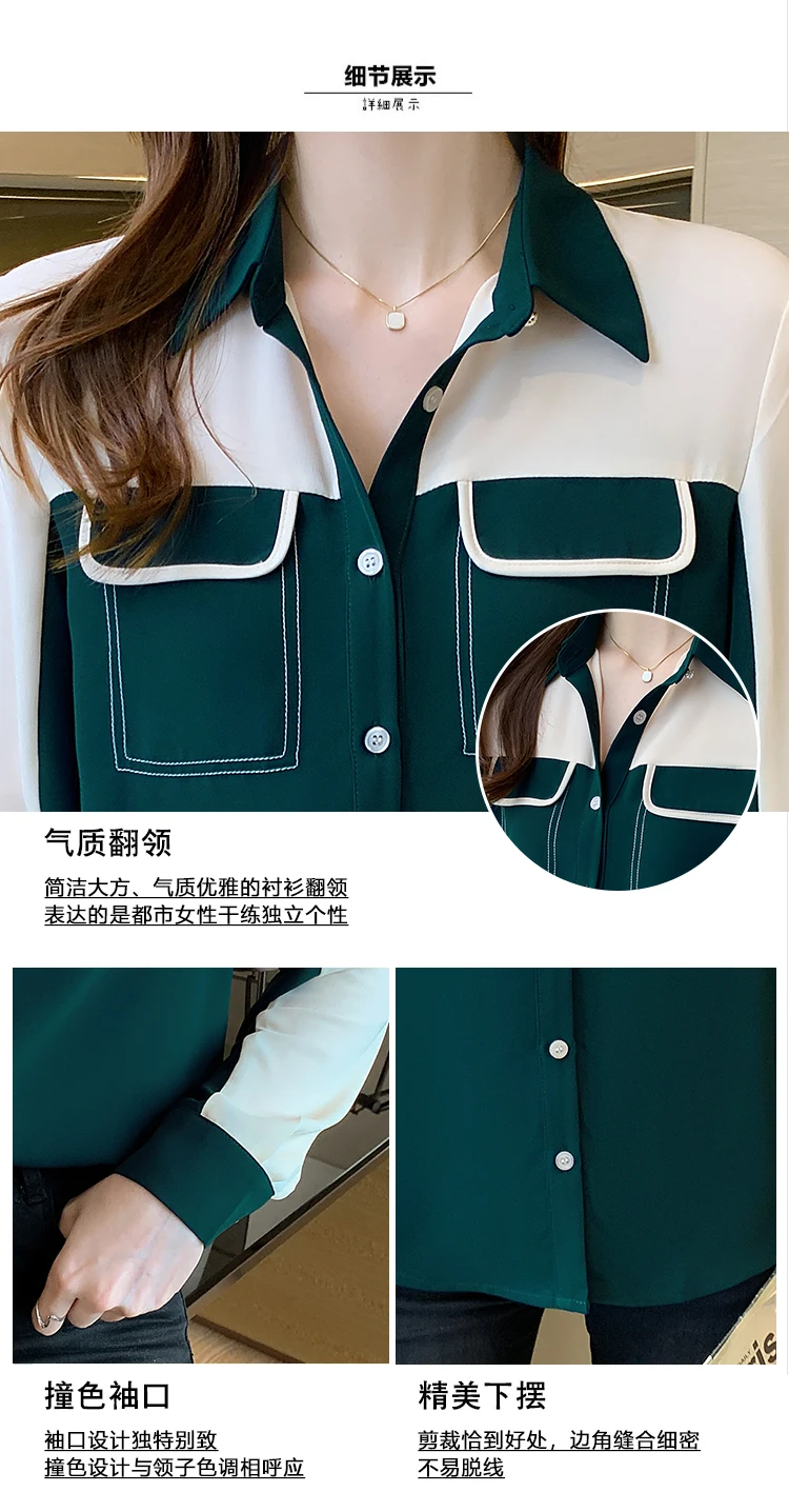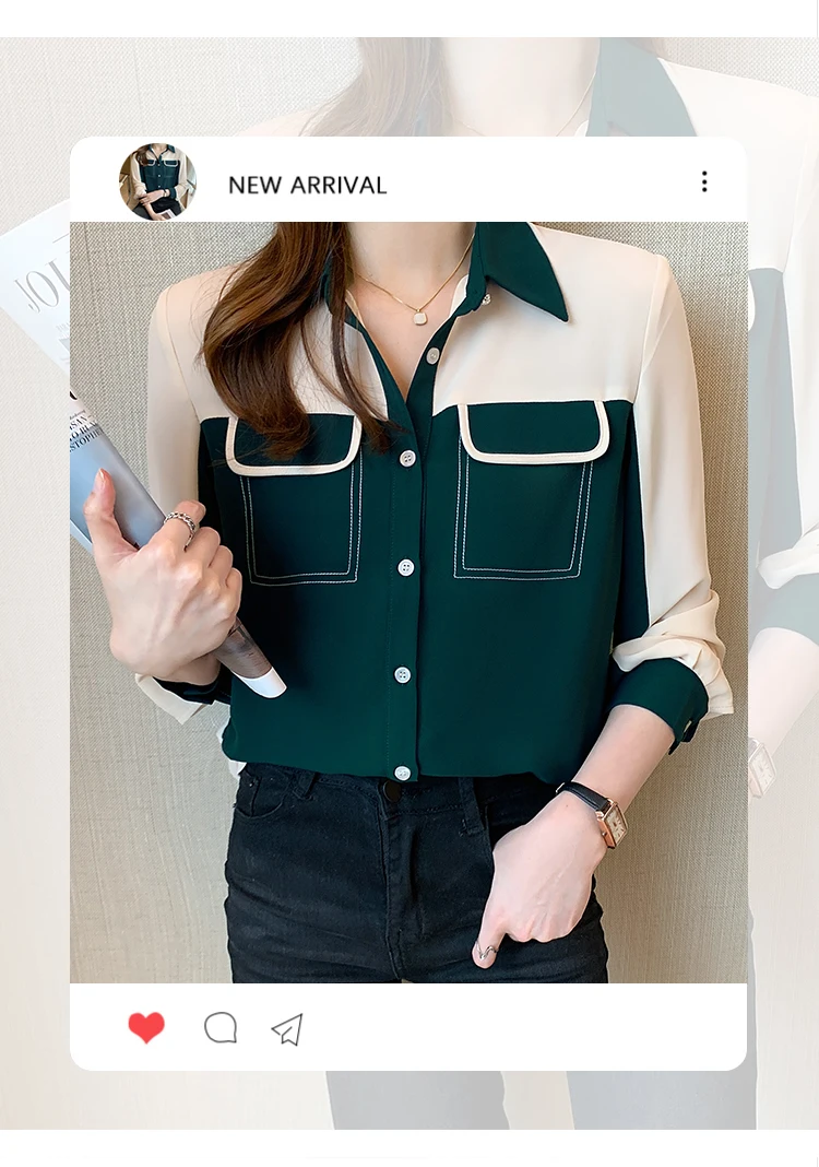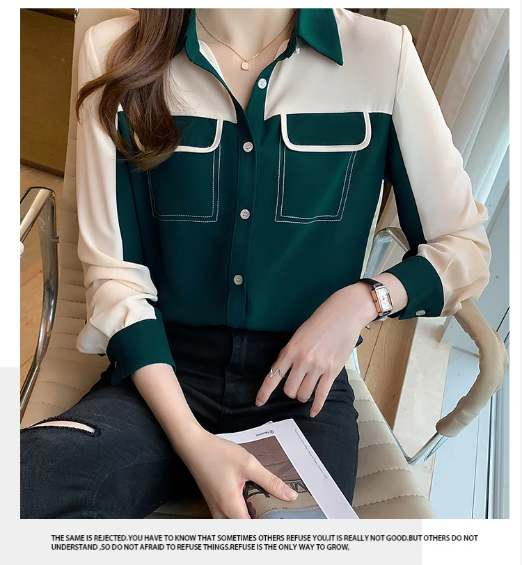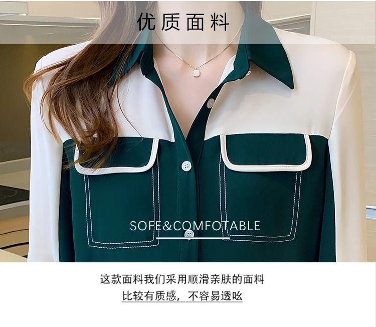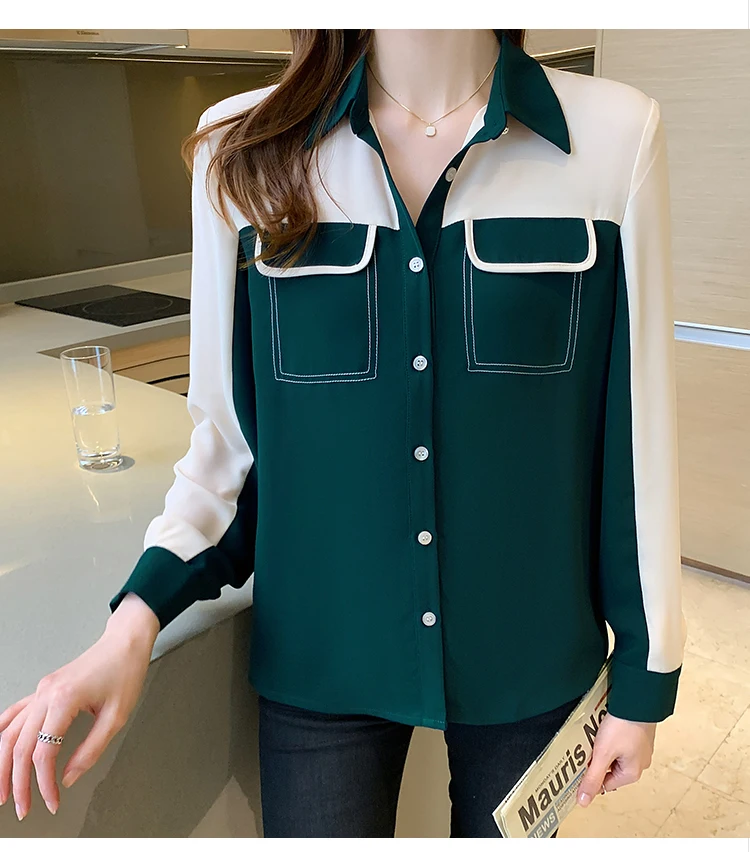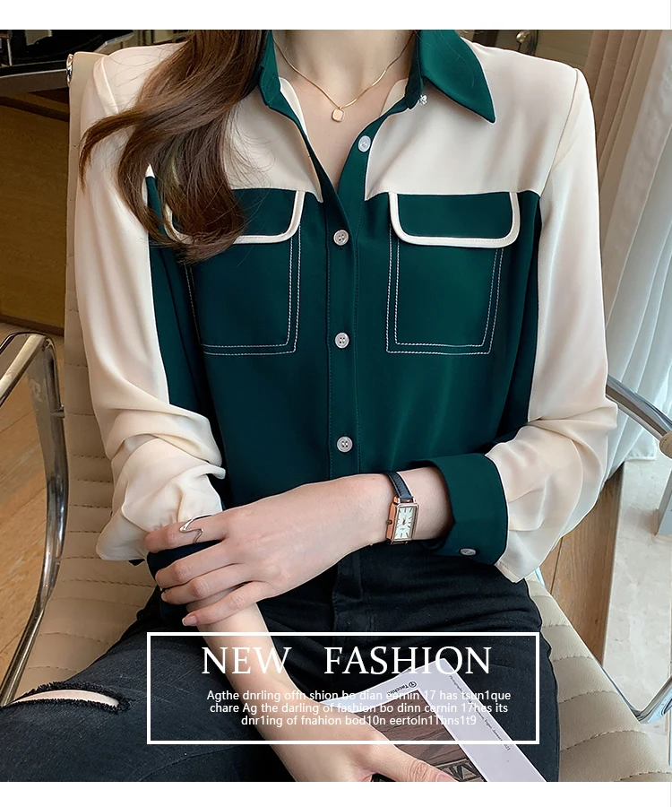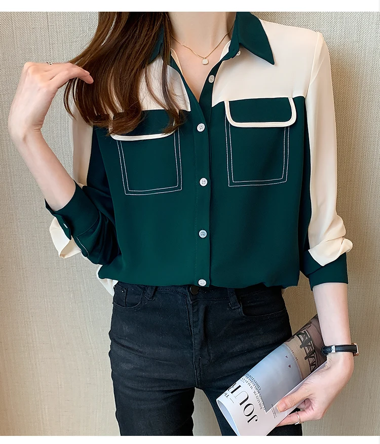 2021 Autumn New Korean Blouses Temperament Long-Sleeved Chiffon Shirt Women's Tops Fake Pocket Office Lady Clothing