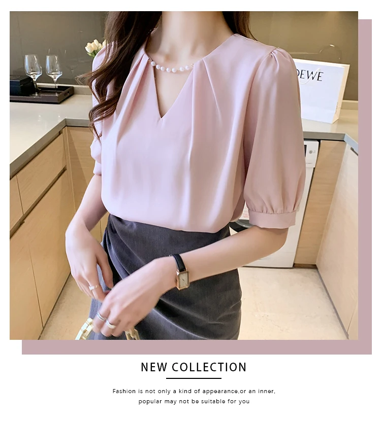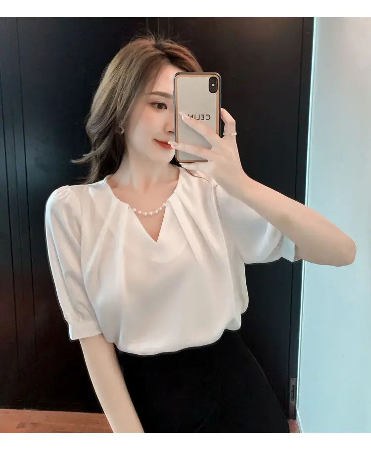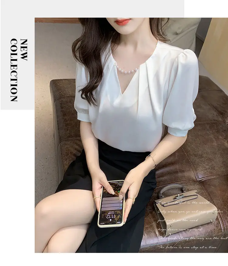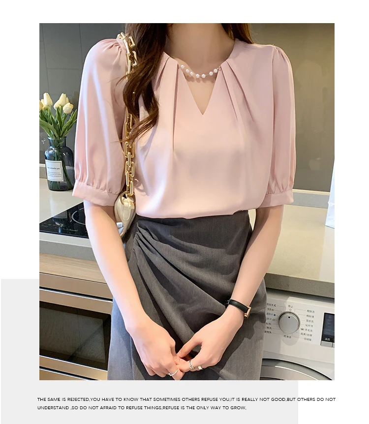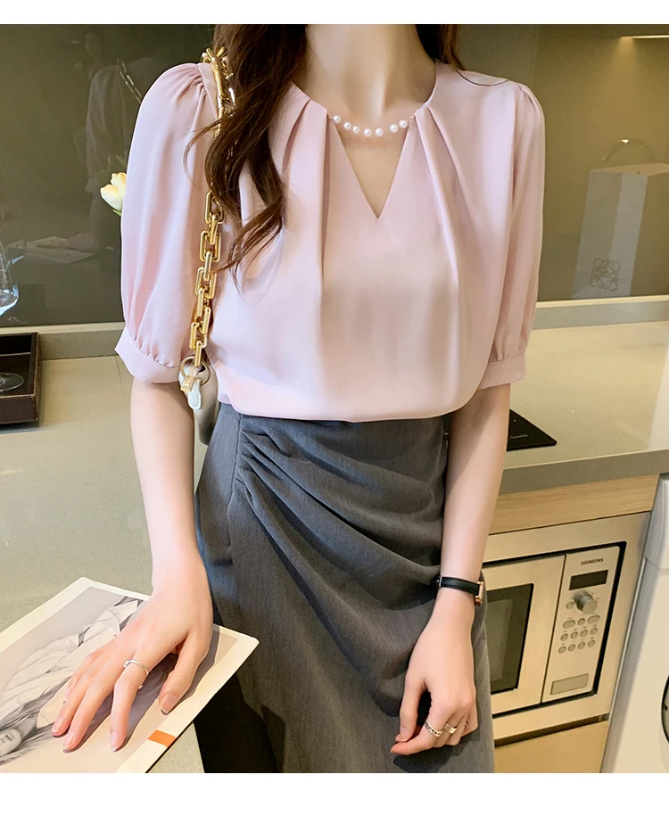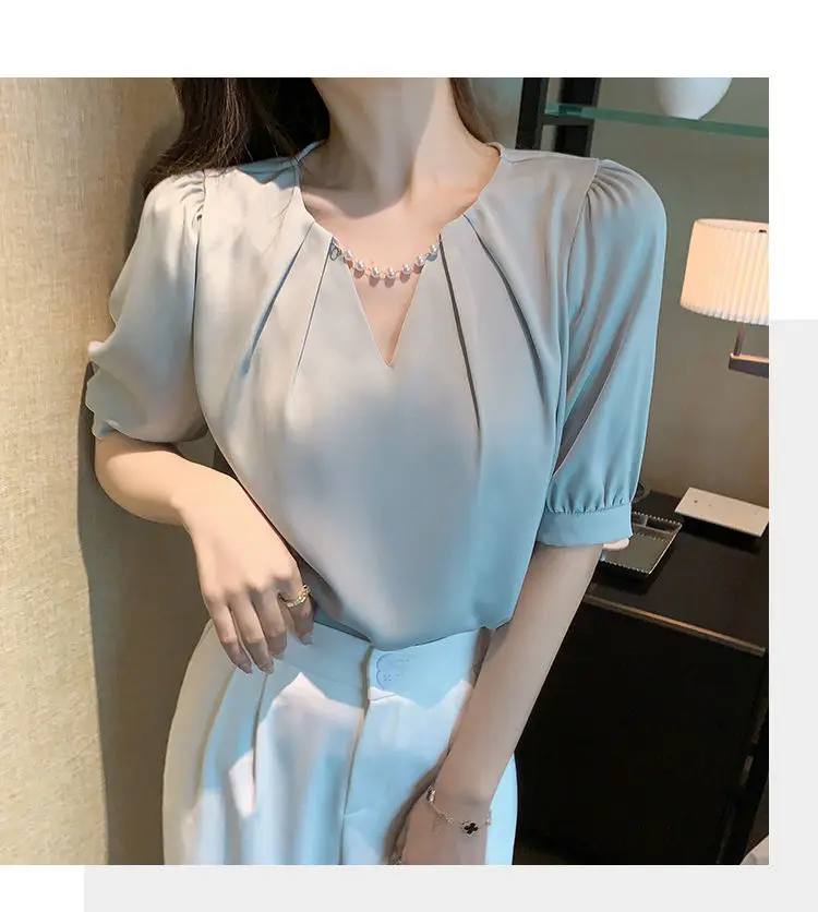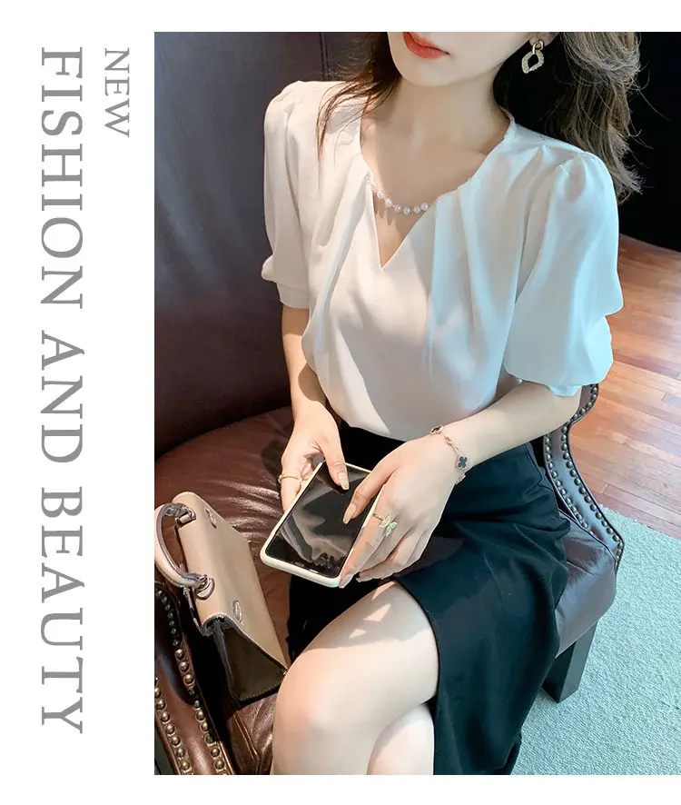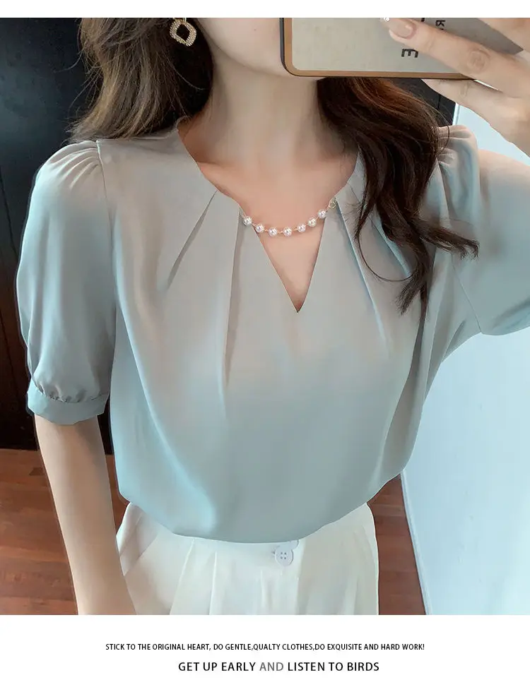 2021 New Summer Women Blouses Casual Loose Half Sleeve V-Neck Beading Chiffon Shirts Fashion Elegant Office Lady Tops Clothing