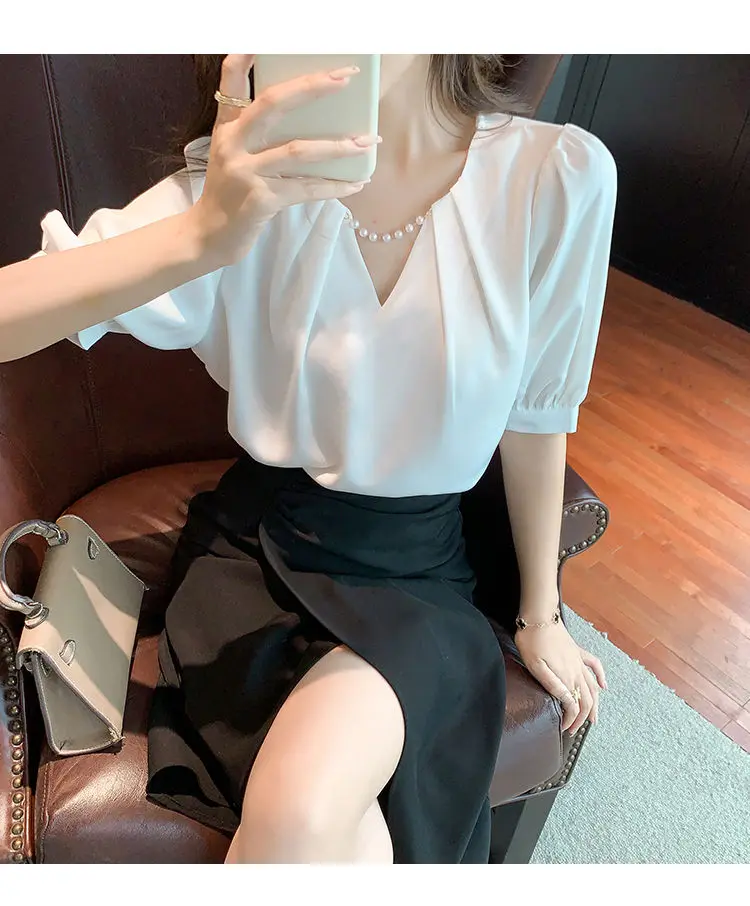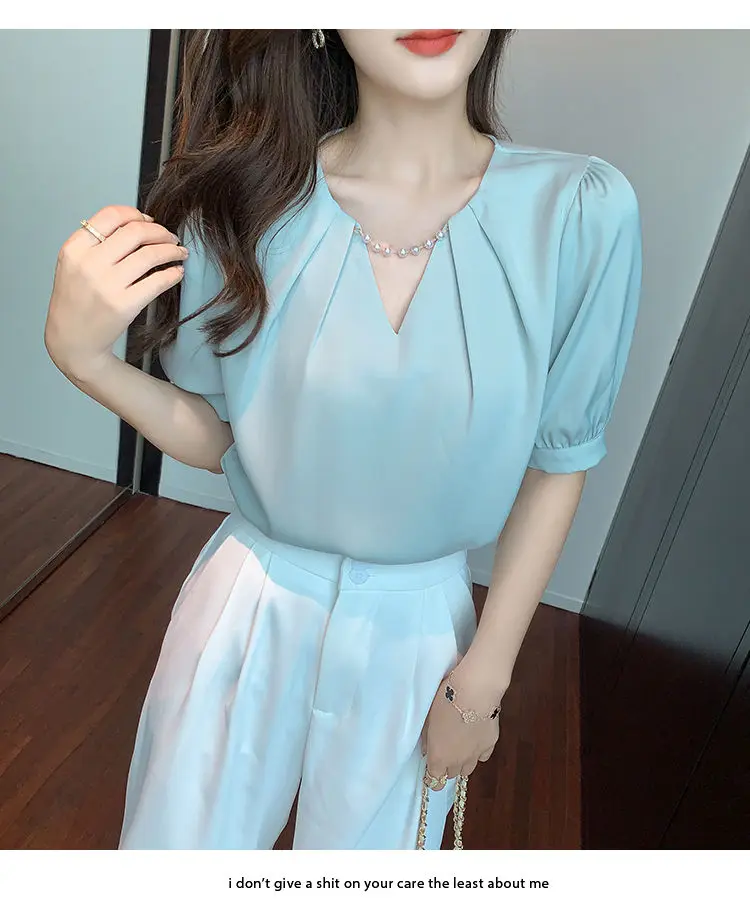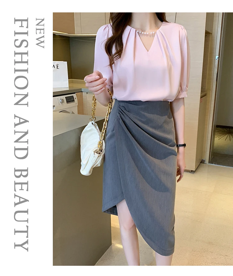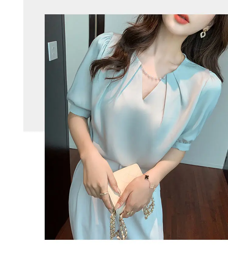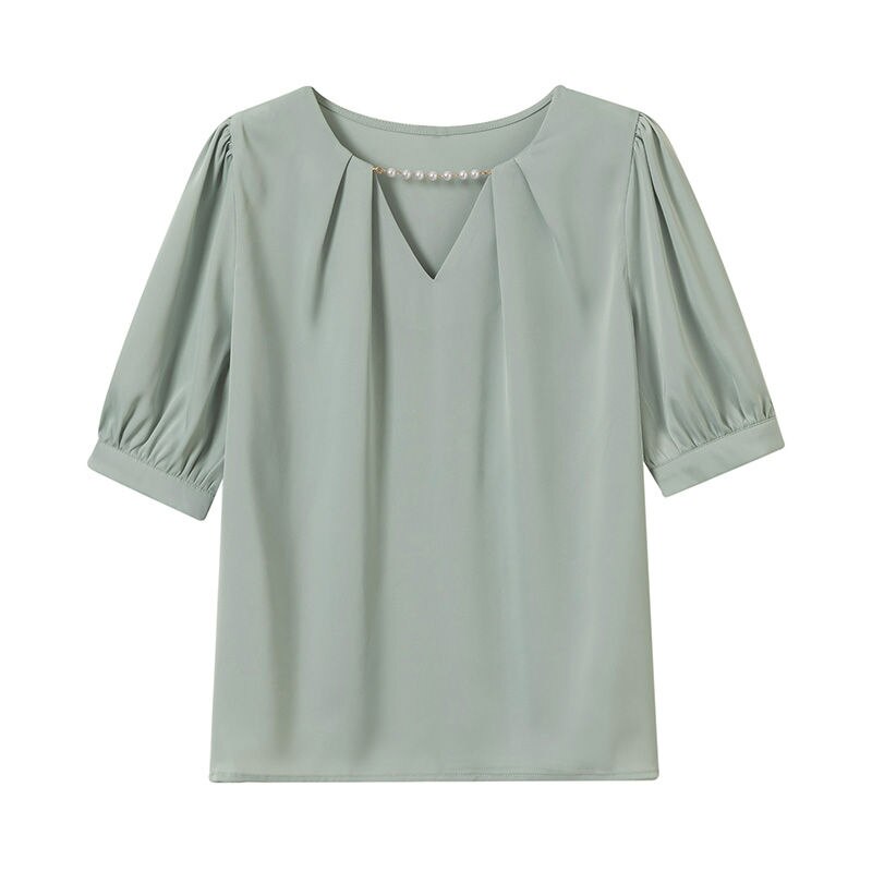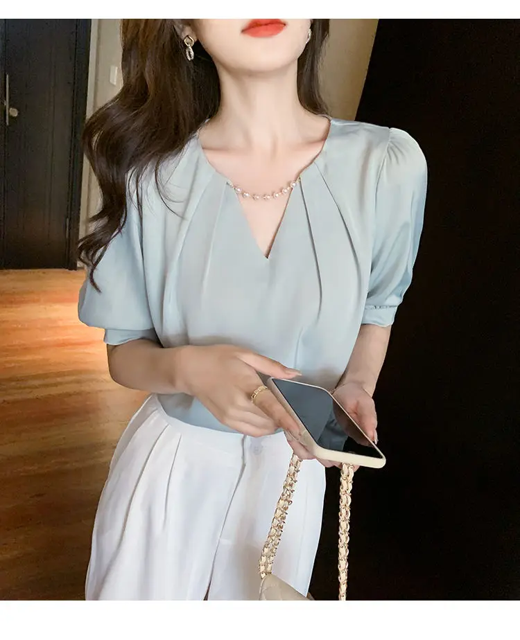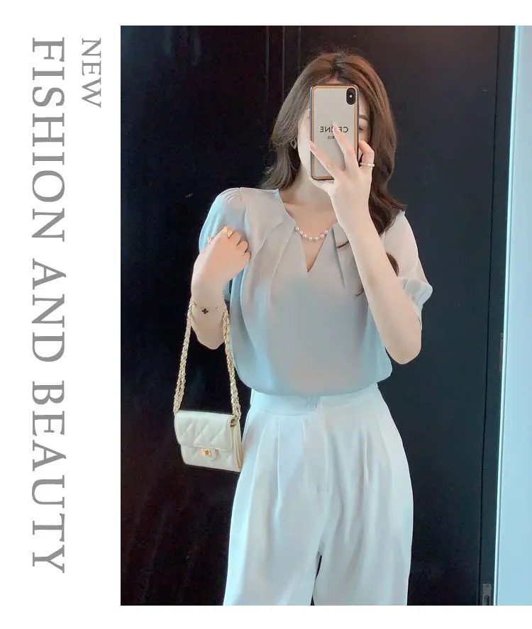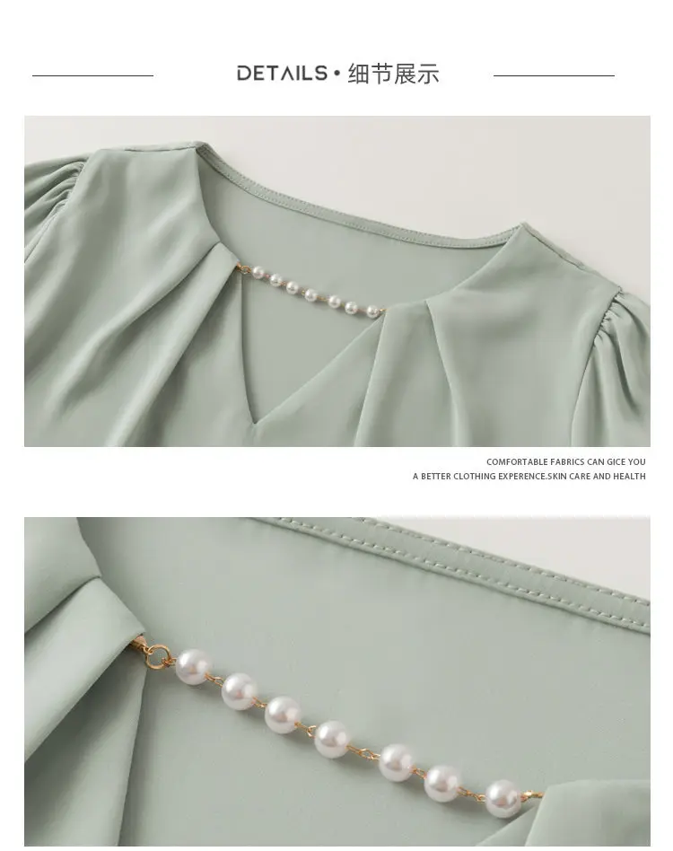 2021 New Summer Women Blouses Casual Loose Half Sleeve V-Neck Beading Chiffon Shirts Fashion Elegant Office Lady Tops Clothing