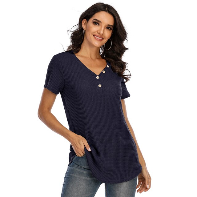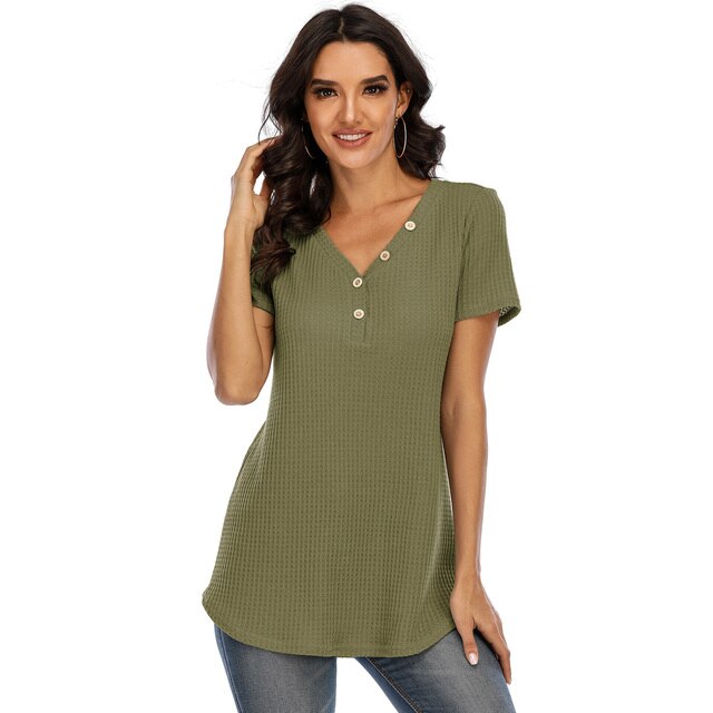2021 Women Summer T-shirt Waffle Tops Fashion Sexy V-Neck Solid Tee Tops New Female Casual T-shirts Mujer Chic Tops