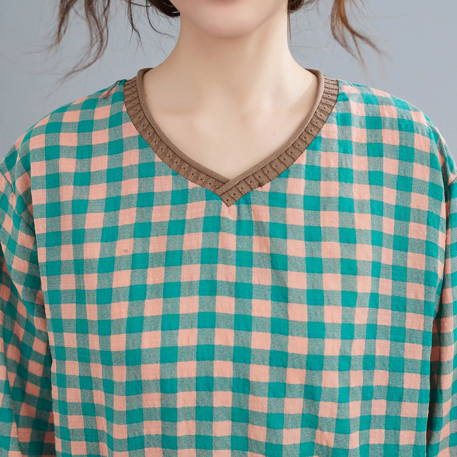 Oversized blouse with knitted trims, V-neck, long sleeves and two pockets, brings a vintage style for pairing jeans or wide legs pants for home, holidays or streets.
