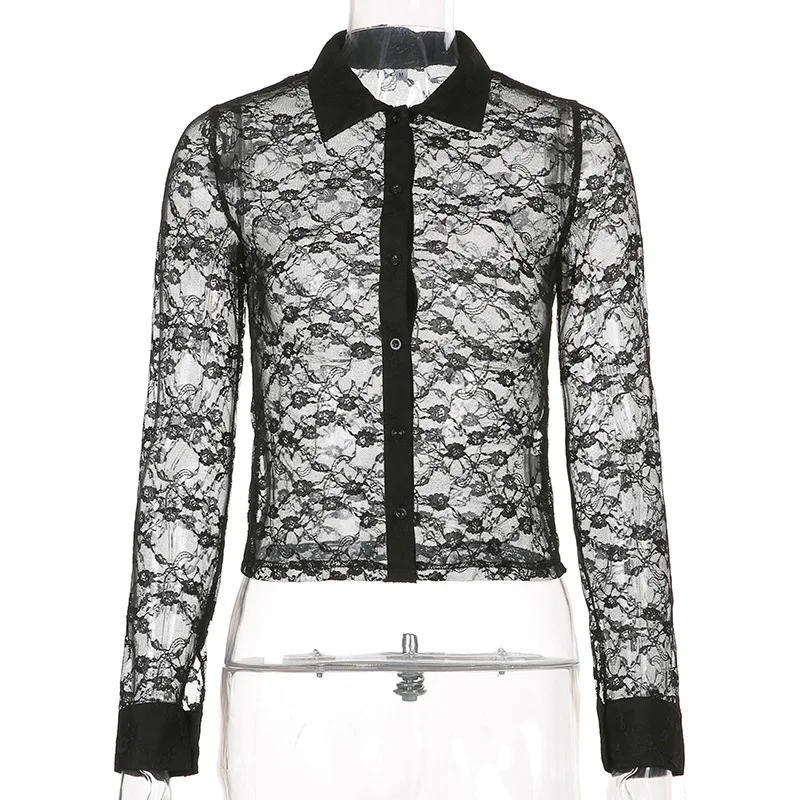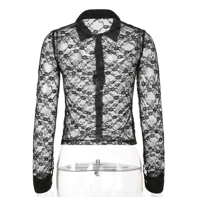 Black Lace Mesh Cropped Tee Shirt Women Summer Transparent Sexy Long Sleeve T-shirt Harajuku Gothic Casual Tshirts 2022 New