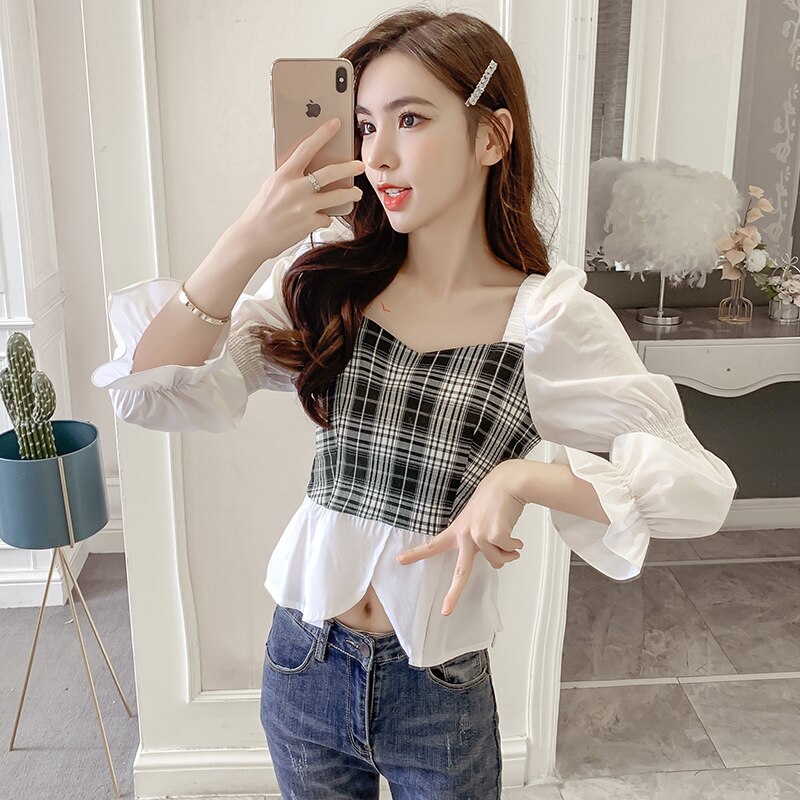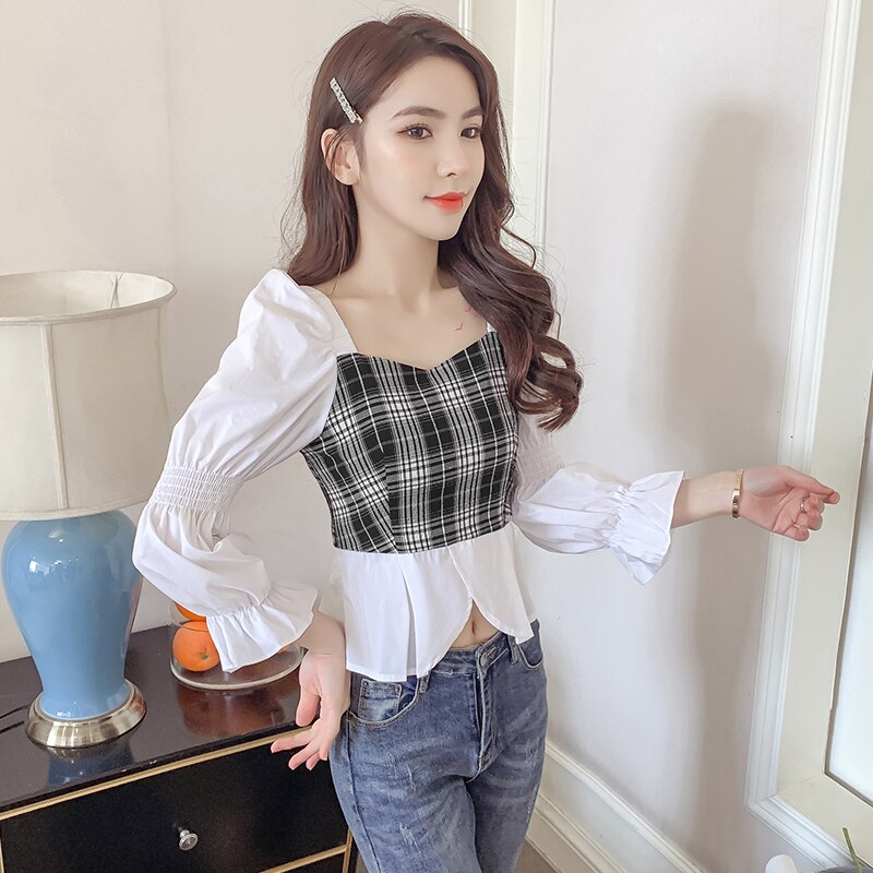 Product Name: Blouse Women Autumn 2021 New Office Lady Patchwork Plaid Long Sleeve Square Collar Thin White Blusas Womens Tops And Blouses