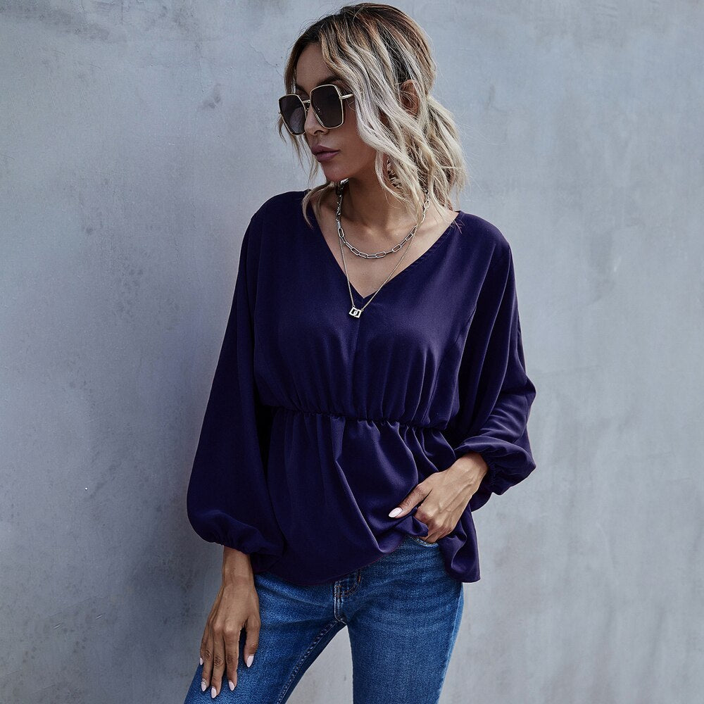 Casual Long Sleeve Shirt Blouse Woman Spring Fall Fashion V-neck Solid Shirts Top Femme White Elastic Waist Loose Women Clothing