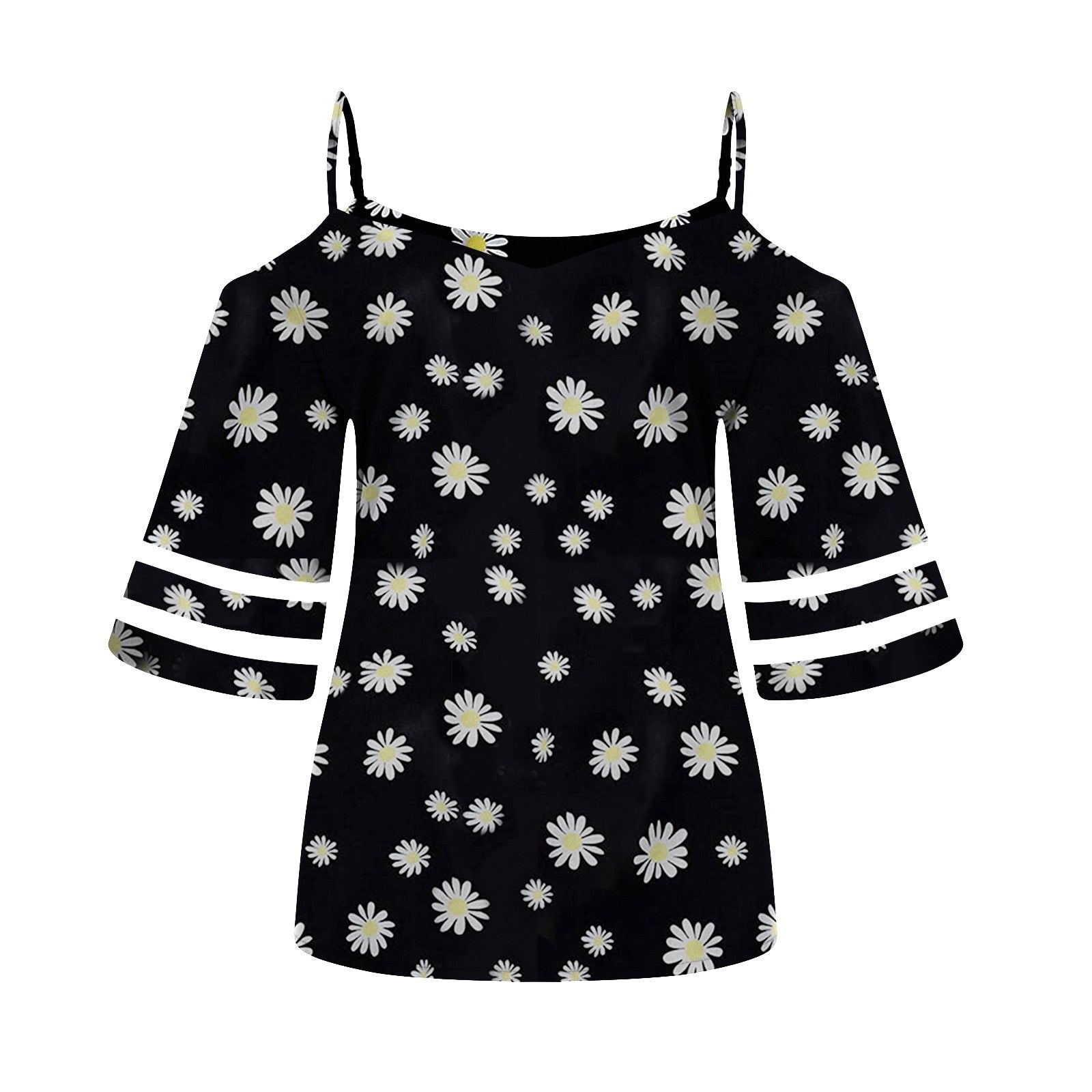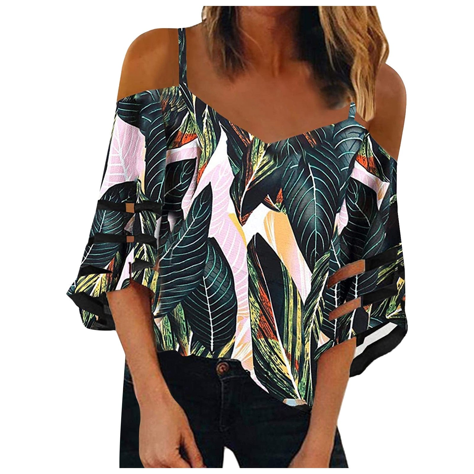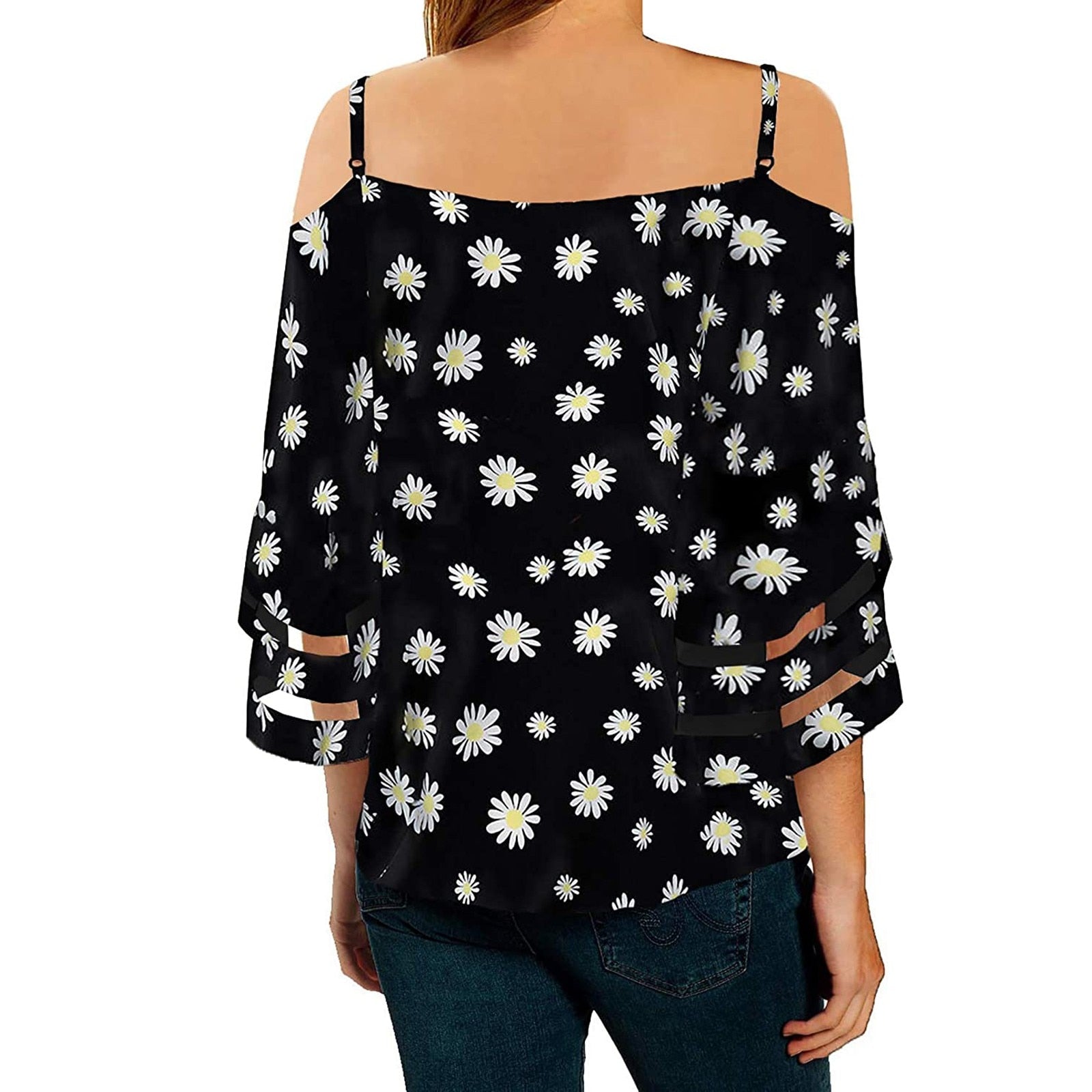 Women's V Neck Print Mesh Panel Blouse 3/4 Bell Sleeve Dew Shoulder Casual Tops