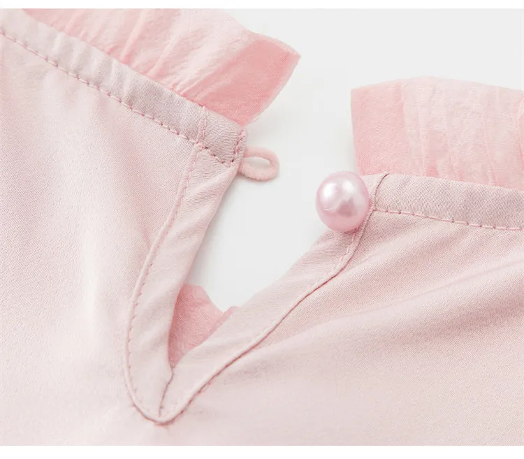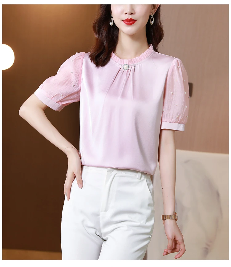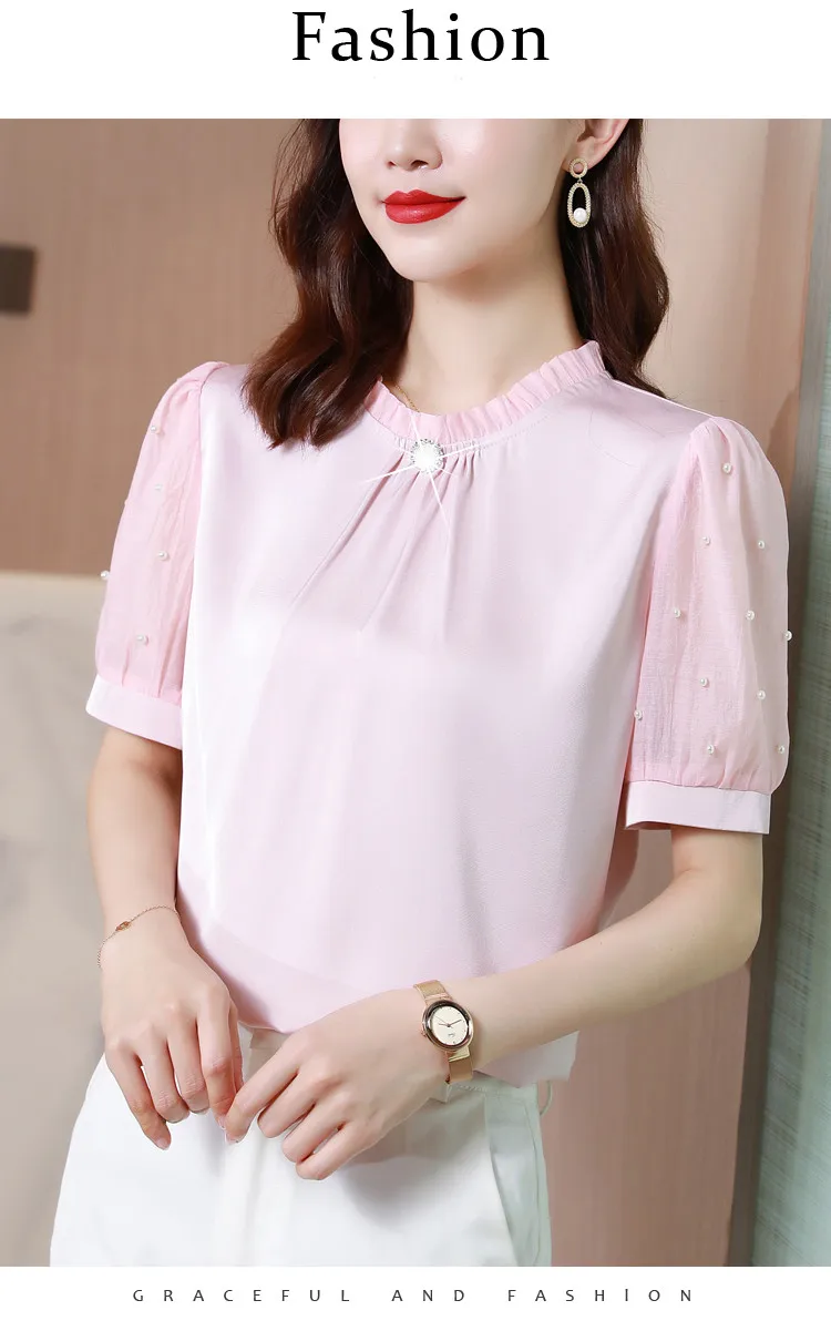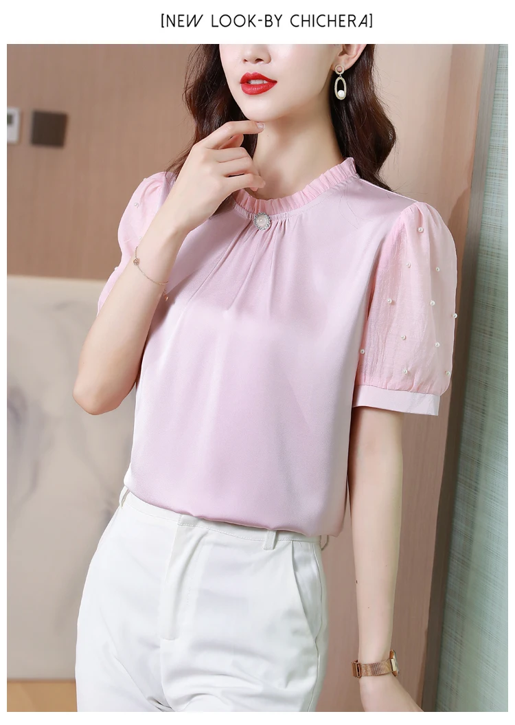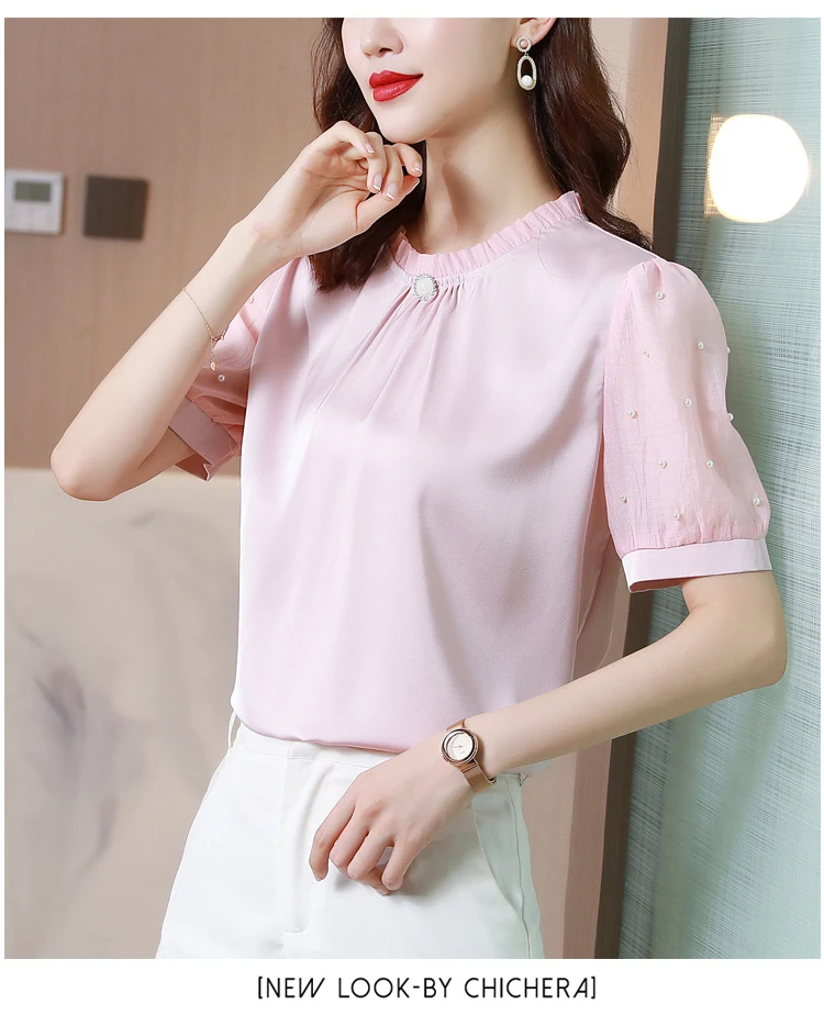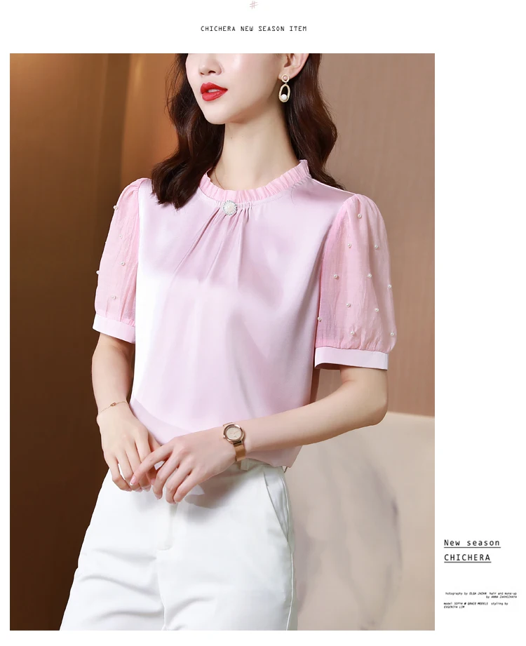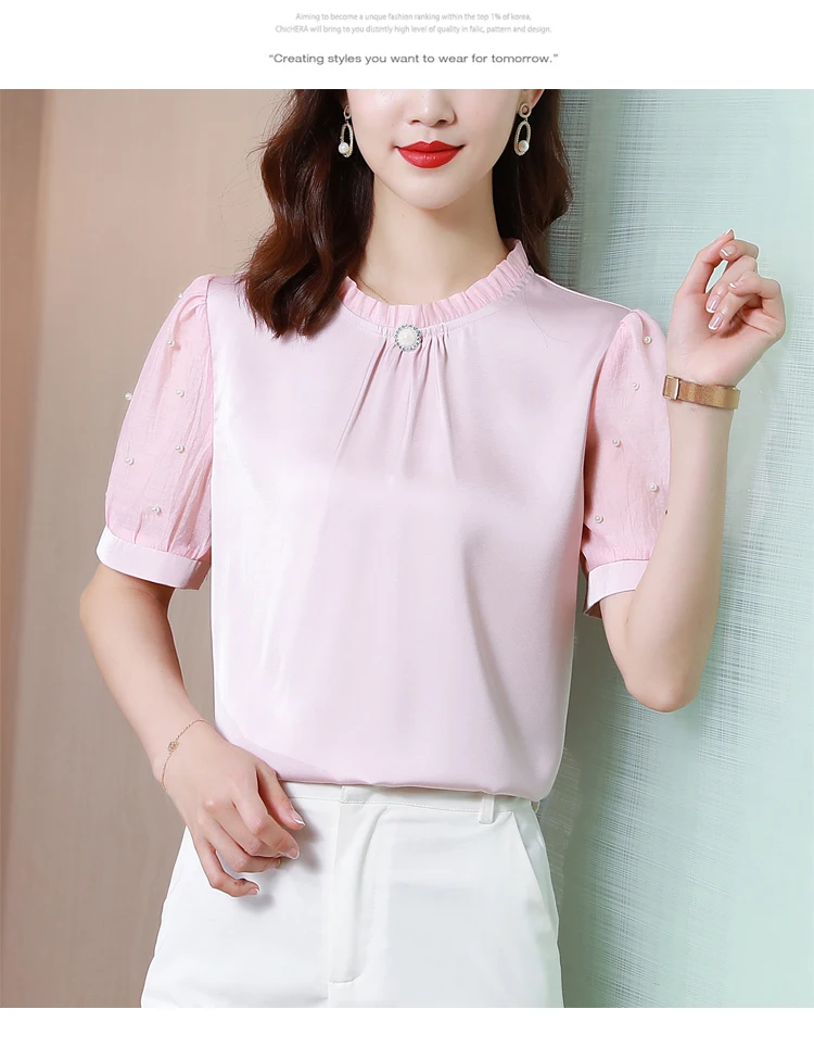 Korean Women's Shirt Chiffon Blouse for Women Embroidered Flores Shirt Pink Stand Neck Blouse Top Female 2021 Woman Basic Shirts