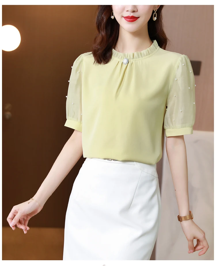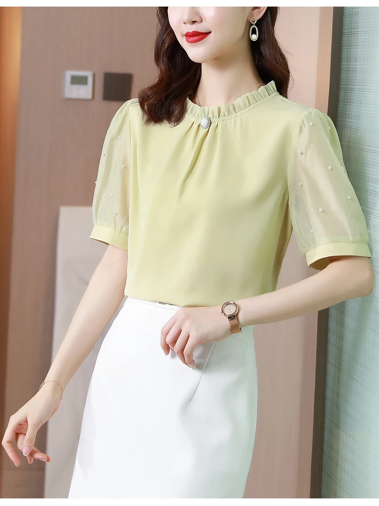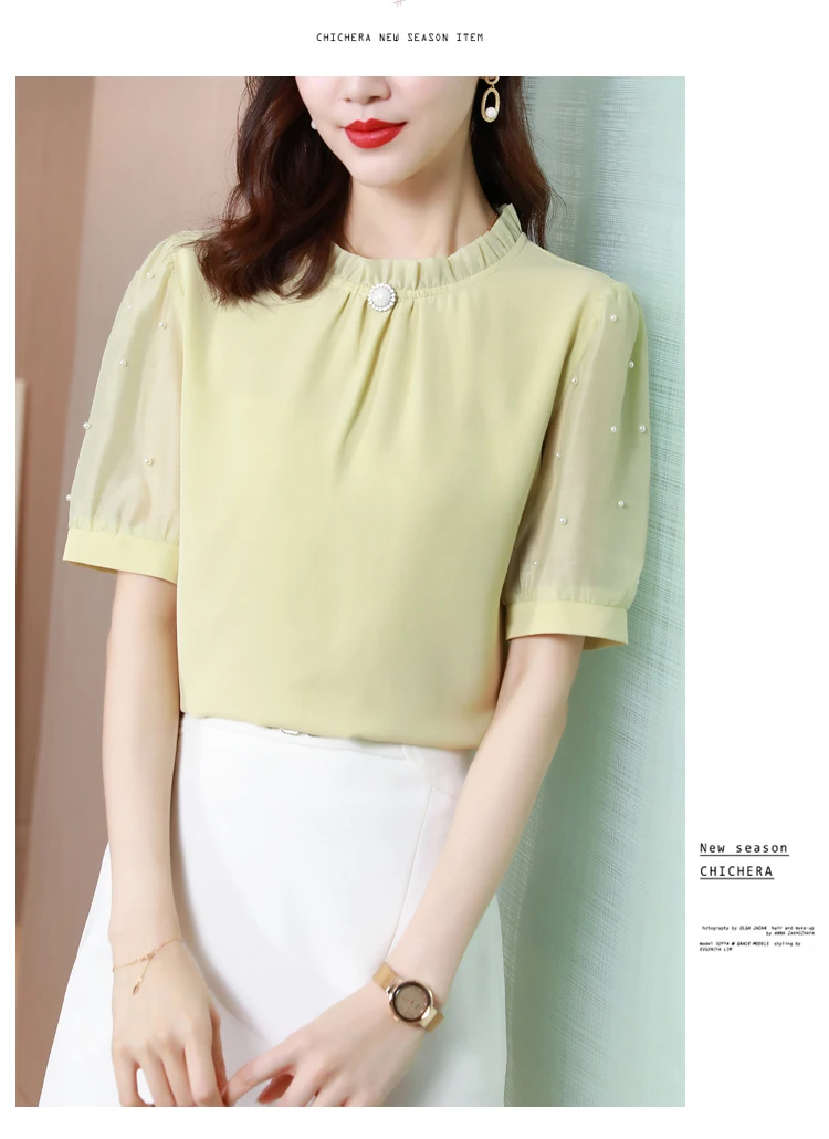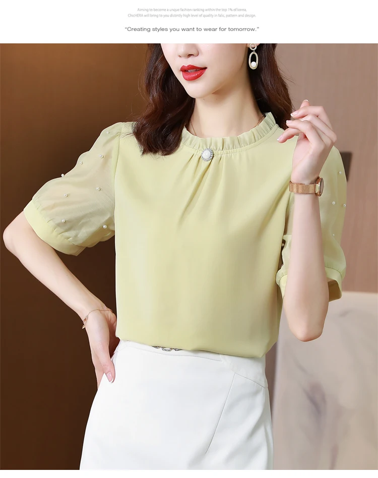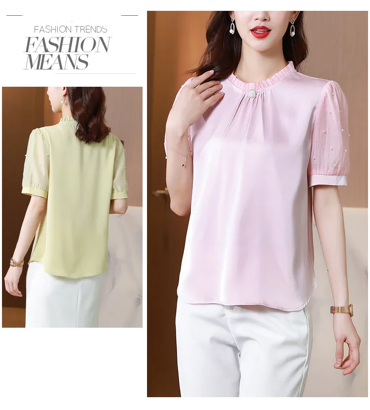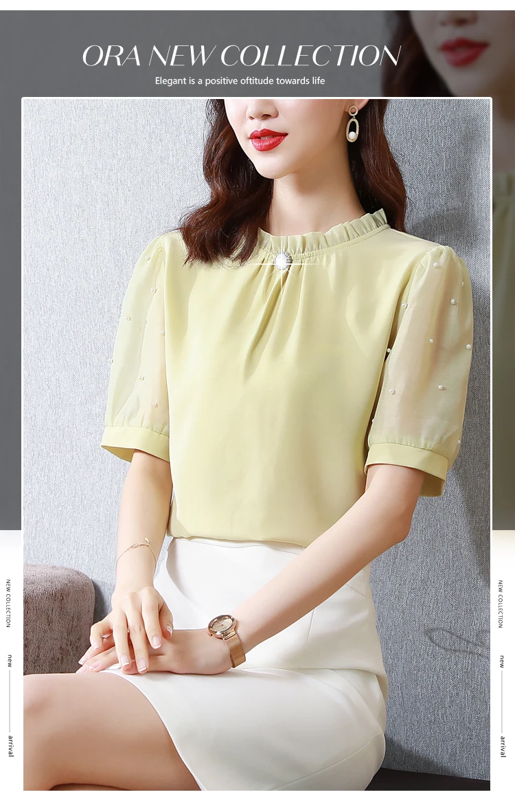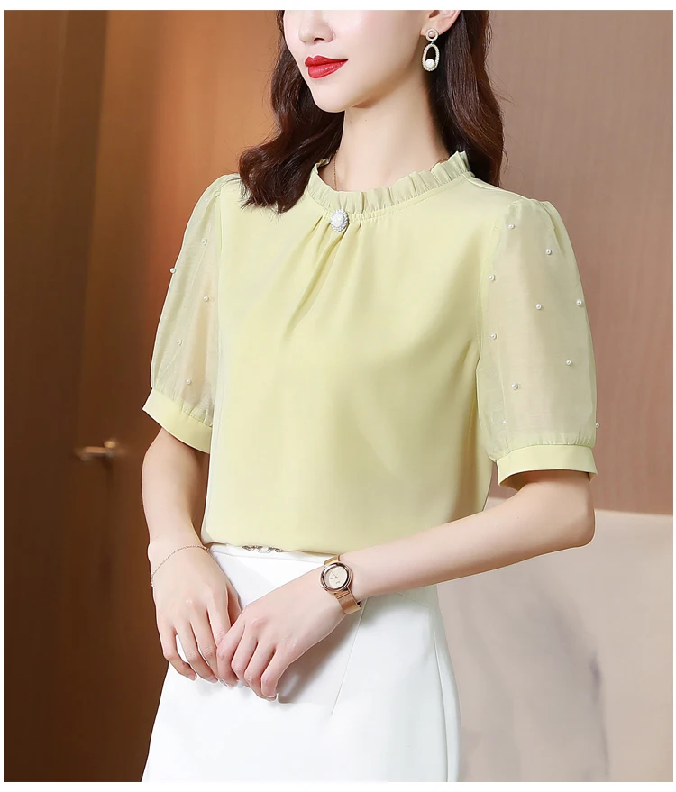 Korean Women's Shirt Chiffon Blouse for Women Embroidered Flores Shirt Pink Stand Neck Blouse Top Female 2021 Woman Basic Shirts