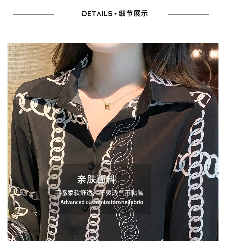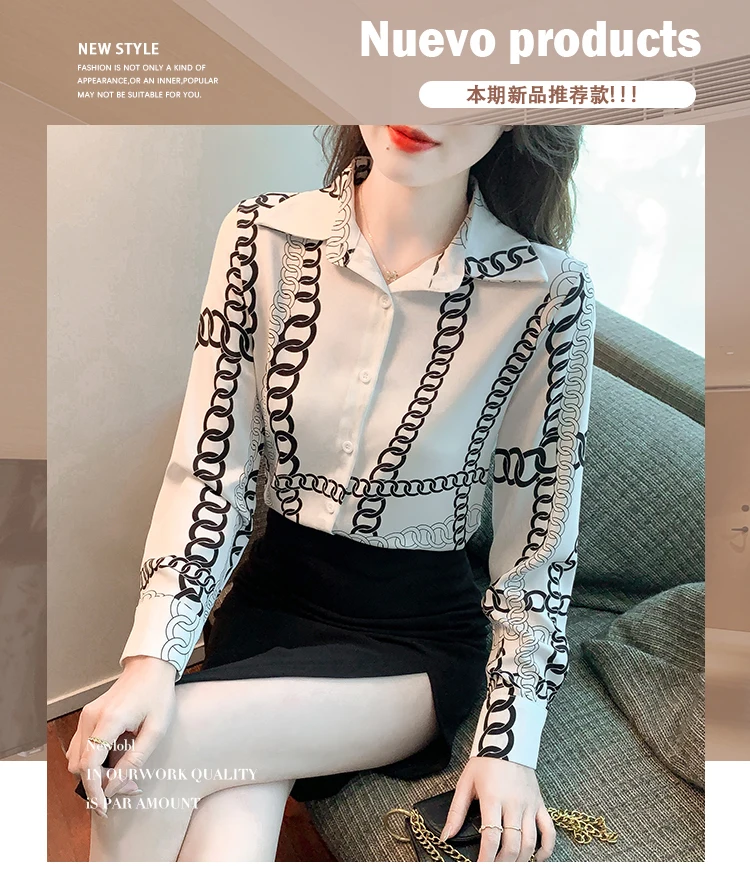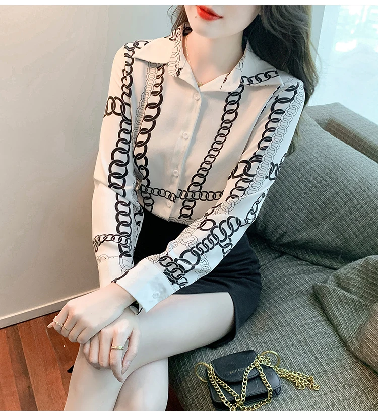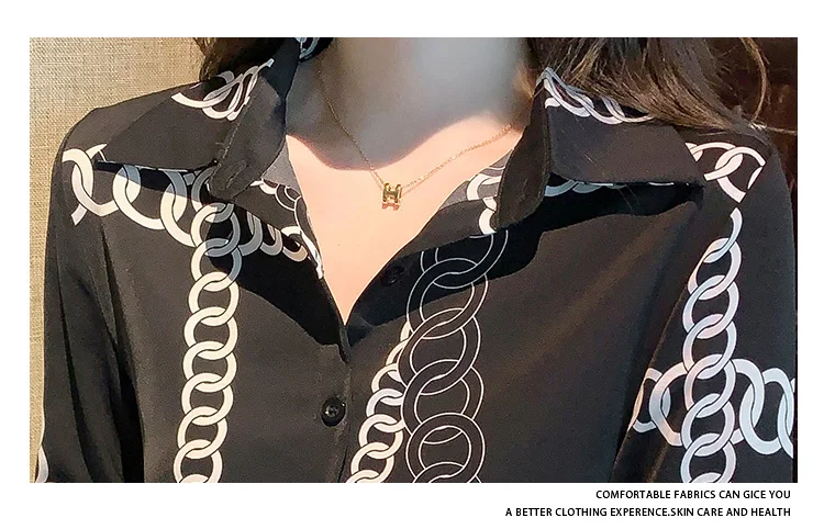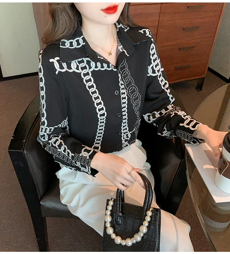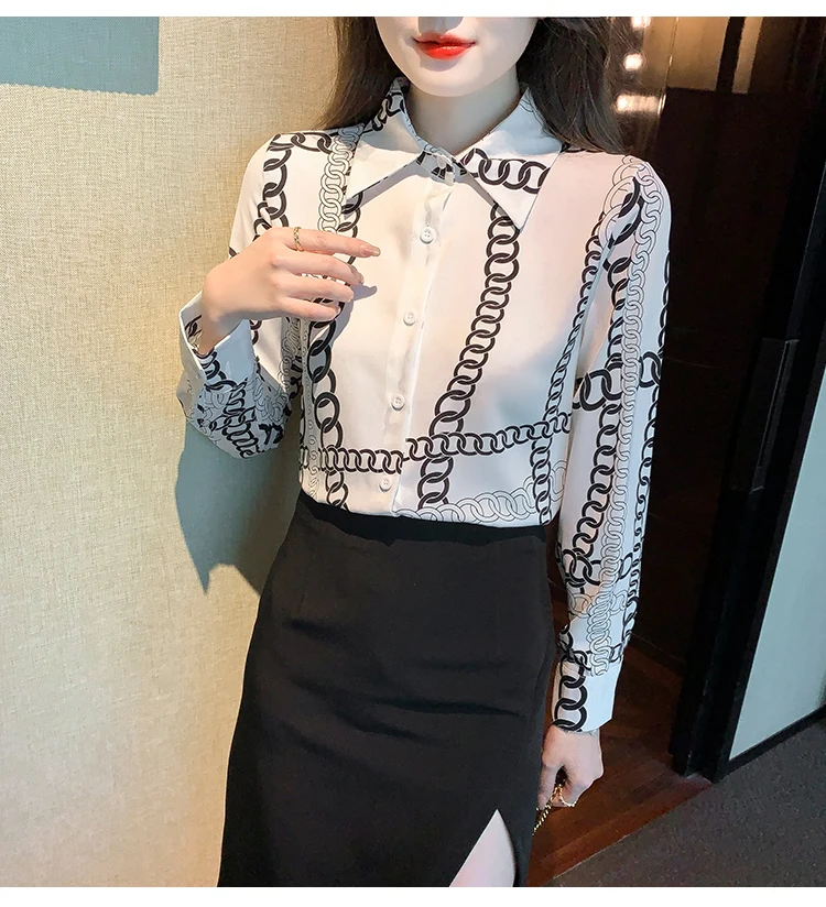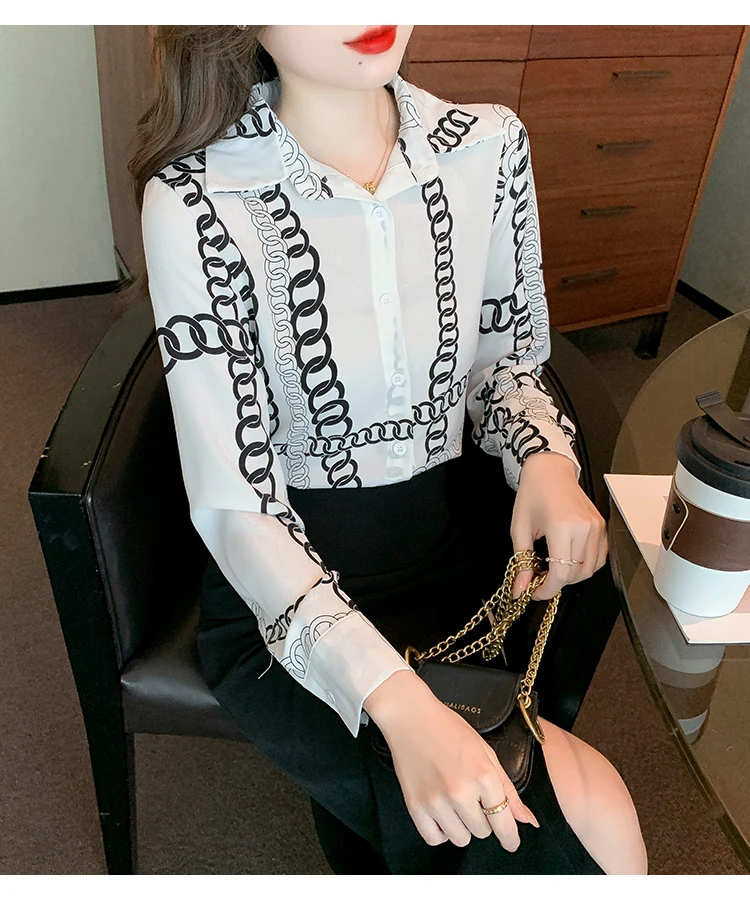 New 2022 Spring Women Chiffon Shirt Fashion Long Sleeved Turn Down Collar Print Blouses Elegant Office Lady Tops Blusas