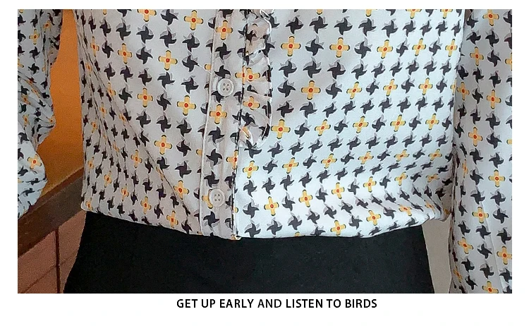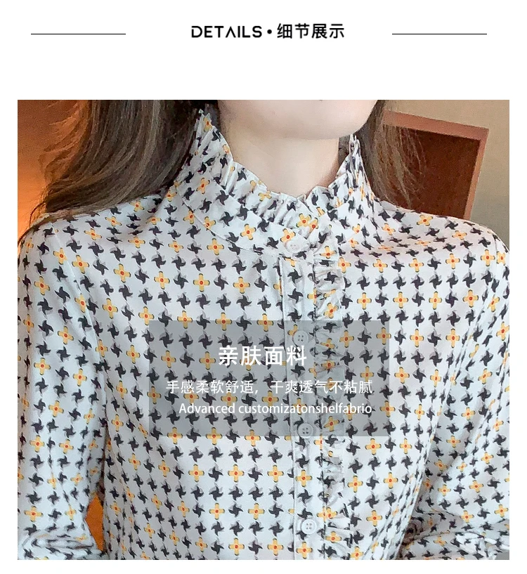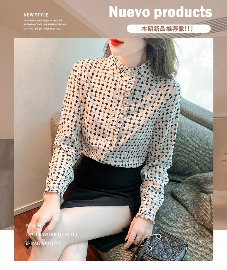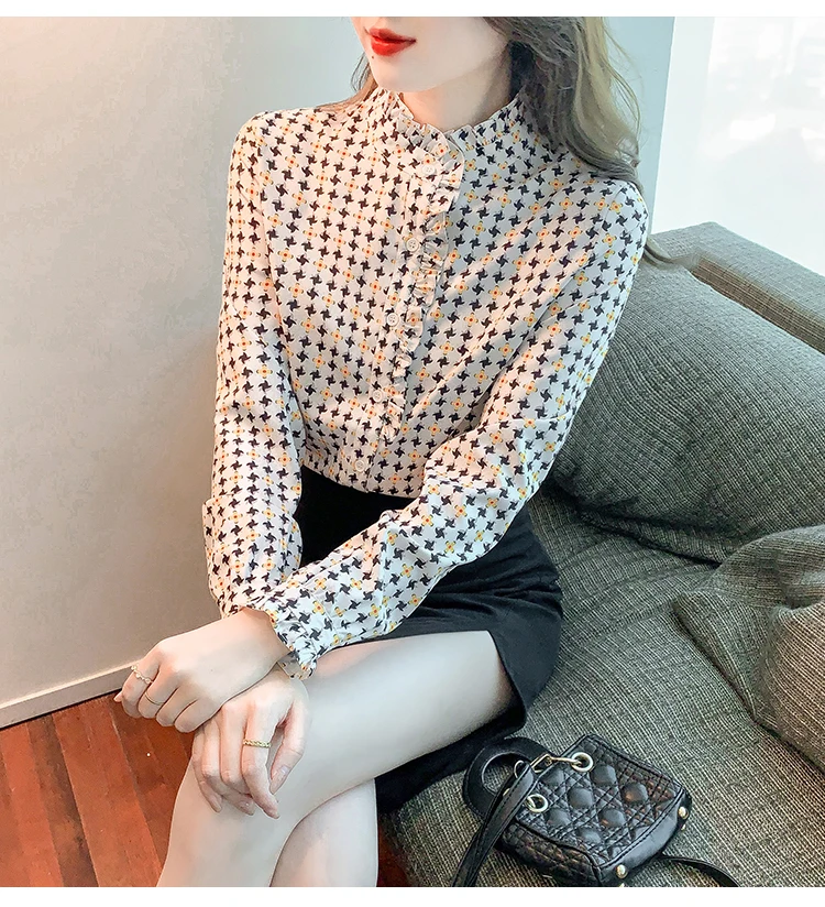 New 2022 Spring Women Chiffon Shirt Fashion Printed Long Sleeved Stand Collar Ruffles Blouses Office Lady Tops