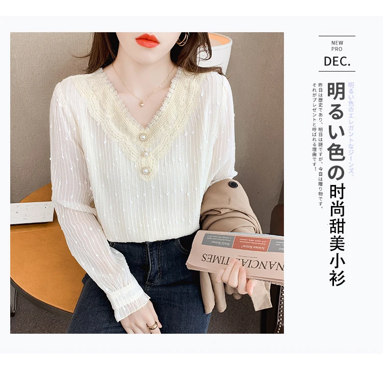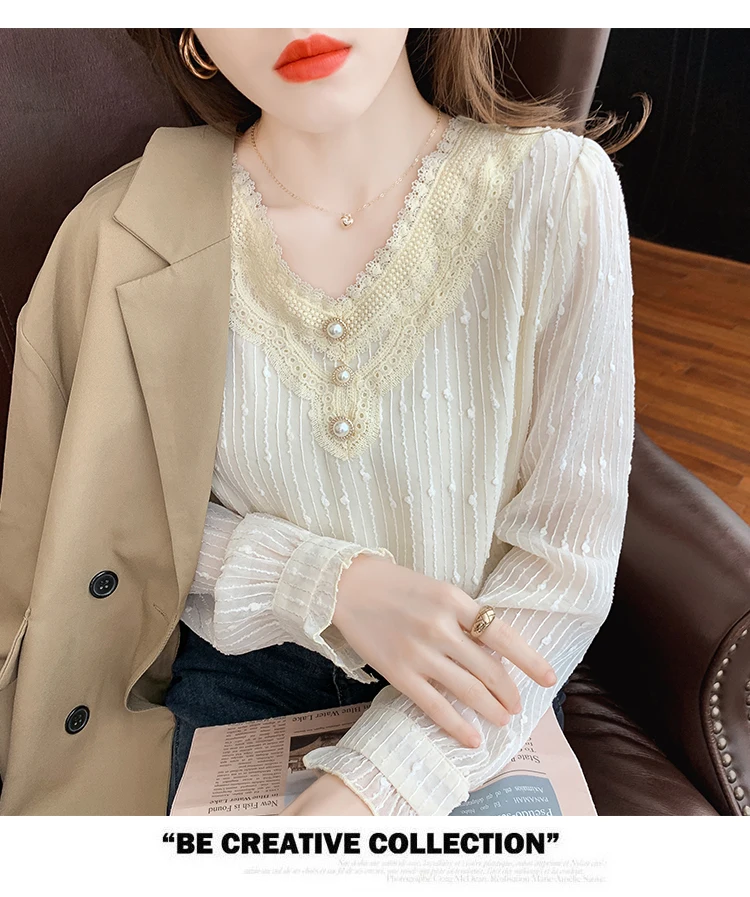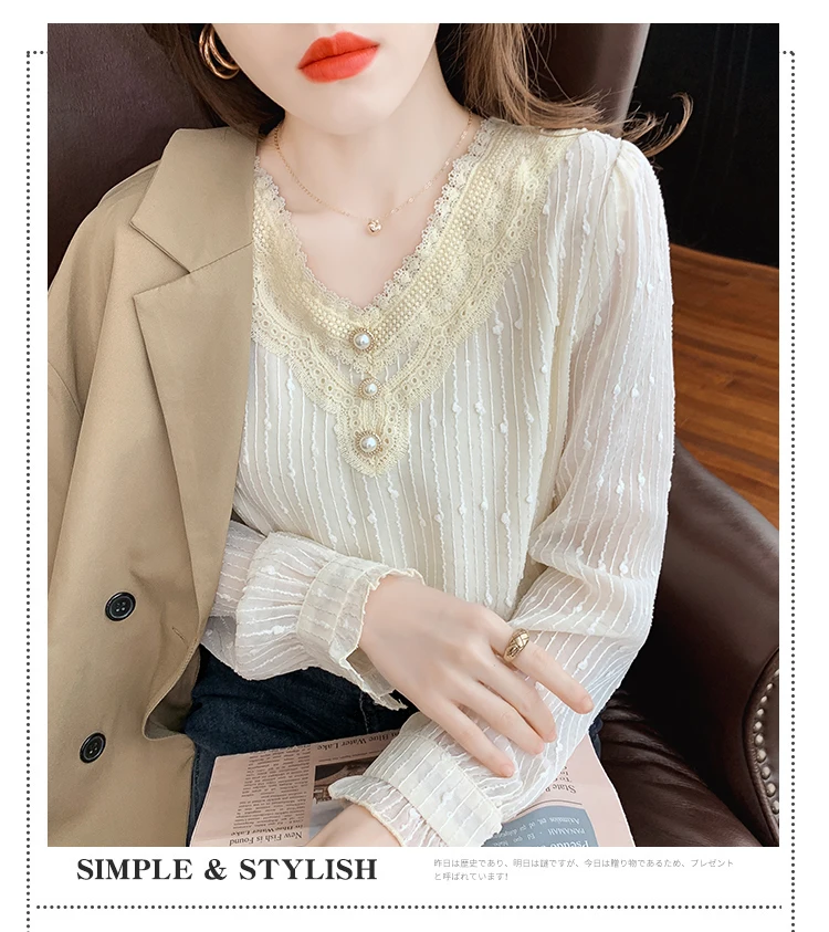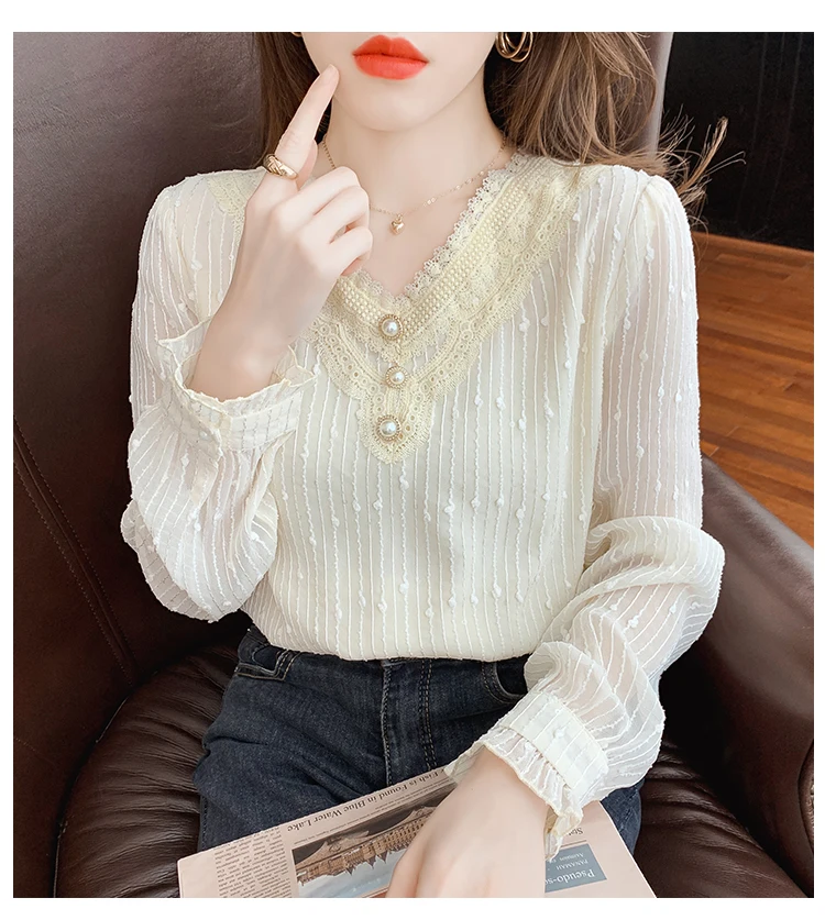 New 2022 Spring Women's Chiffon Shirt Fashion Casual Long Sleeved V-Neck Lace Tops Elegant Slim Office Lady Blouses