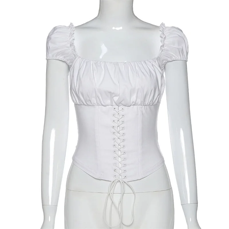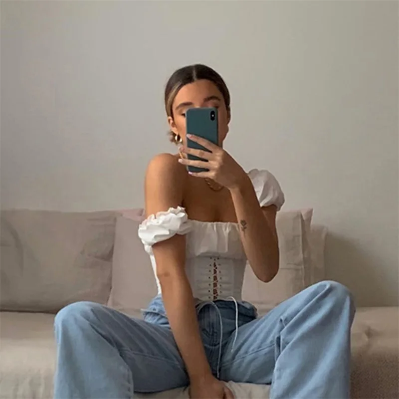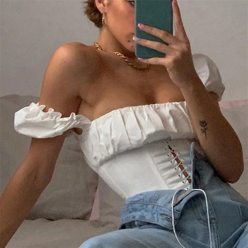 Off Shoulder Fashion Lace Up Shirts Blouse Blouse Women White Crop Tops Blouses Clothes Vintage Tie Front Tops