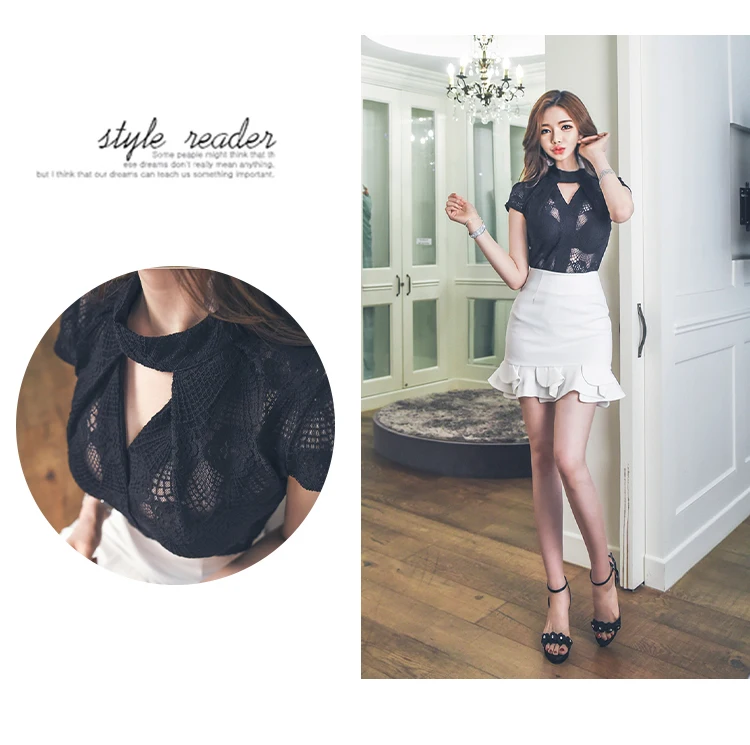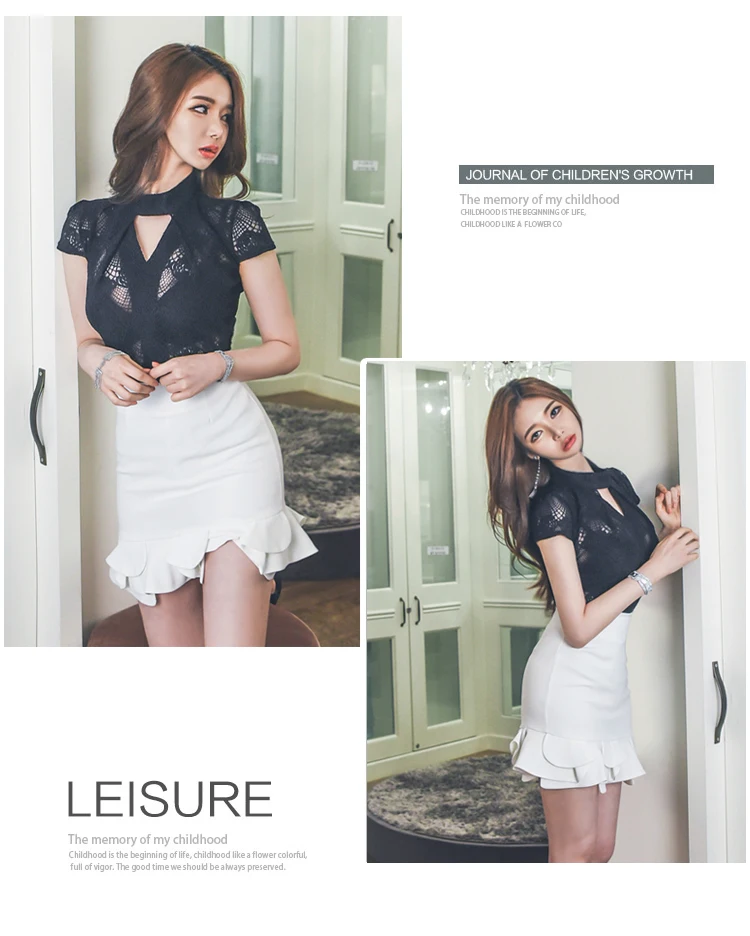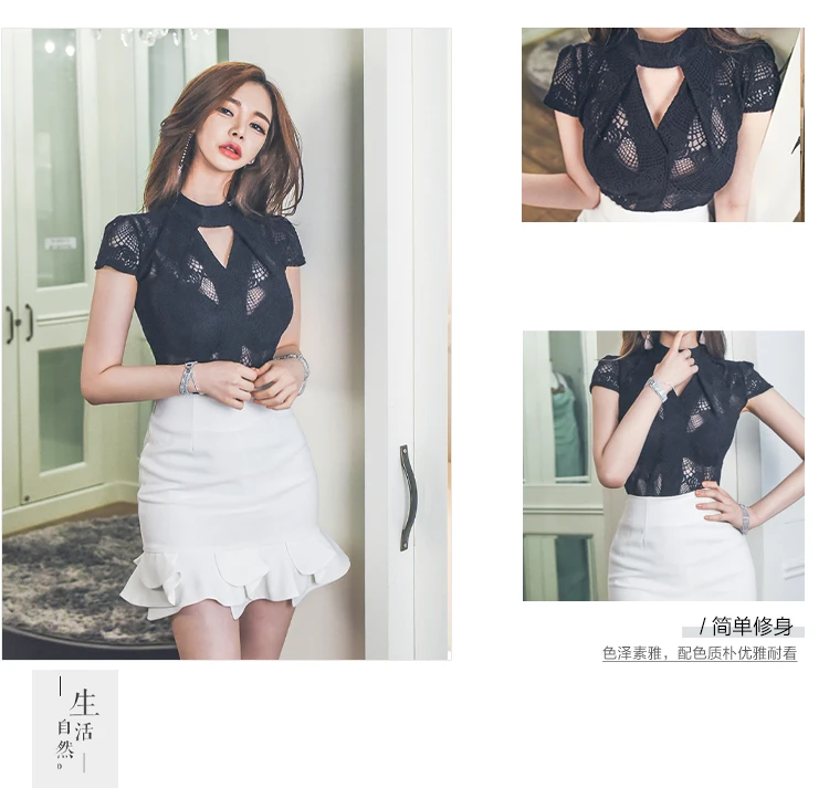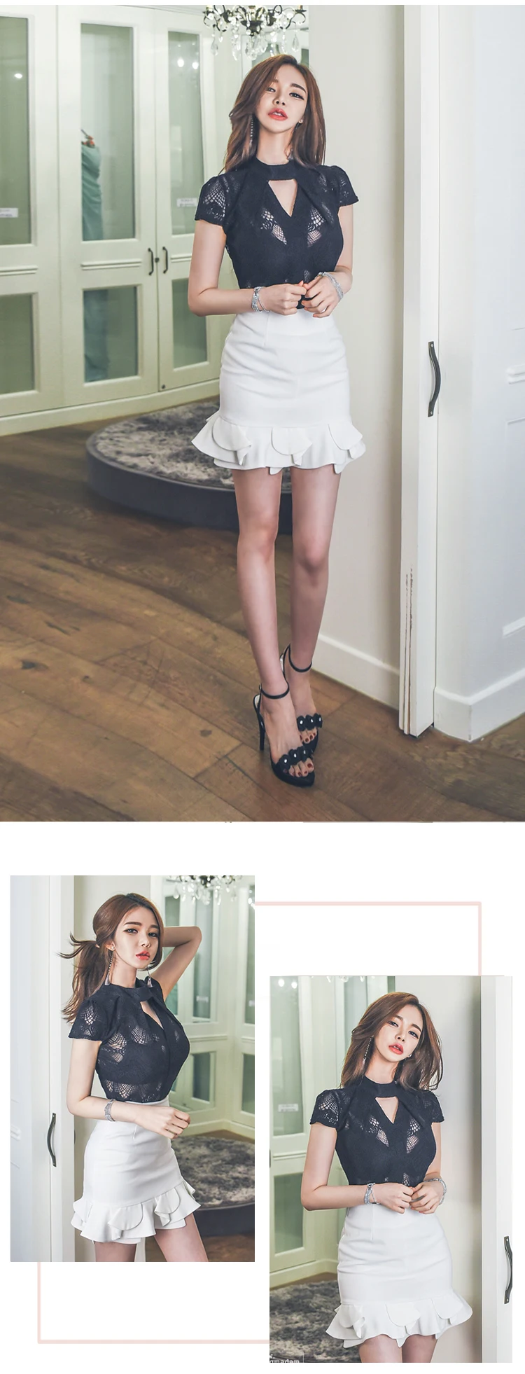 OL Work Wear 2 Pieces Set Women's Hollow Out Lace Blouses + High Waist Slim Mermaid Skirt Simple Korean Style Chic Skirt Suits