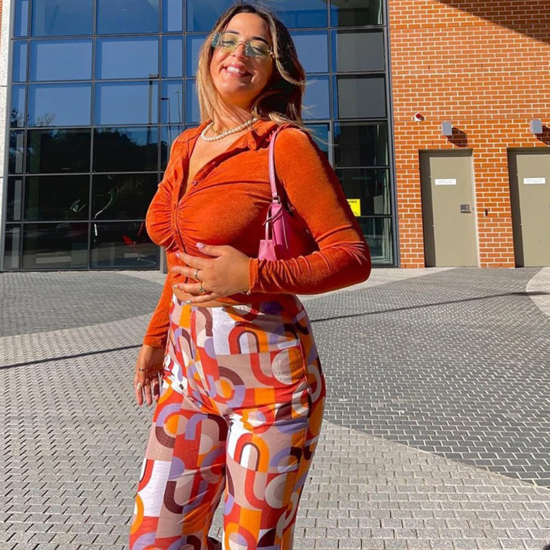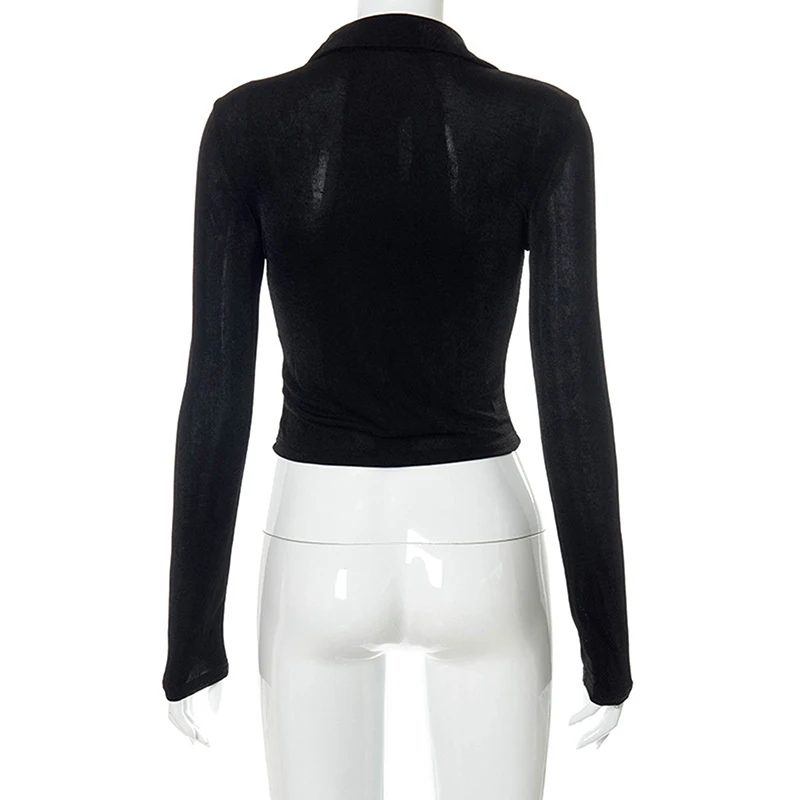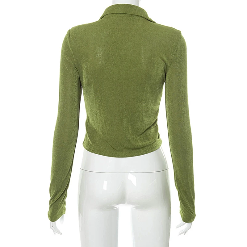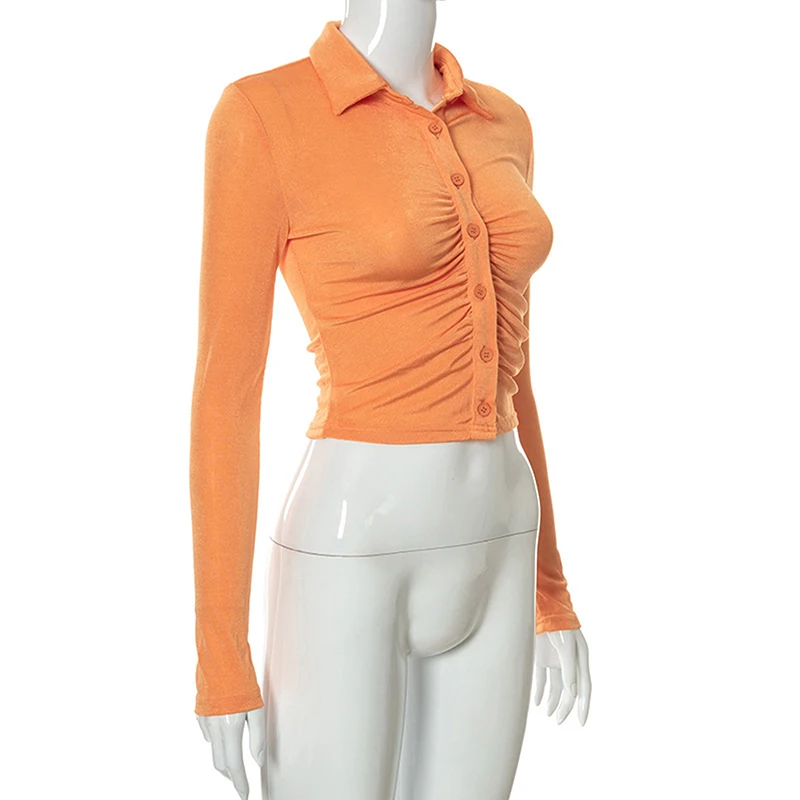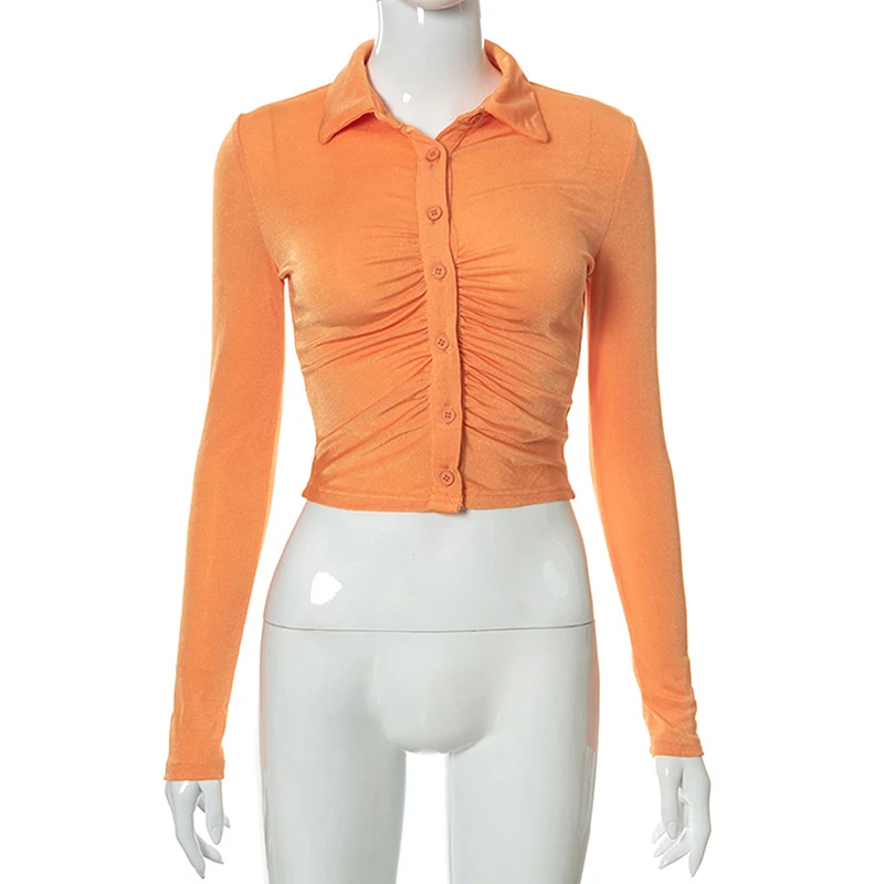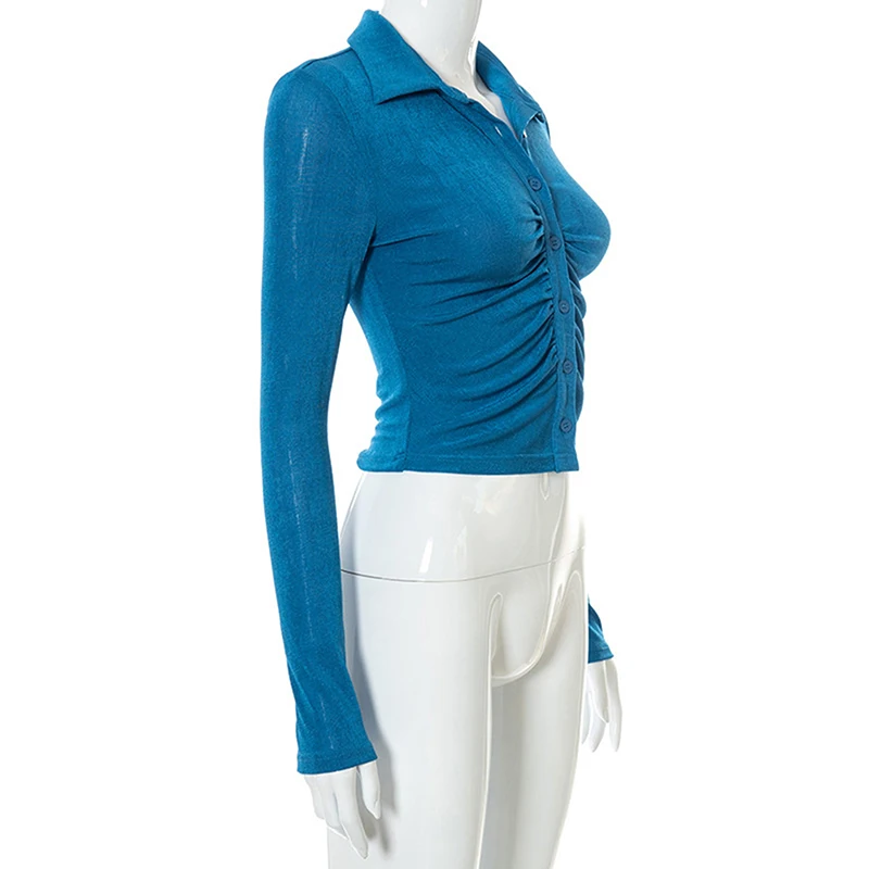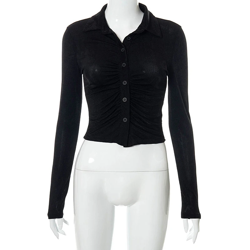 Retro Long Sleeve Crop Tops Women Fashion Vintage Pleated Buttons Lapel Shirts autumn Solid Slim Casual Street T-shirts