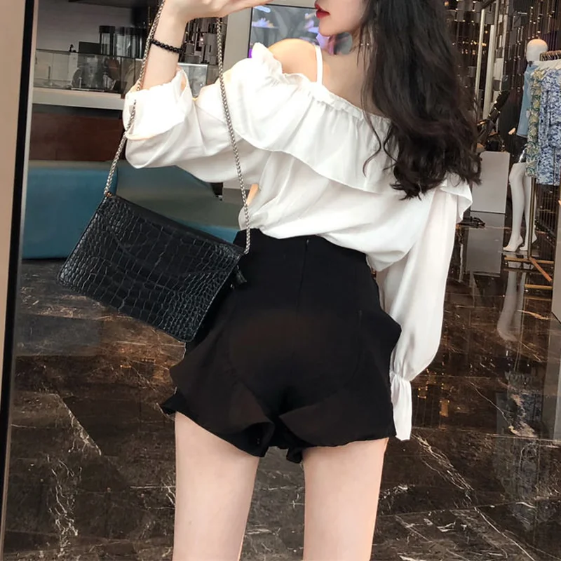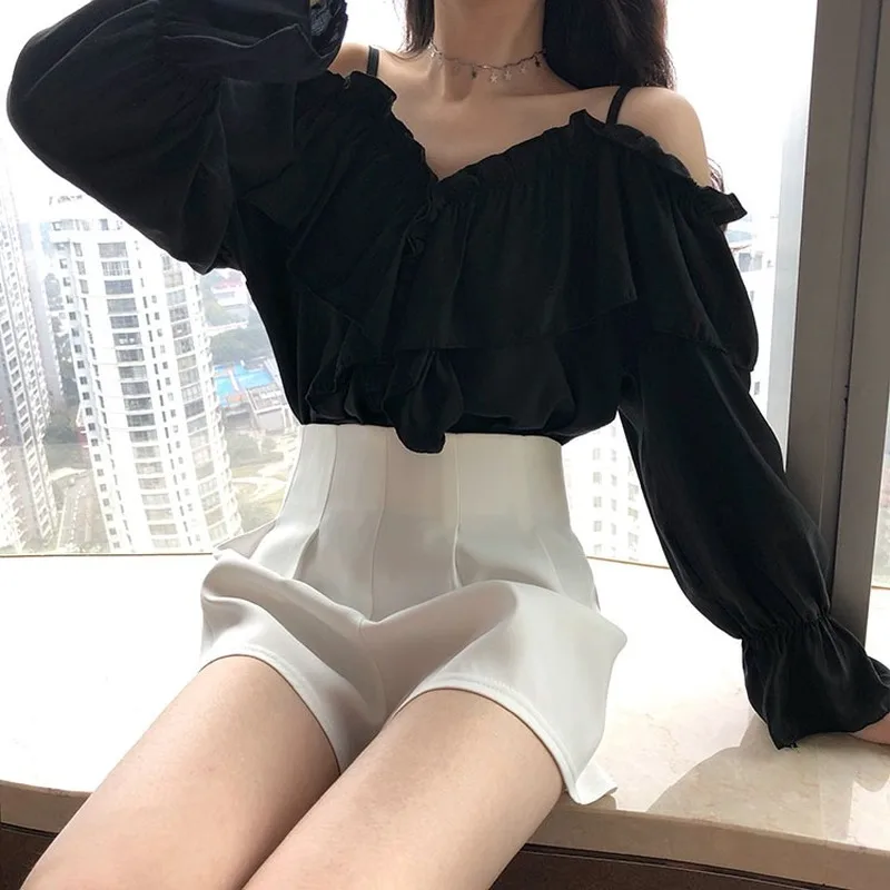 Sexy Shirts Women Off Shoulder Korean Tops V-Neck Flare Sleeve Ruffles Solid Loose Design Clubwear Blouse Casual Blusas 2022