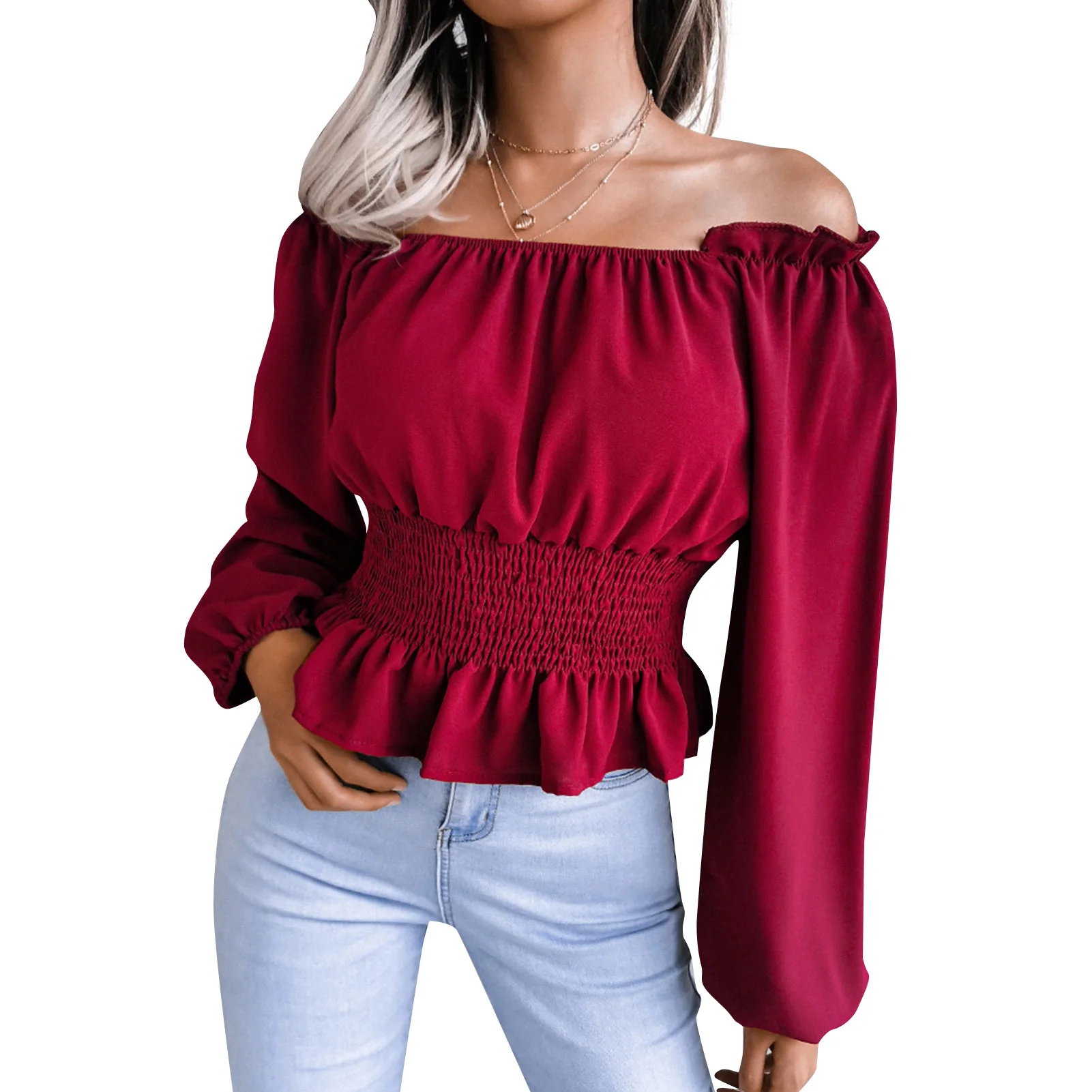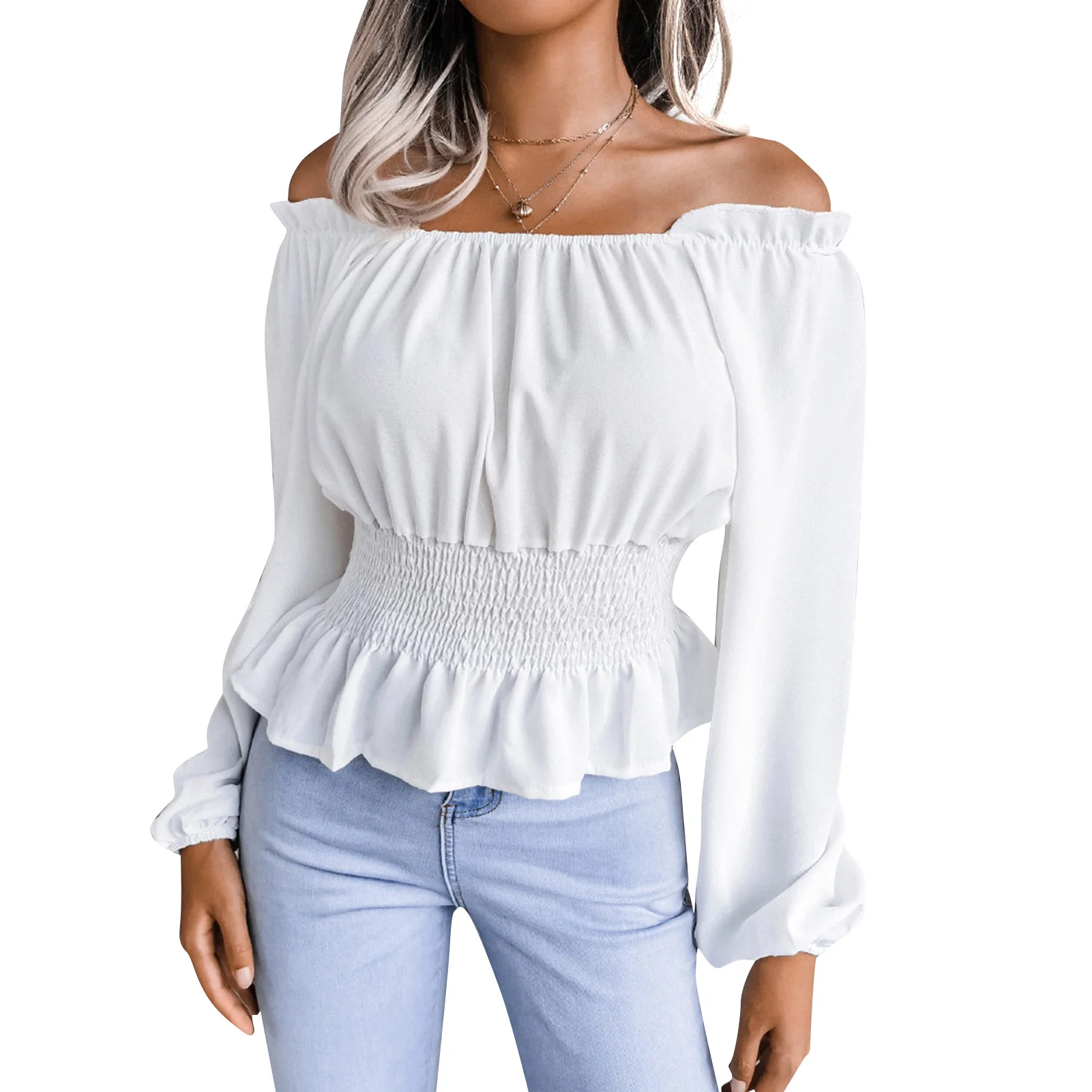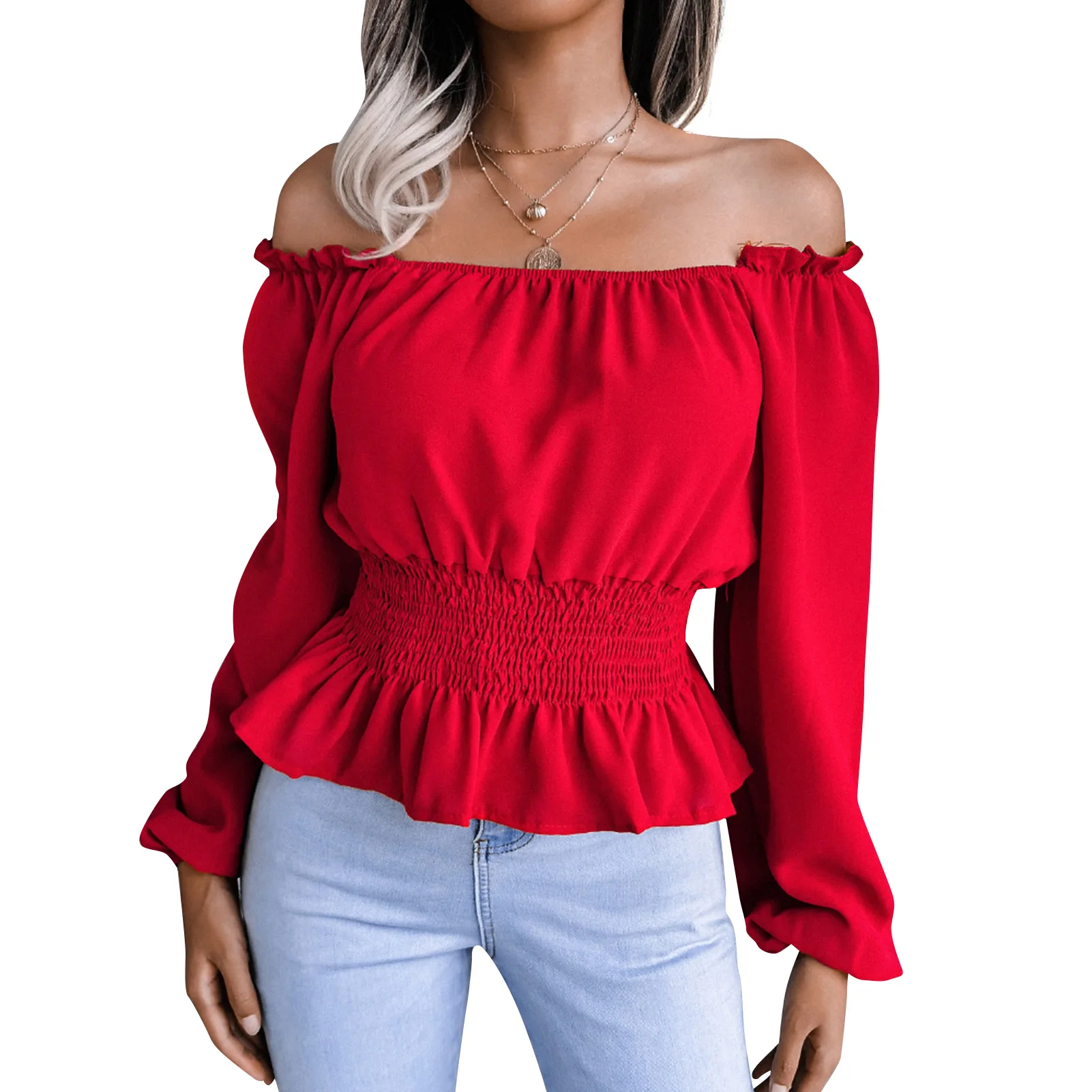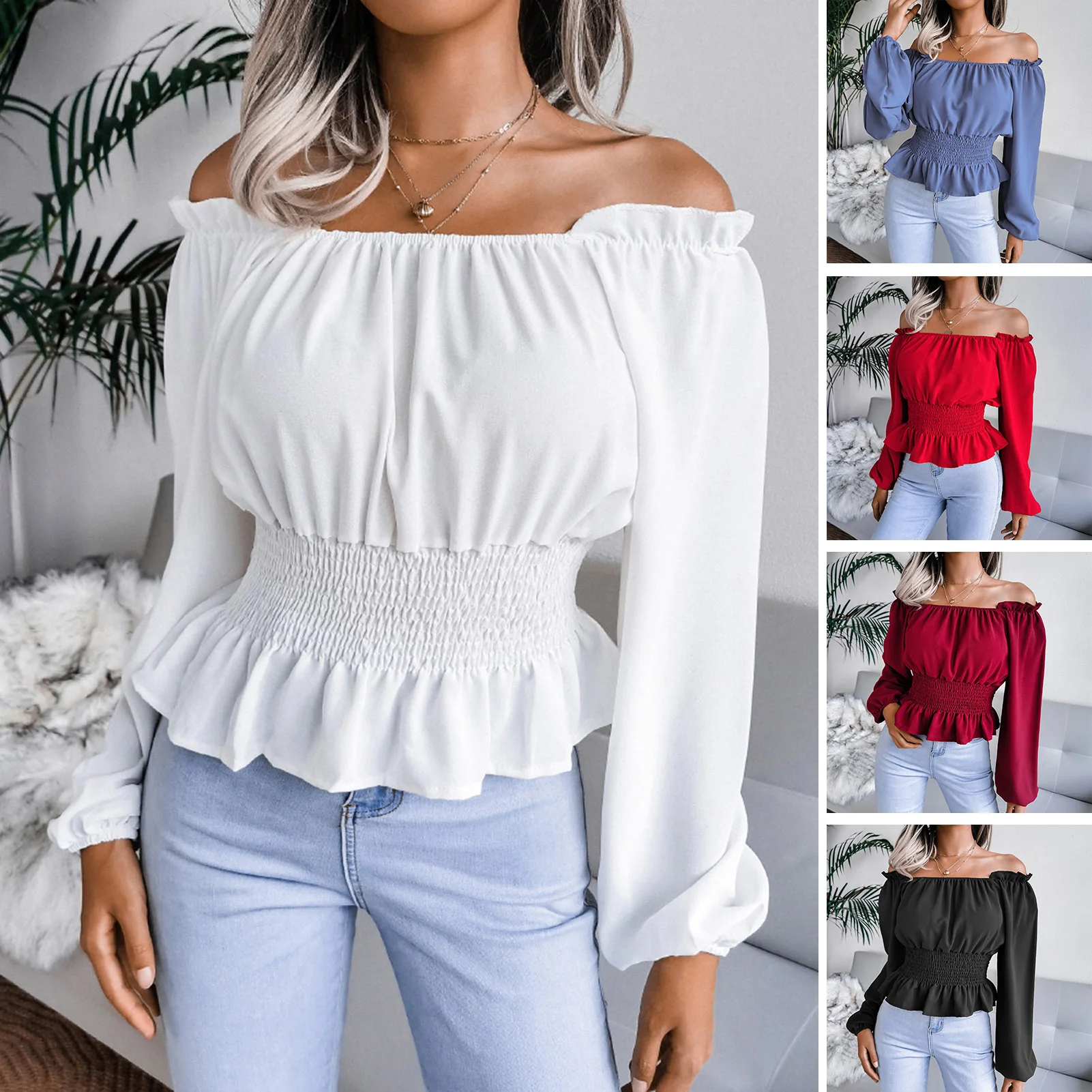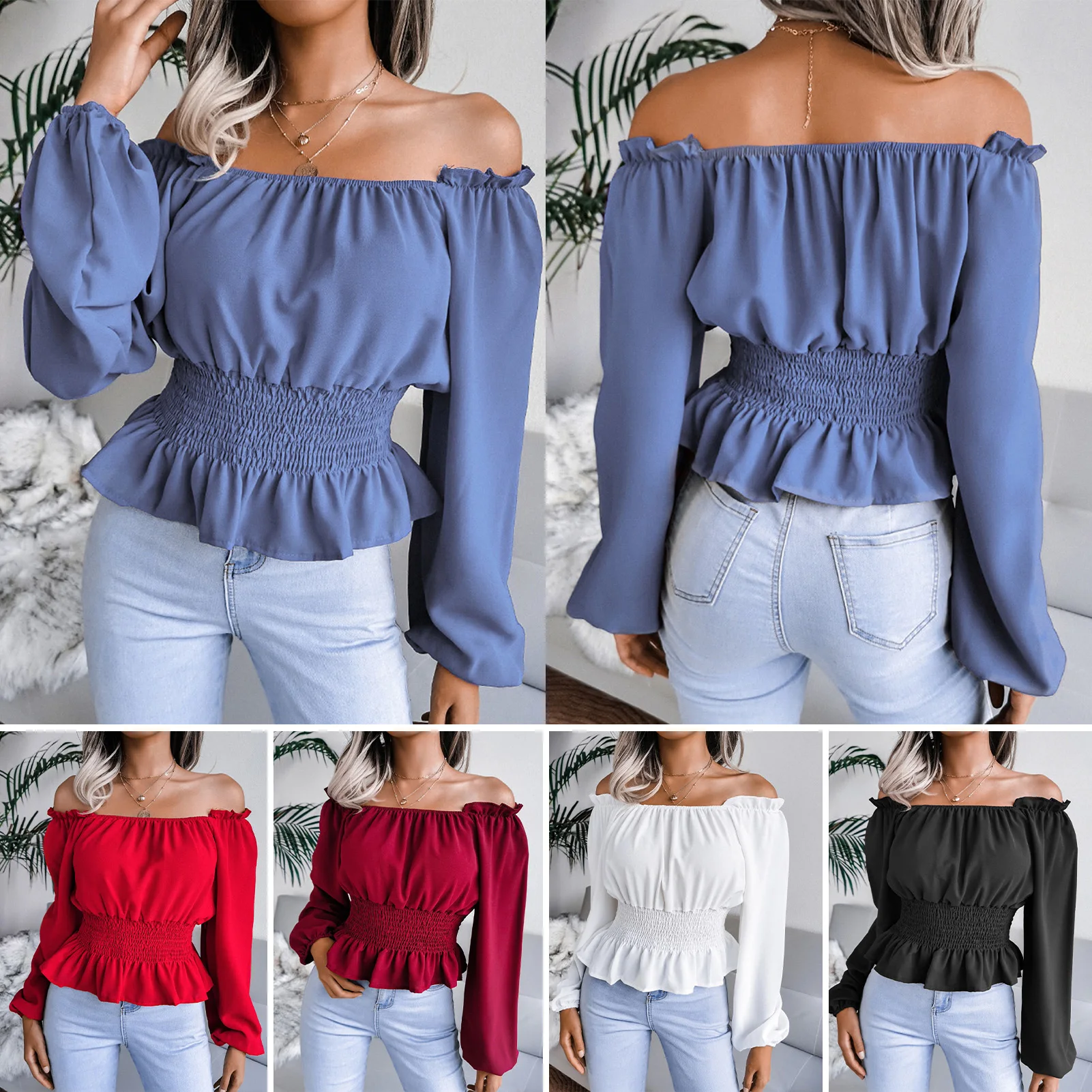Solid Color Tops Fashion Women Ladies Long Sleeve Off Shoulder Sexy Shirt 2021 New Chiffon Blouses Female T-shirt Ladies Office