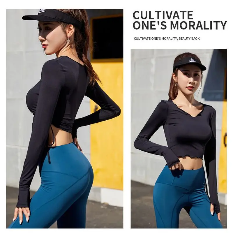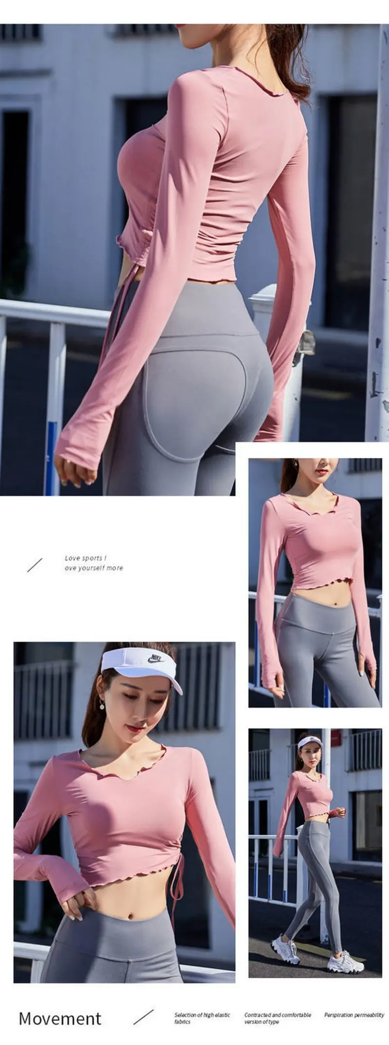 Sports Long-sleeved T-shirt Women Round Neck Drawstring Short Fitness Top Elastic Quick-drying Breathable Yoga Shirts