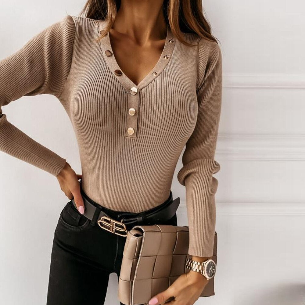 Spring Autumn Slim Bottomed Long Sleeve Women Shirt Sexy Deep V Neck sweater Button T Shirts Elegant Casual Solid knitting Tops