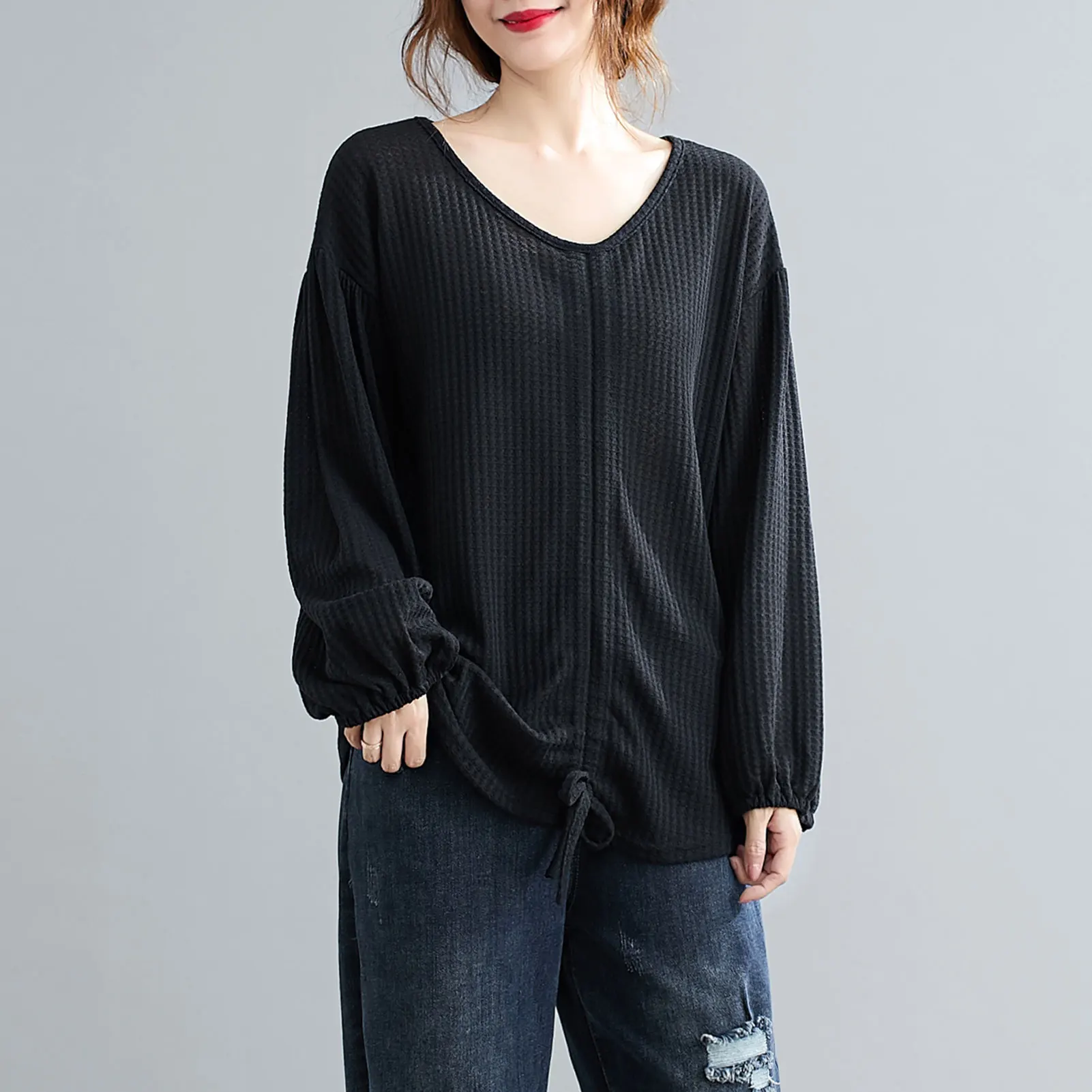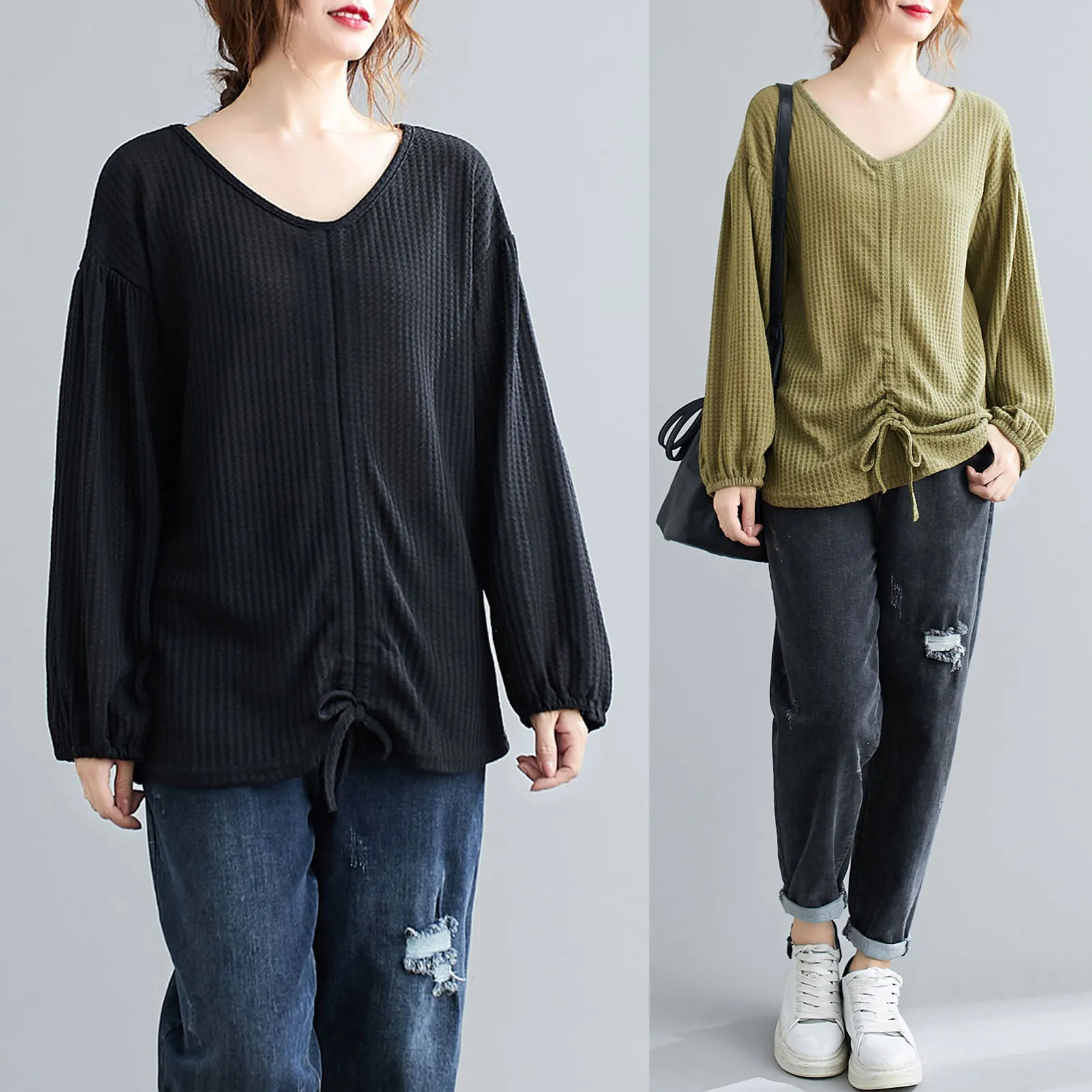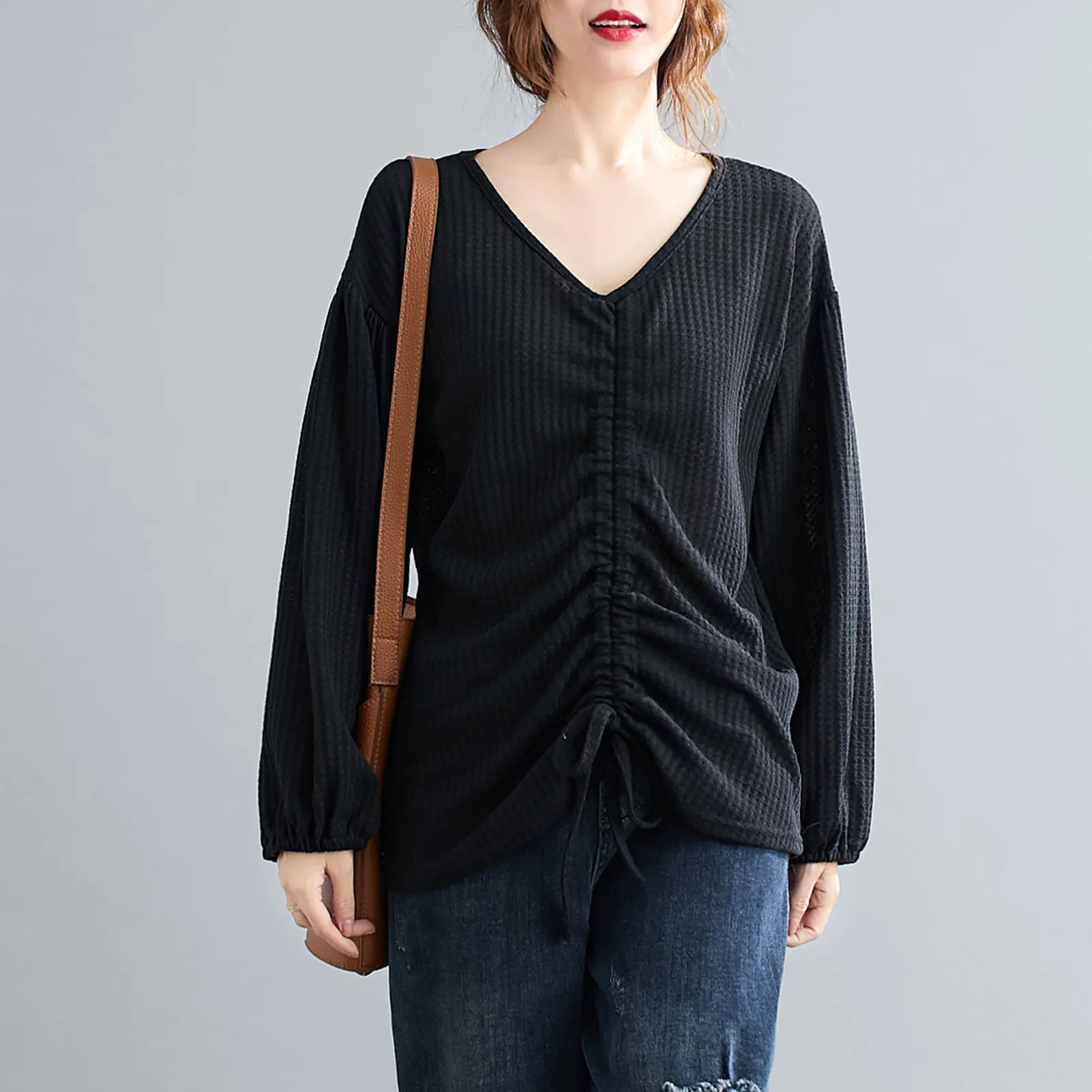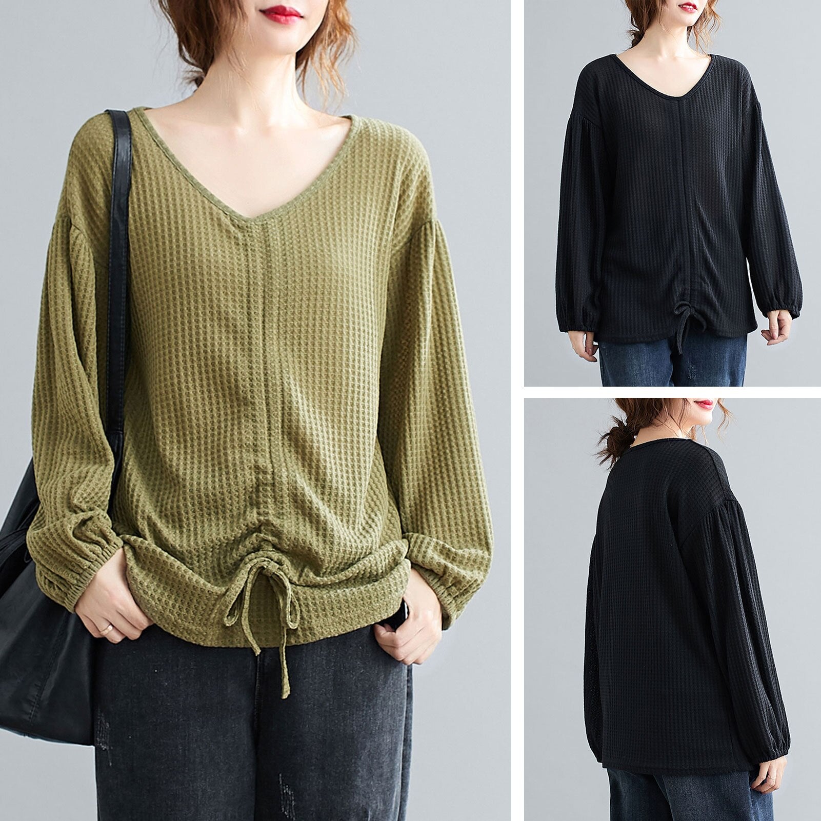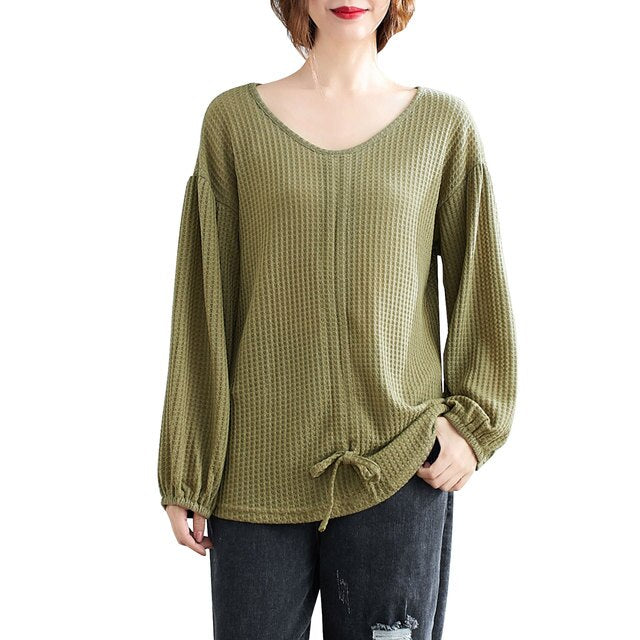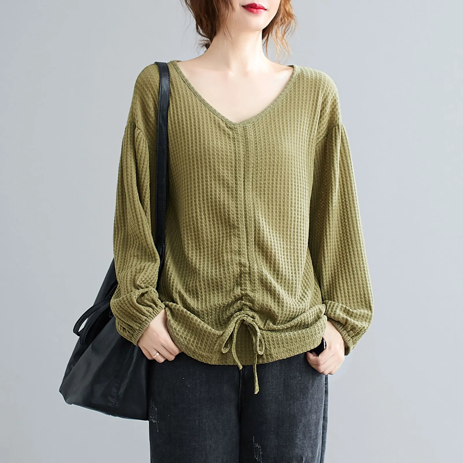 This sweatshirt in knitted fabric features V-neck, lantern sleeves, and front adjustable drawstring. It is warm and soft for spring and autumn daily wear. Pair it with your jeans or skirt for various ensembles.
