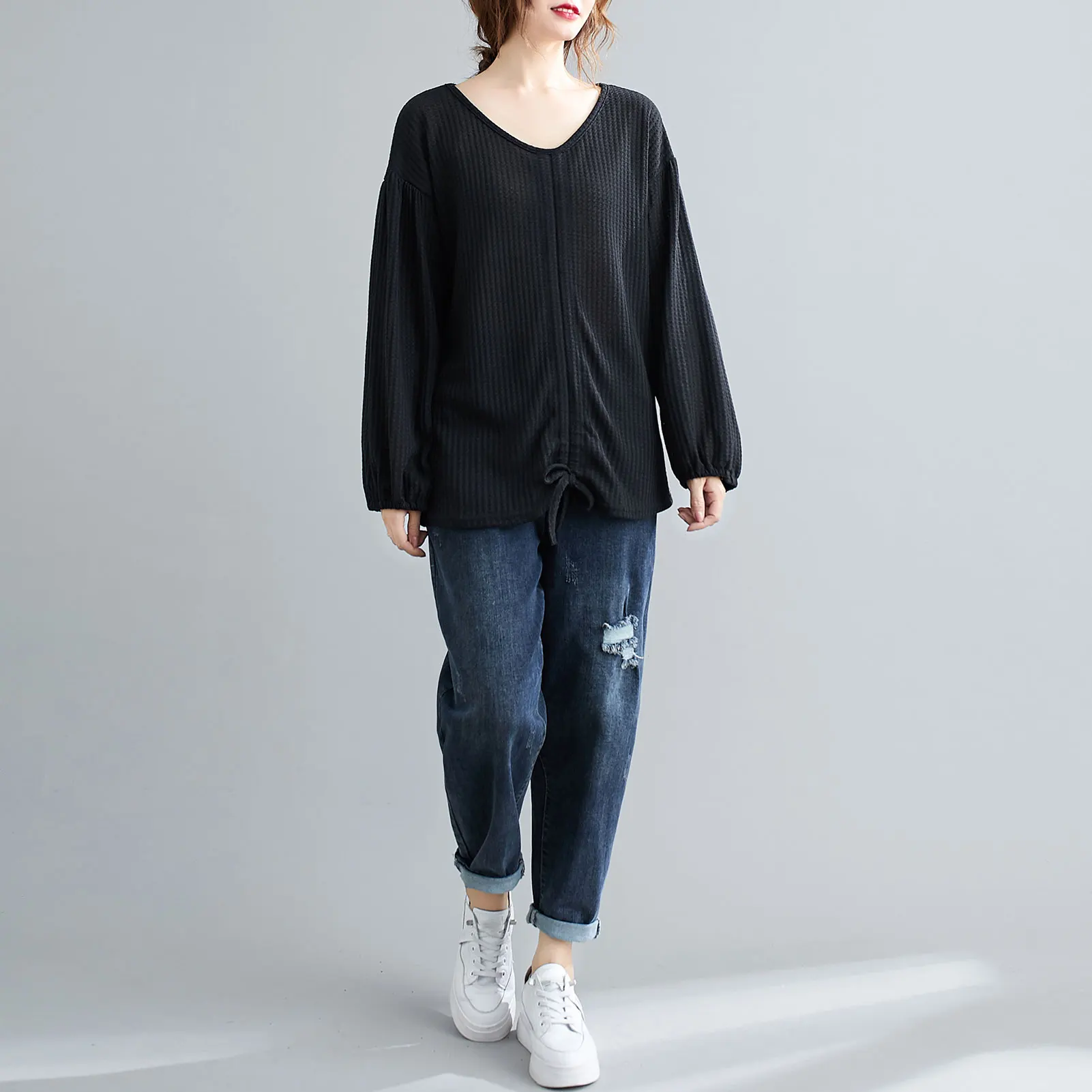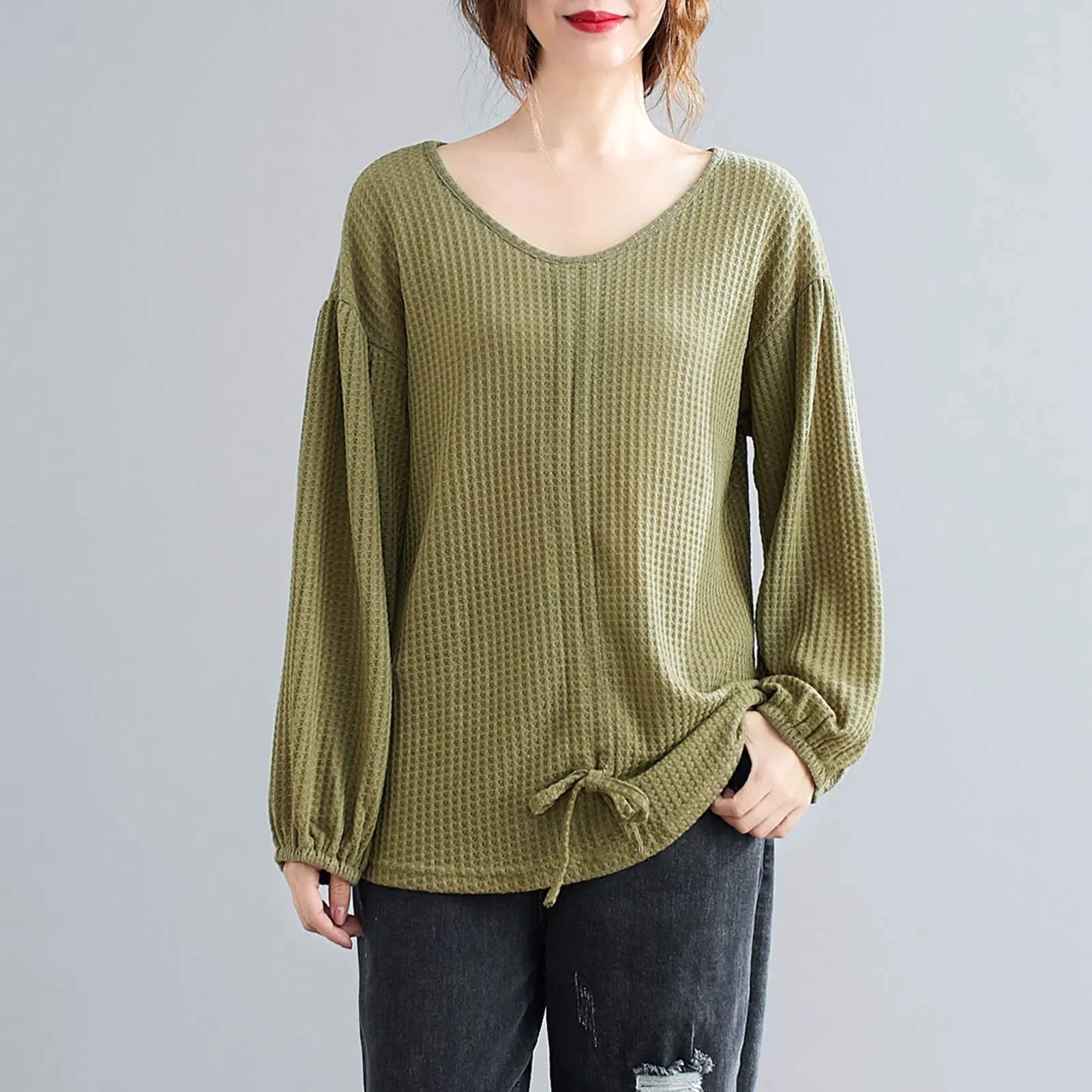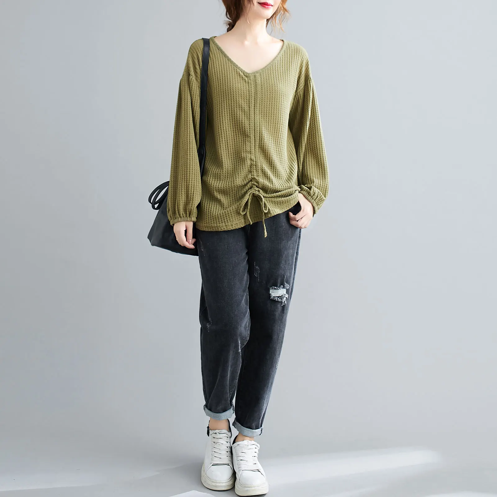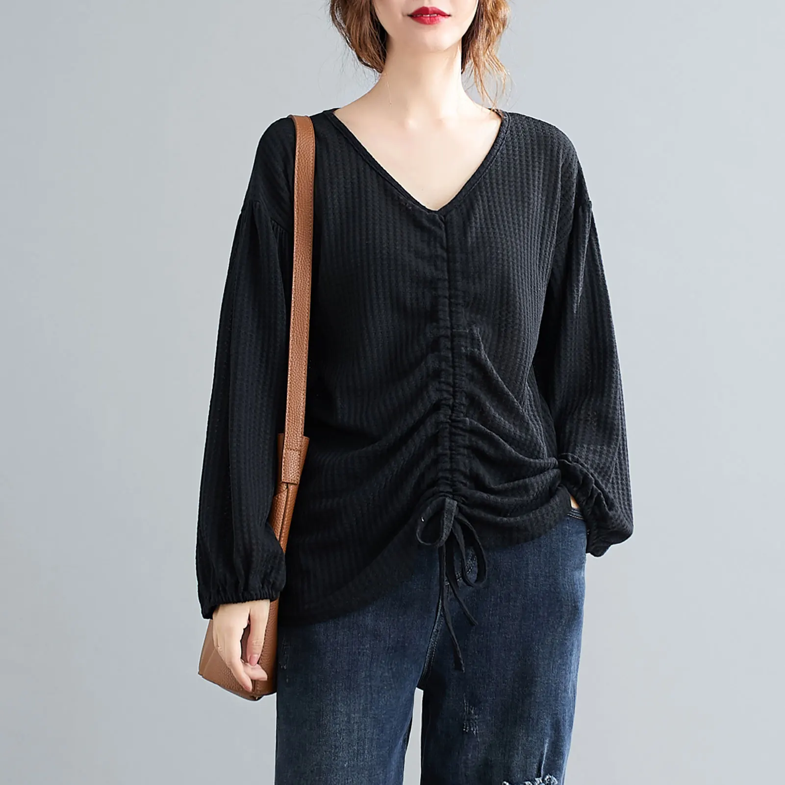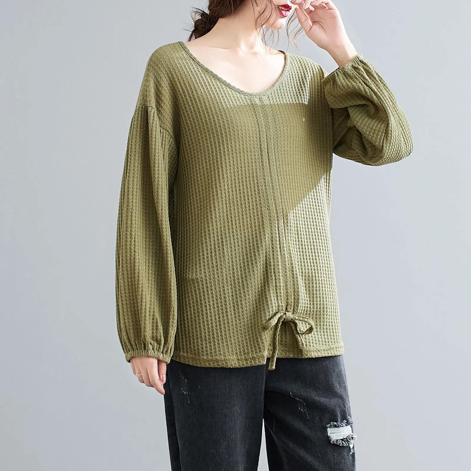 This sweatshirt in knitted fabric features V-neck, lantern sleeves, and front adjustable drawstring. It is warm and soft for spring and autumn daily wear. Pair it with your jeans or skirt for various ensembles.