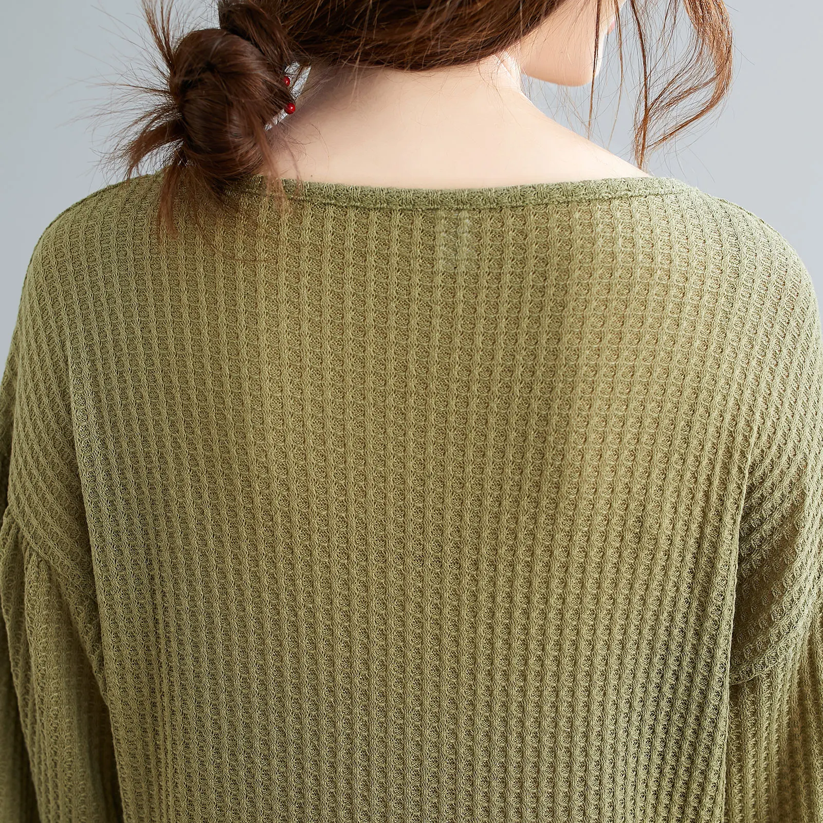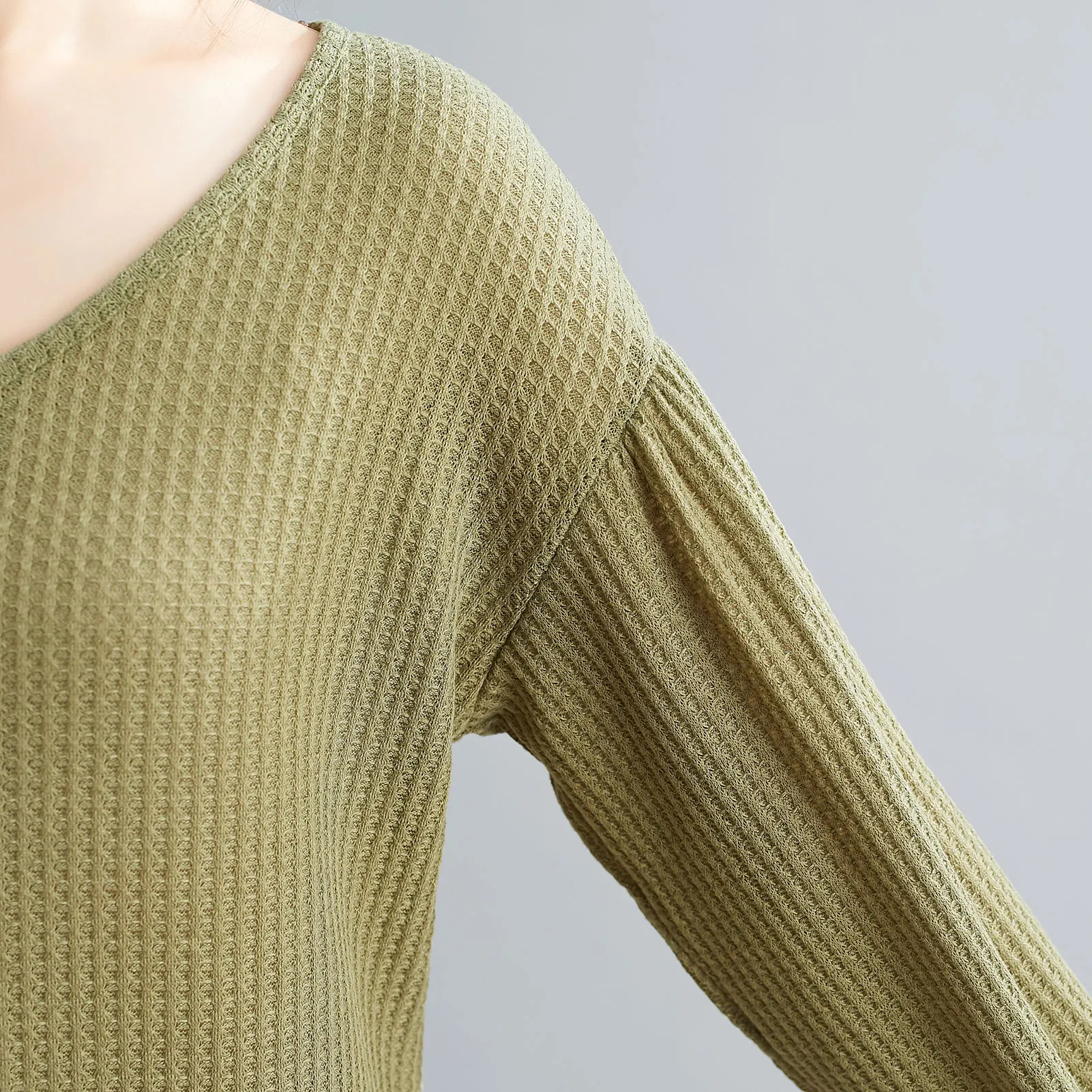 Lantern sleeves, V-neck, solid color, and knitted finishing are cute and vintage.