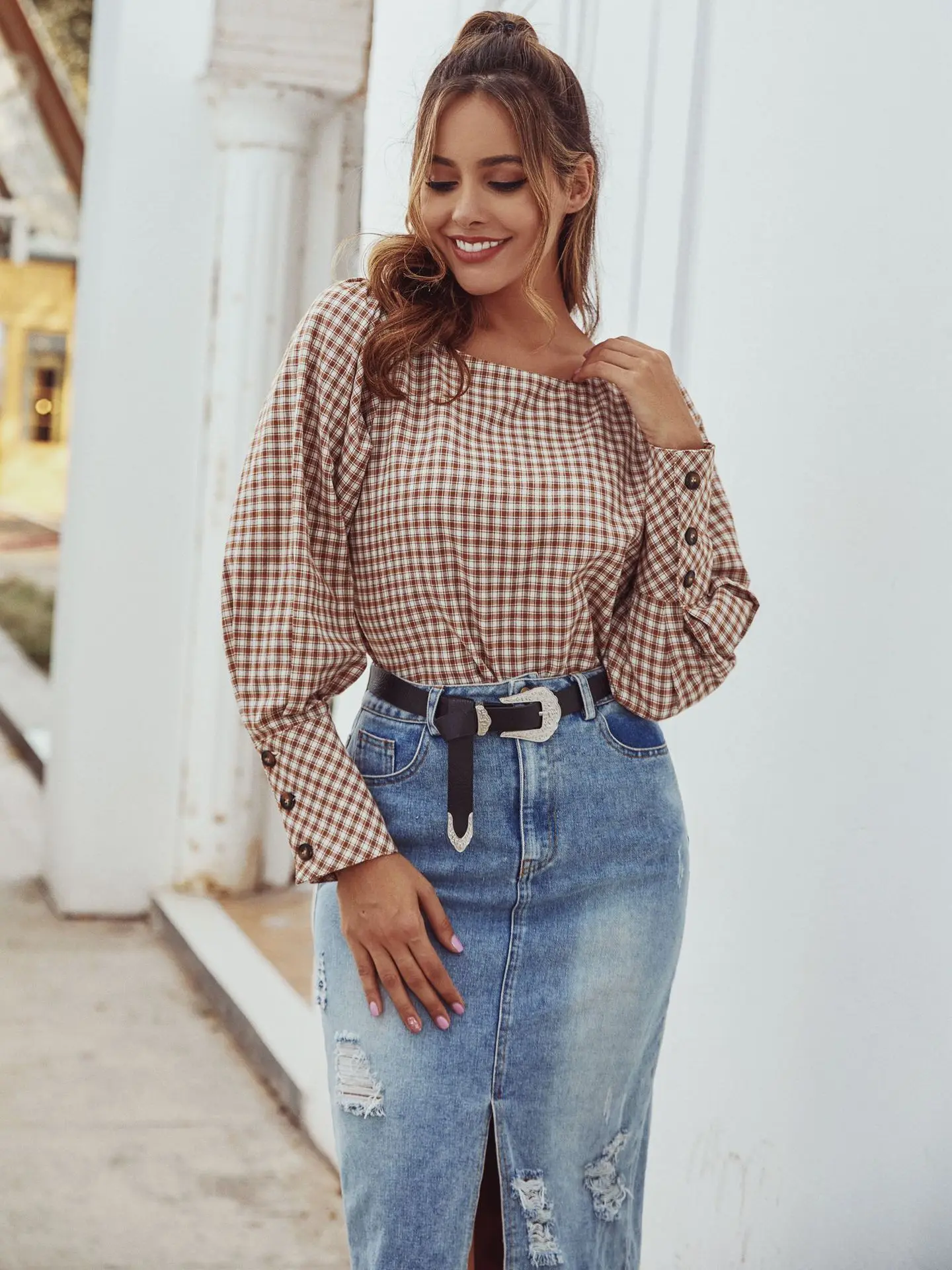 Spring Autumn Women Shirts Retro Check Lantern Sleeve Square Neck Loose Shirt Top Casual All-match Top Blouses