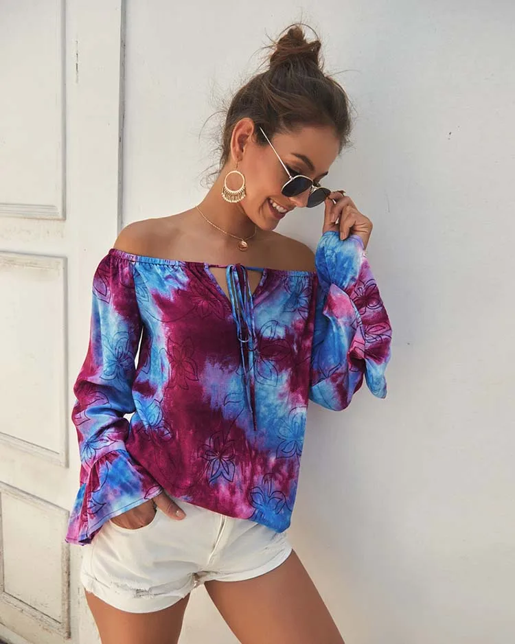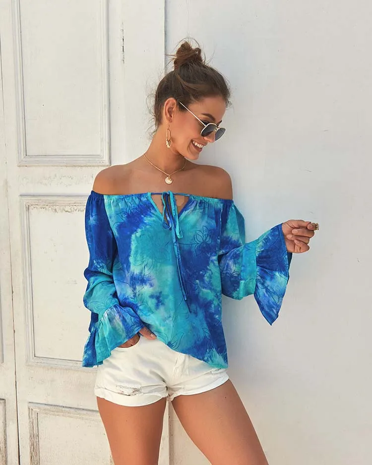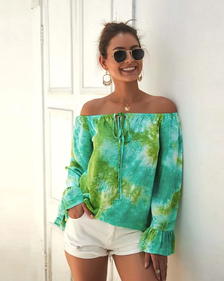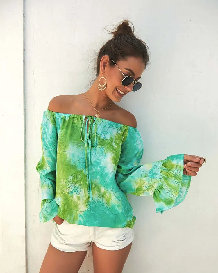 Summer Printed Shirt Long Sleeve Sexy Strapless Blouses Women Elegant Slim-fitting Slash Neck Tops Street Ladies Blouse