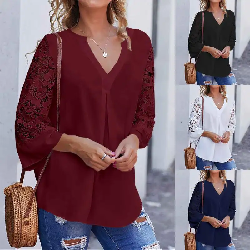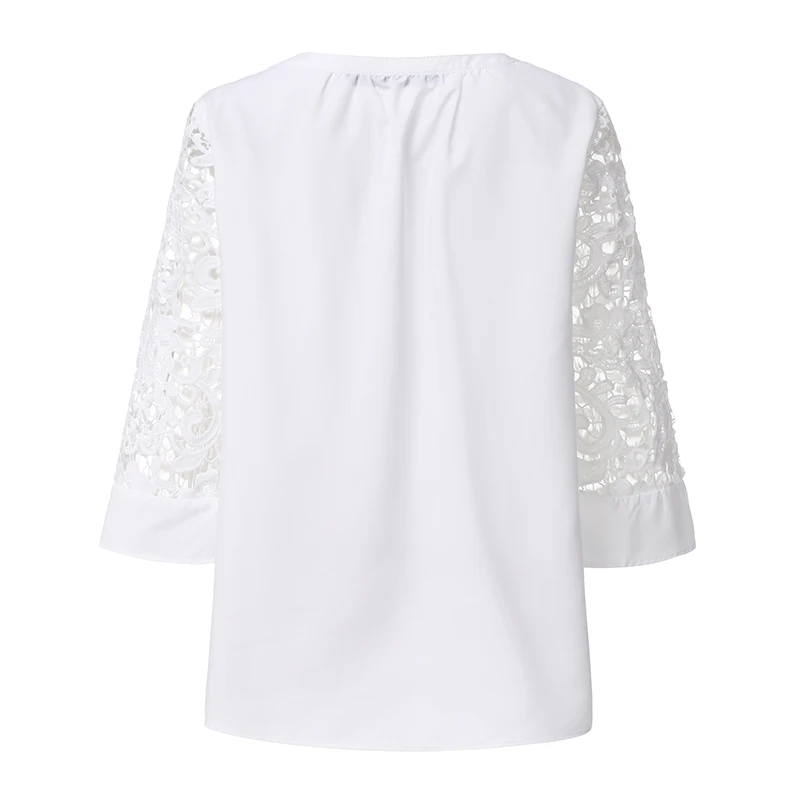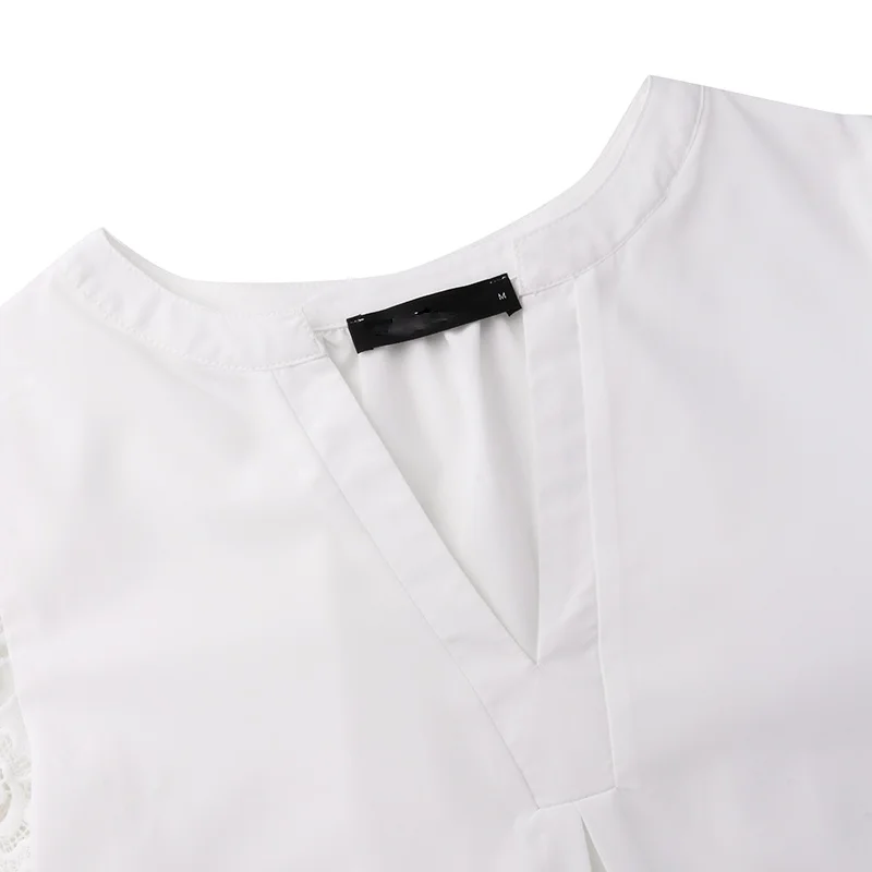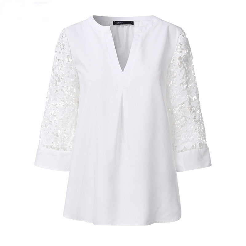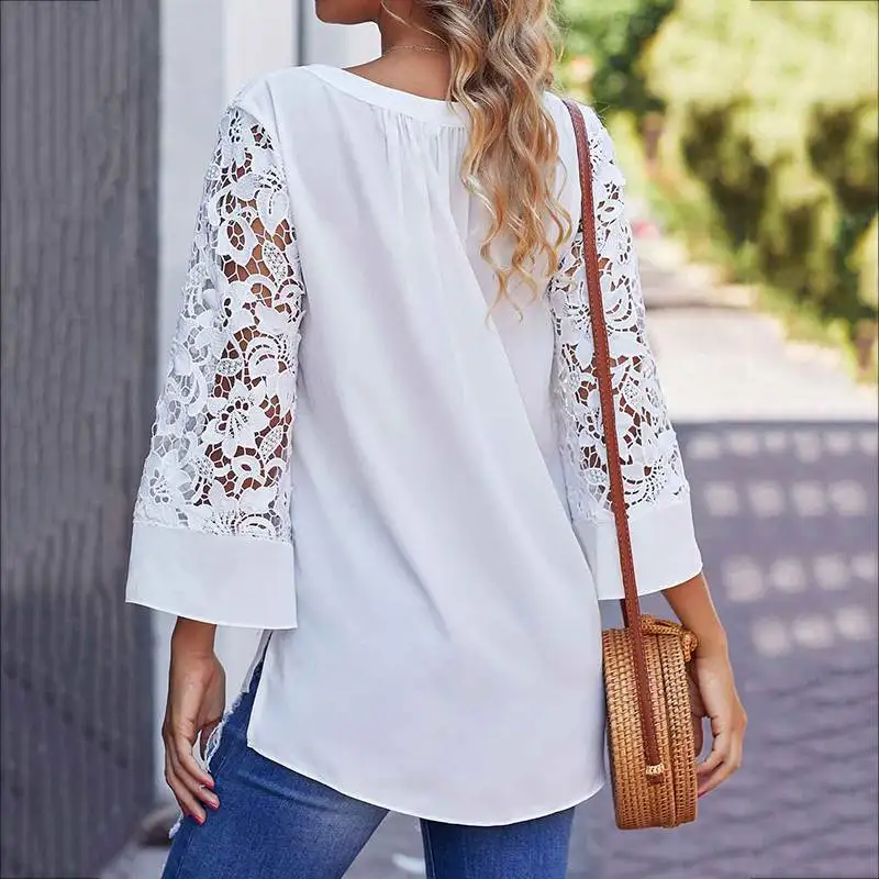 Summer Women White Blouse V-Neck Lace Shirts 3/4 Sleeve Sexy Hollow Out Tunic Tops Casual Loose Solid Office Blusas S-5XL