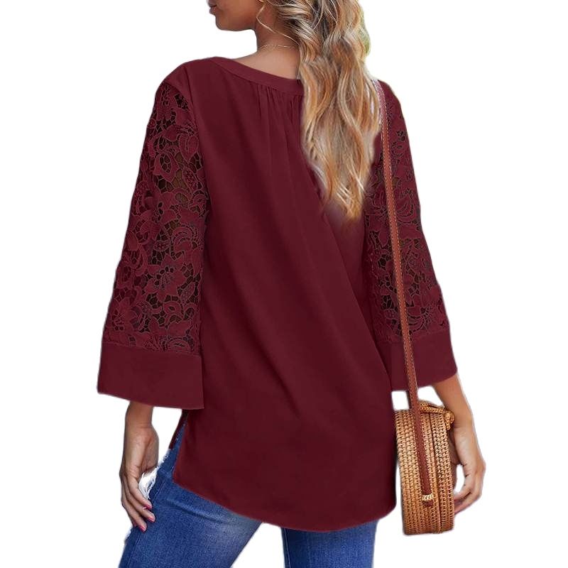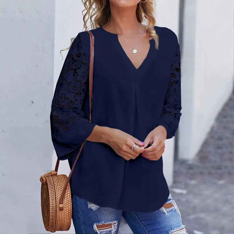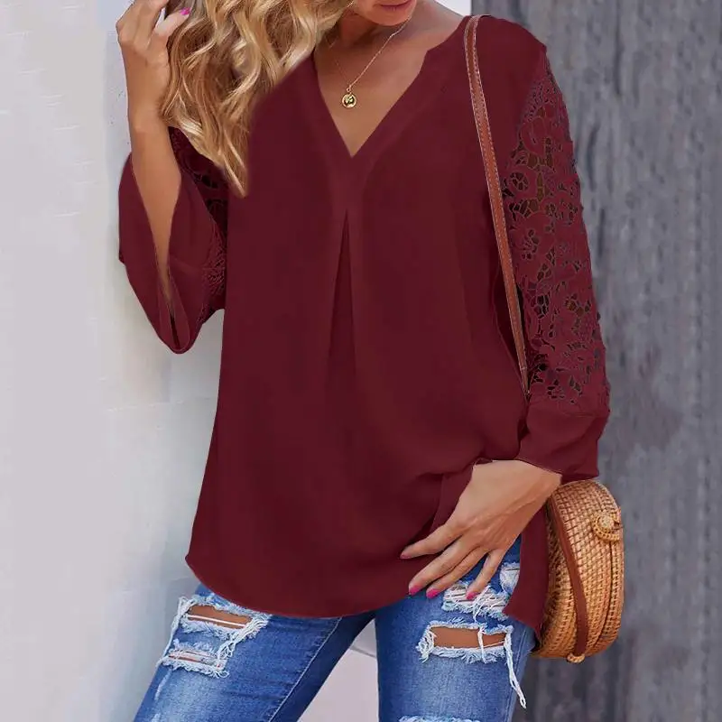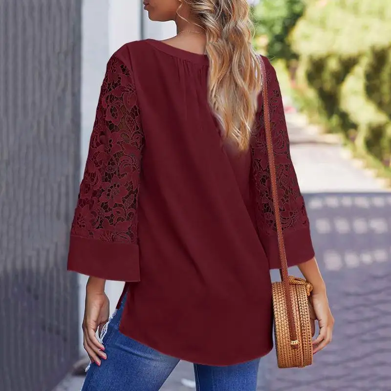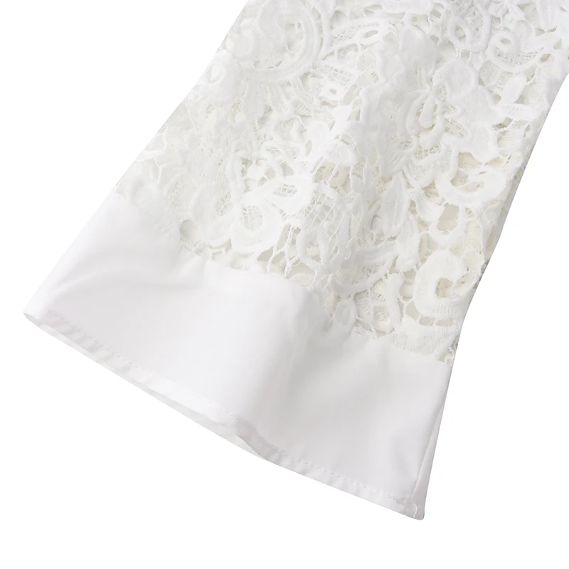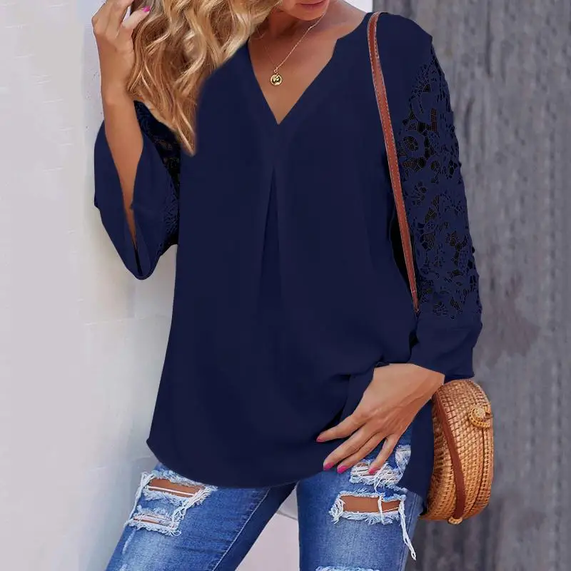 Summer Women White Blouse V-Neck Lace Shirts 3/4 Sleeve Sexy Hollow Out Tunic Tops Casual Loose Solid Office Blusas S-5XL