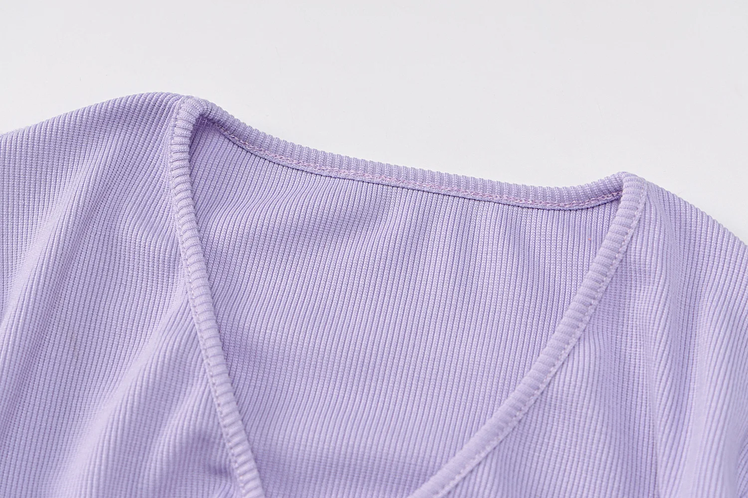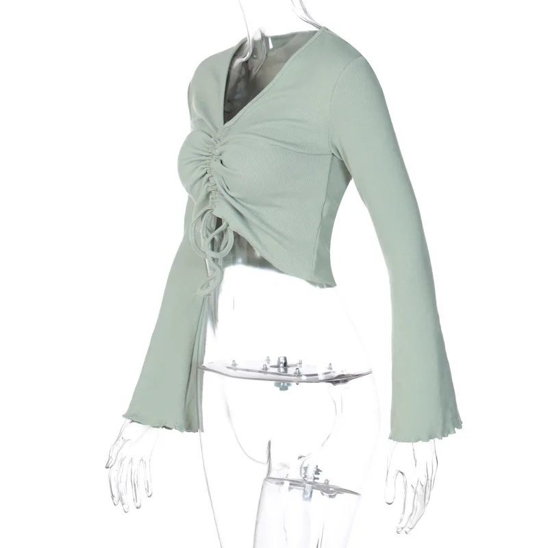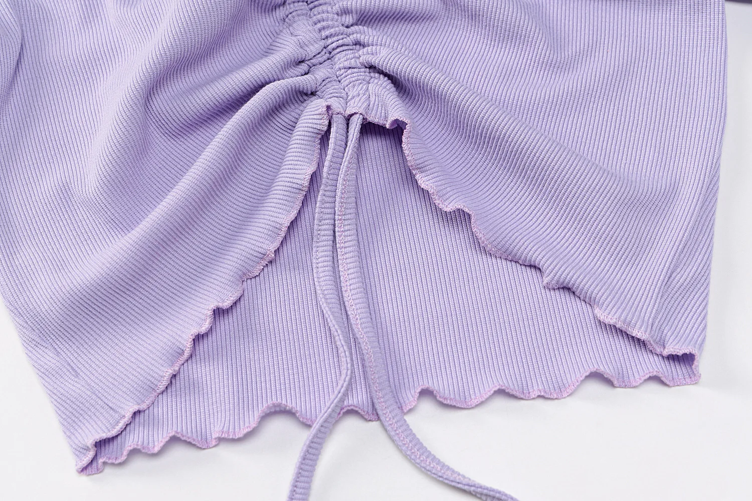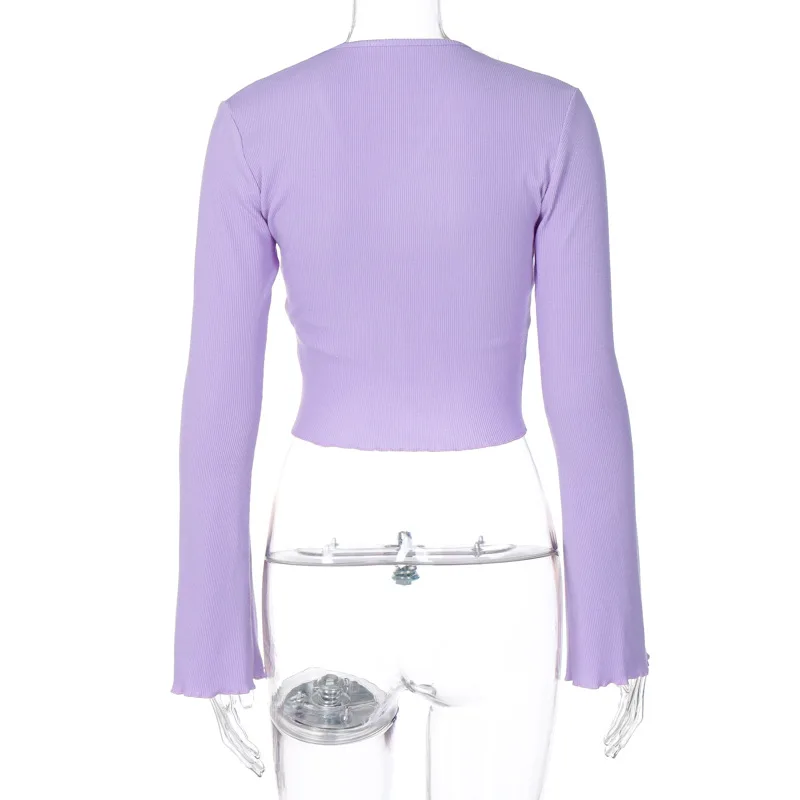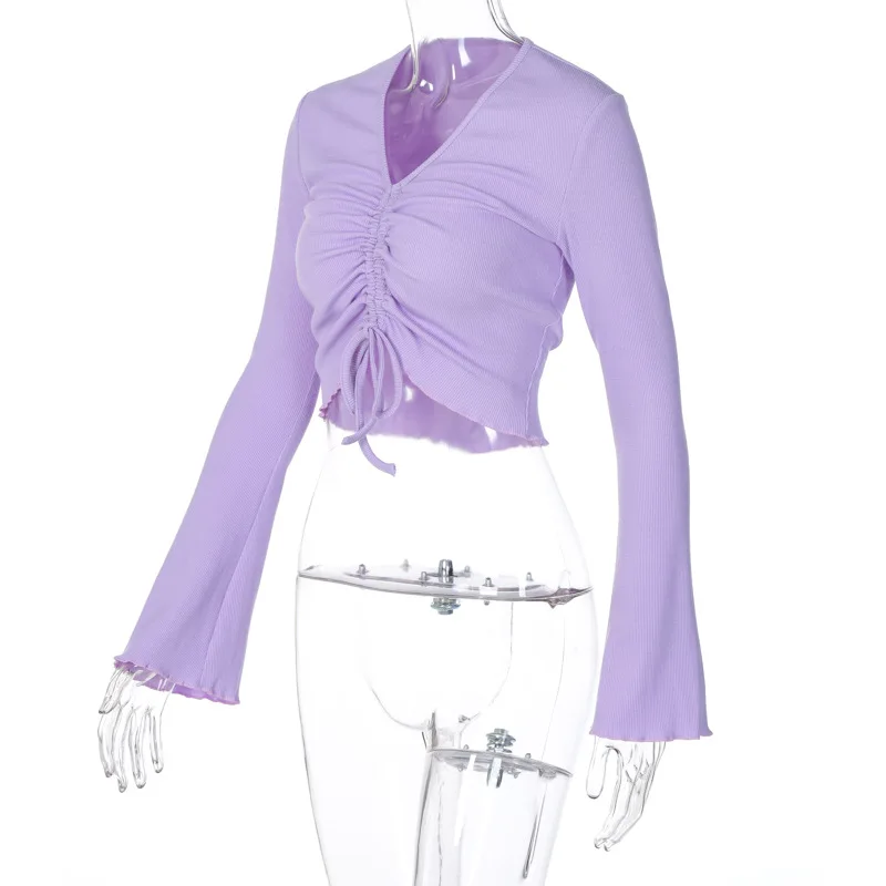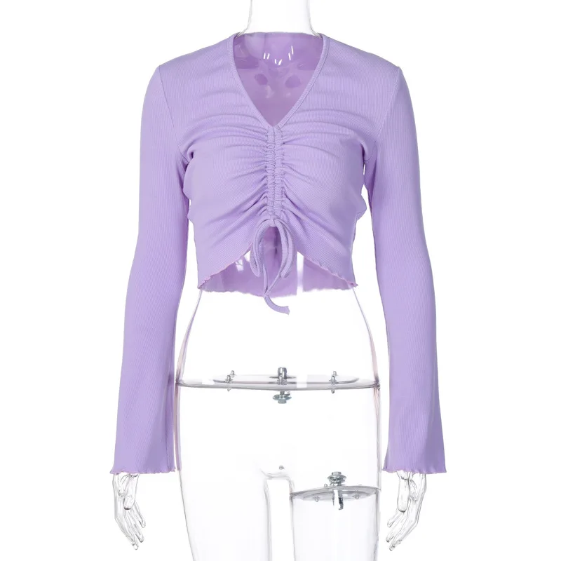 V-Neck Flare Sleeve Long Drawstring Slim Purple Crop Top Pleated Solid Simple Sweet T Shirts Women Casual Autumn Tops