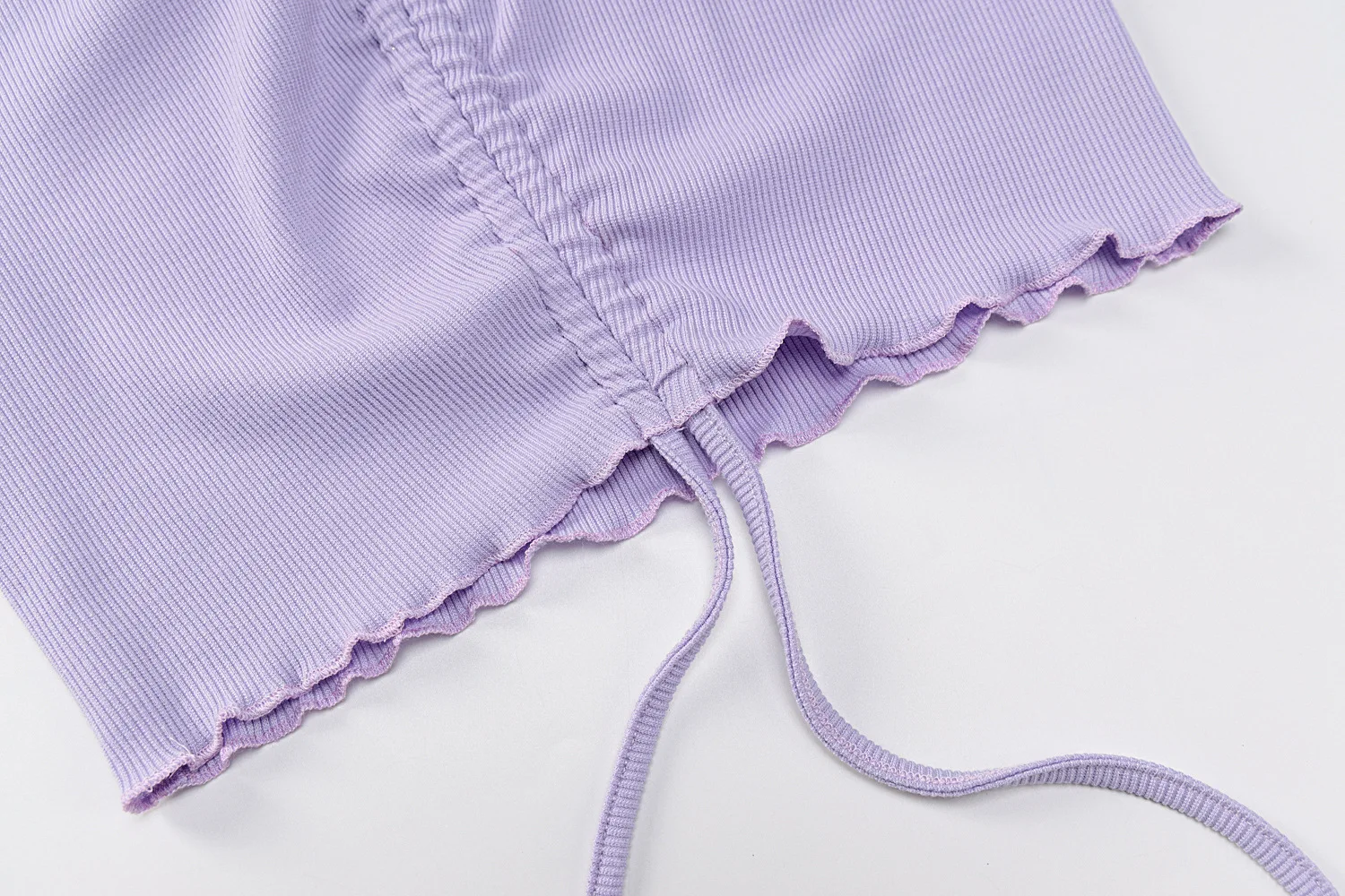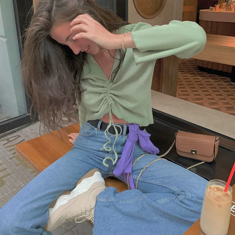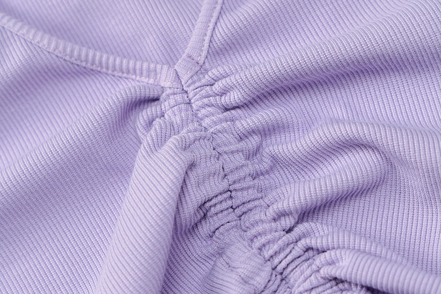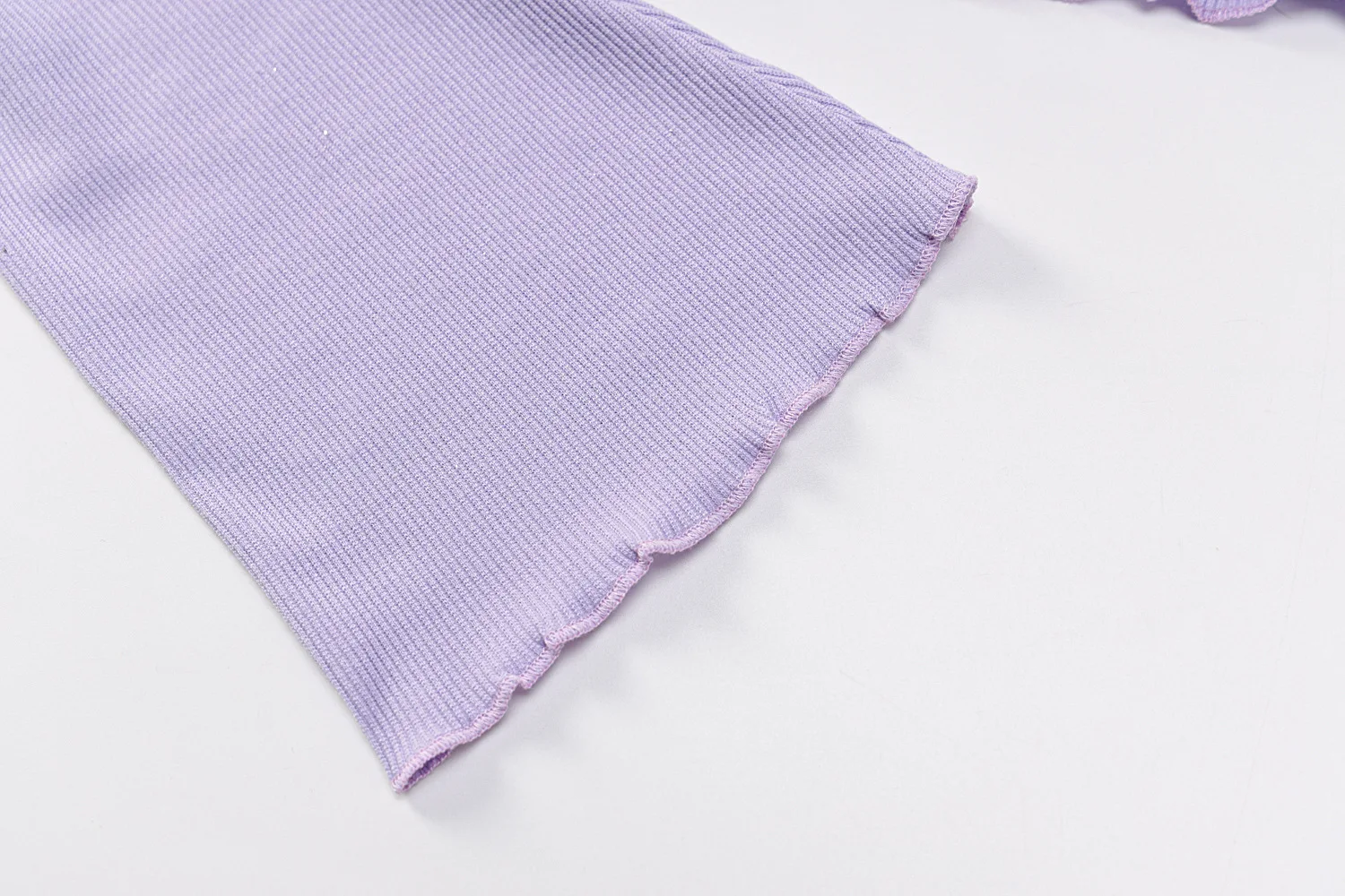 V-Neck Flare Sleeve Long Drawstring Slim Purple Crop Top Pleated Solid Simple Sweet T Shirts Women Casual Autumn Tops
