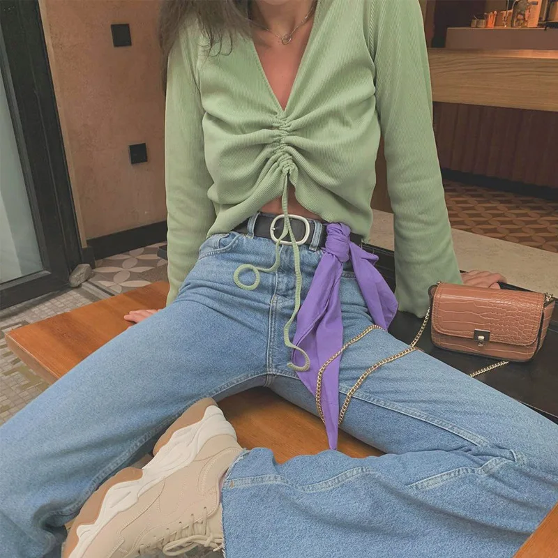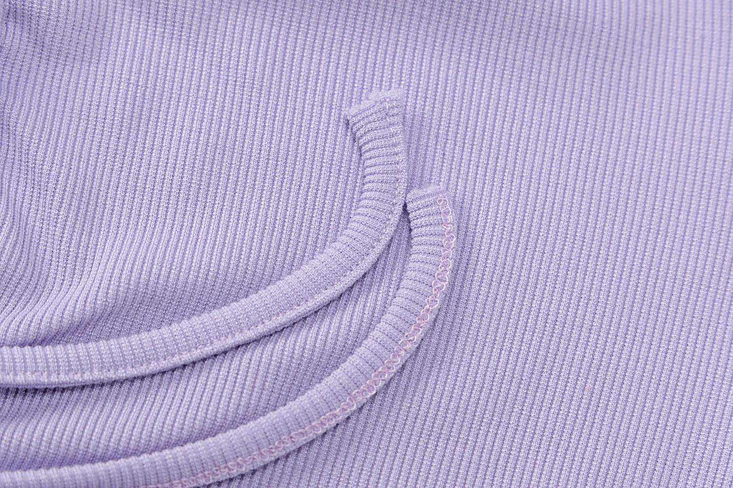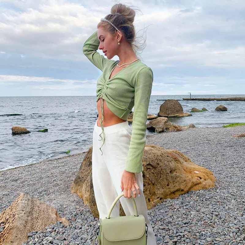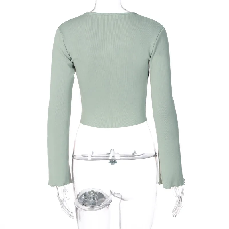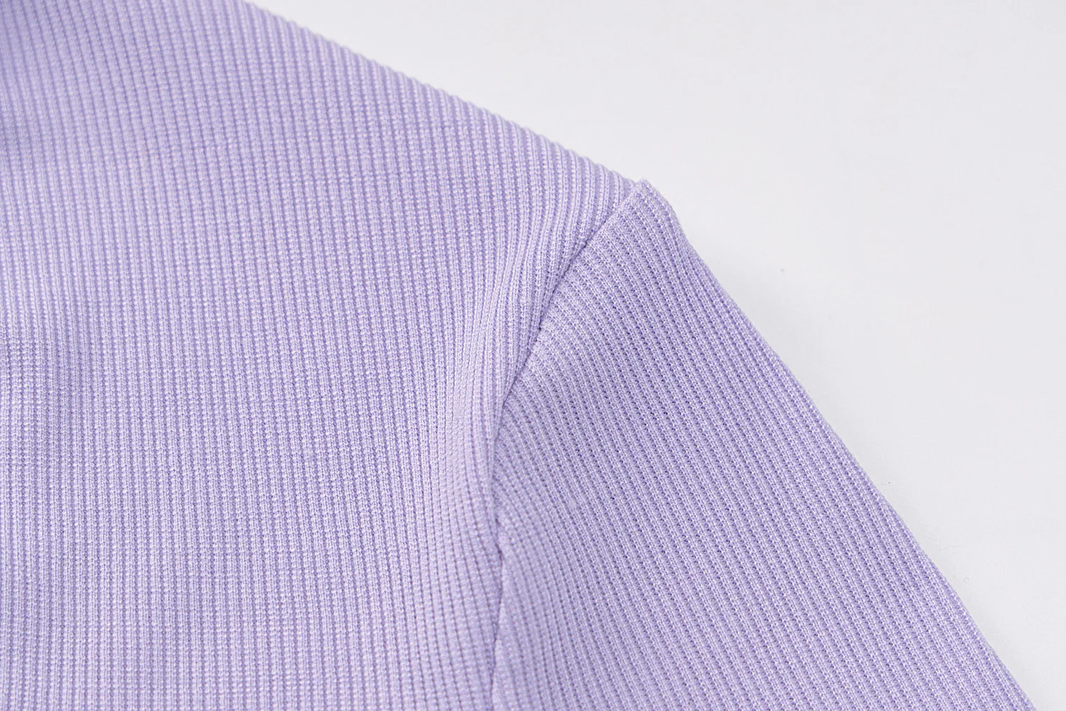 V-Neck Flare Sleeve Long Drawstring Slim Purple Crop Top Pleated Solid Simple Sweet T Shirts Women Casual Autumn Tops