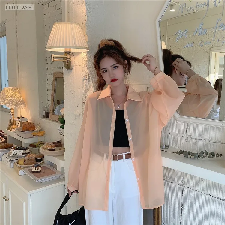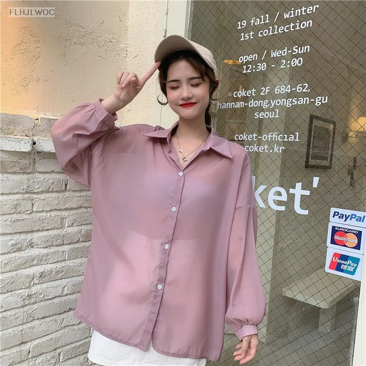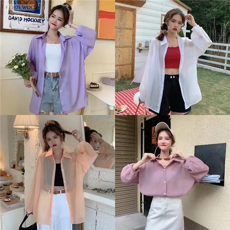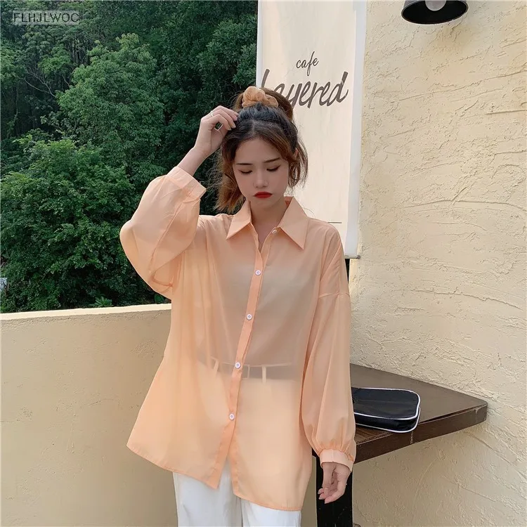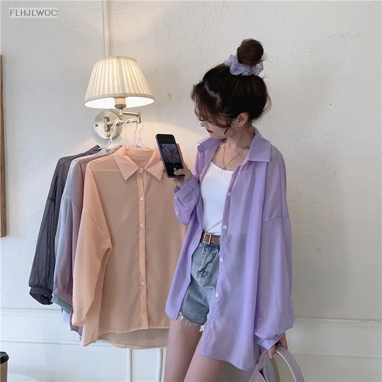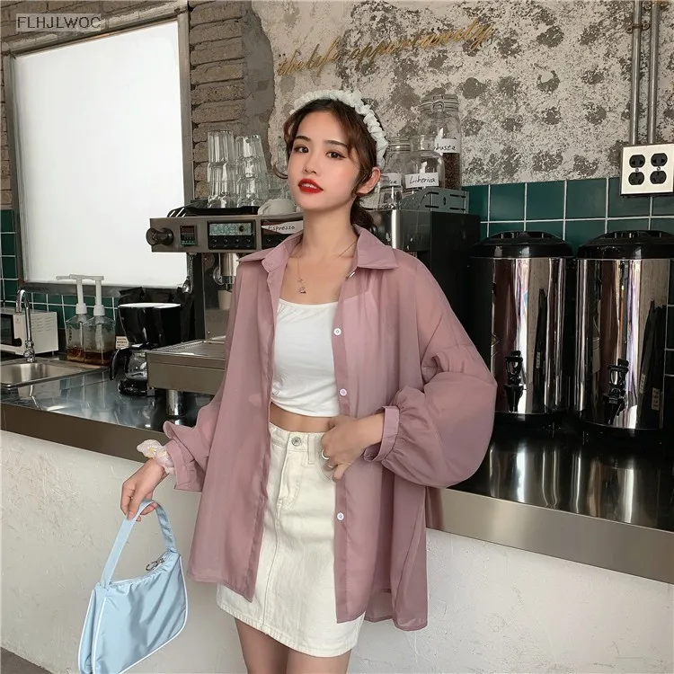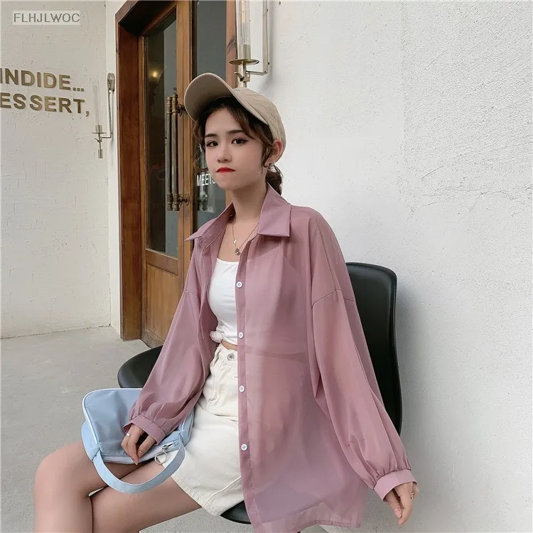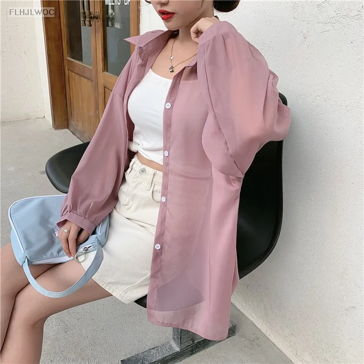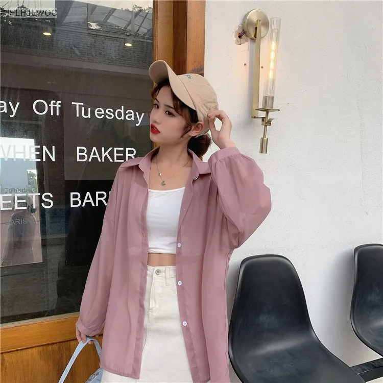 Wholesale 2021 Women Holiday Transparent Boyfriend Shirts Blue Pink Apricot Sunscreen Shirt Summer Vacation Tunic Long Blouses