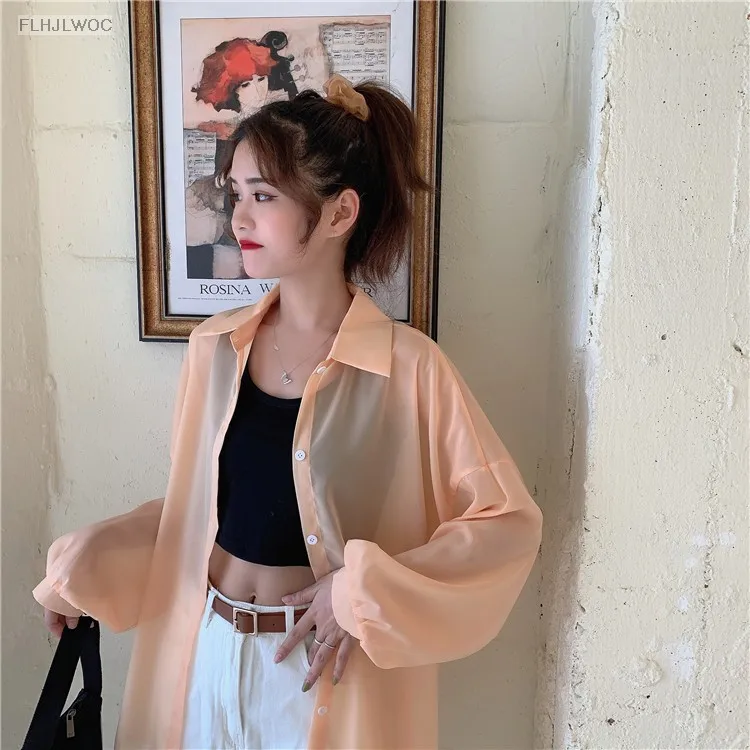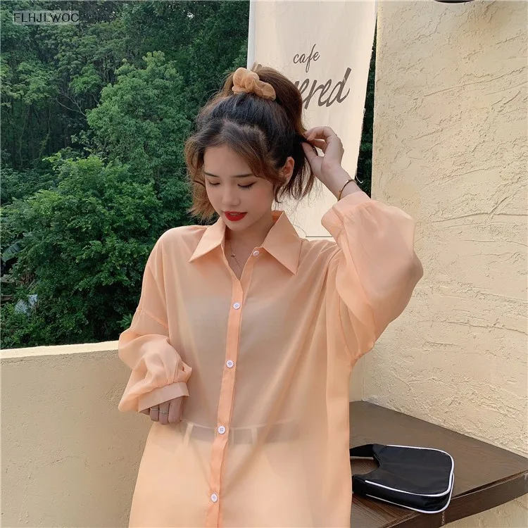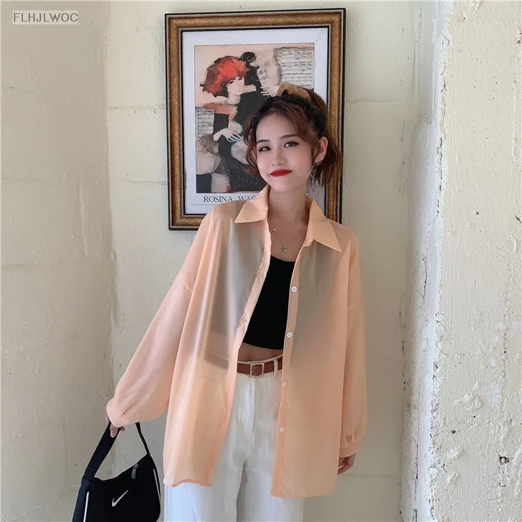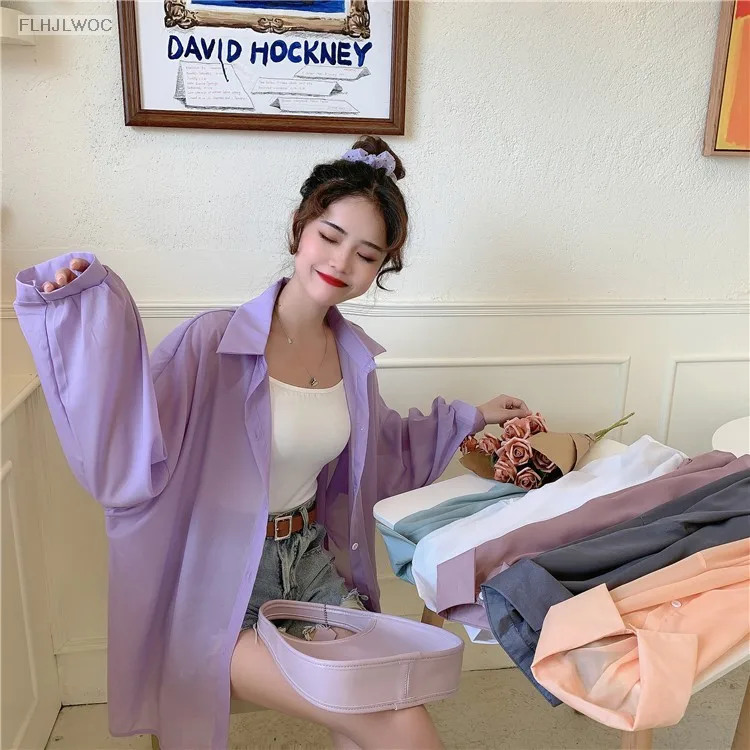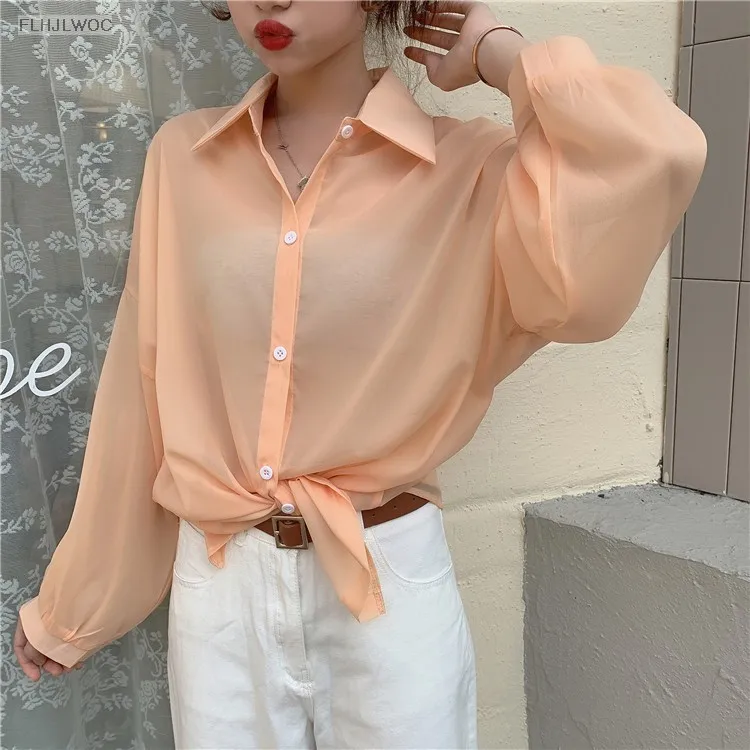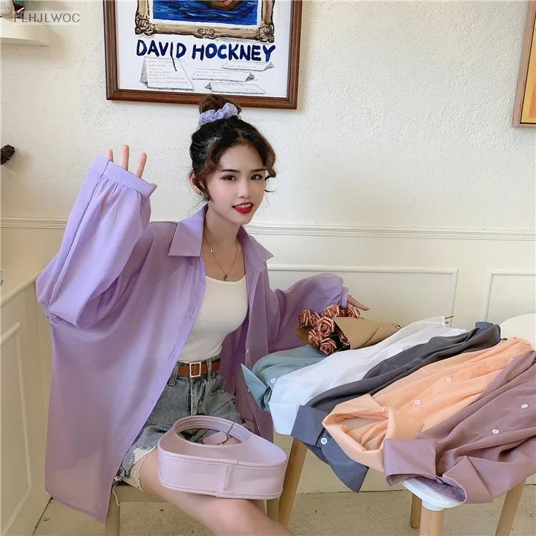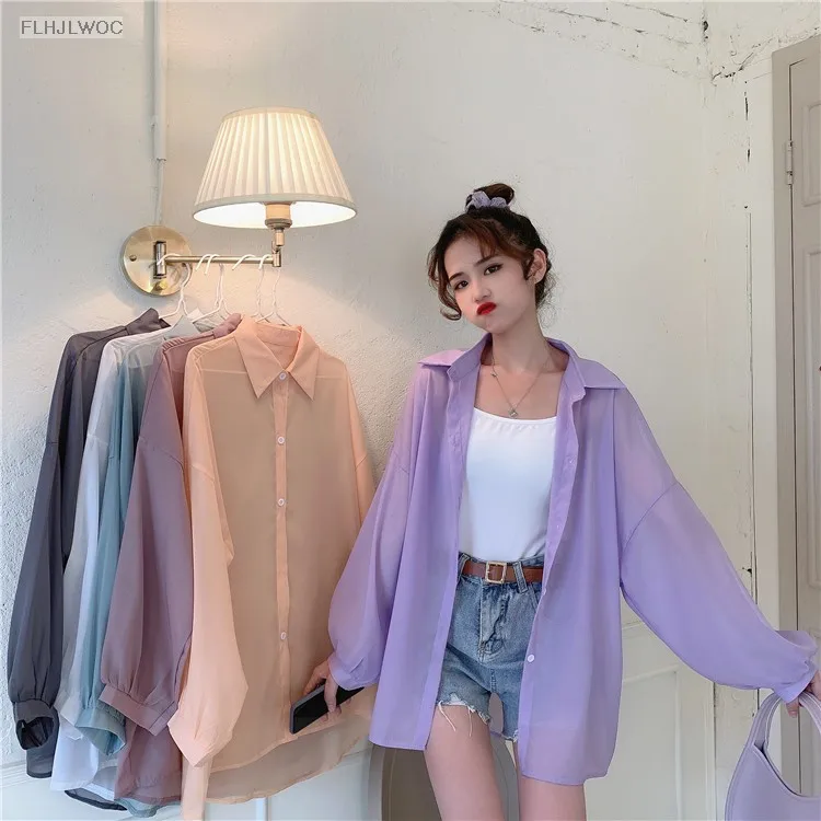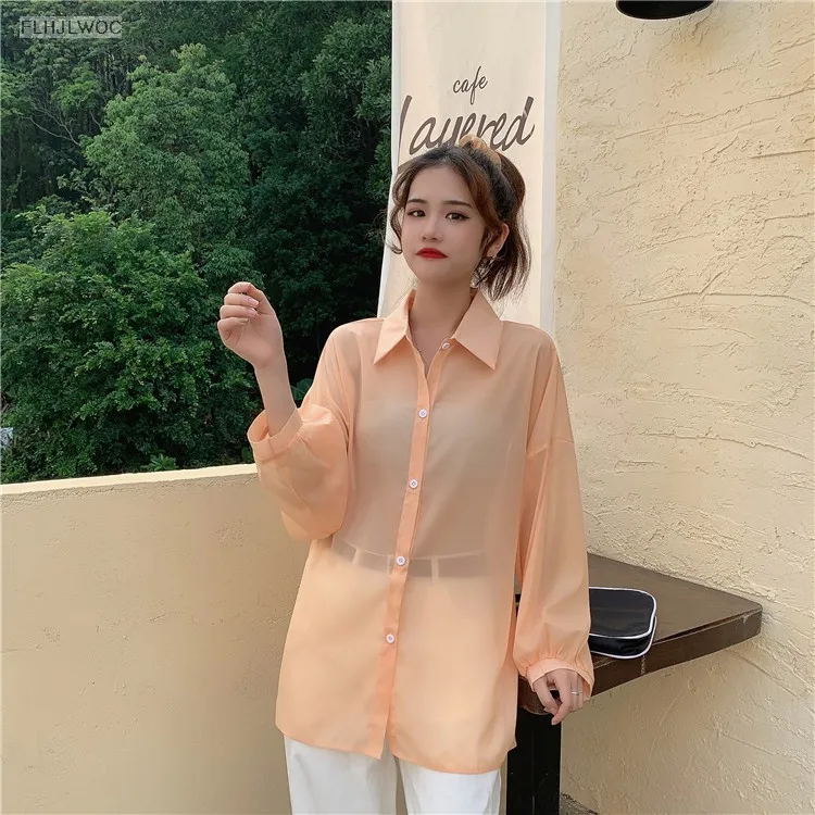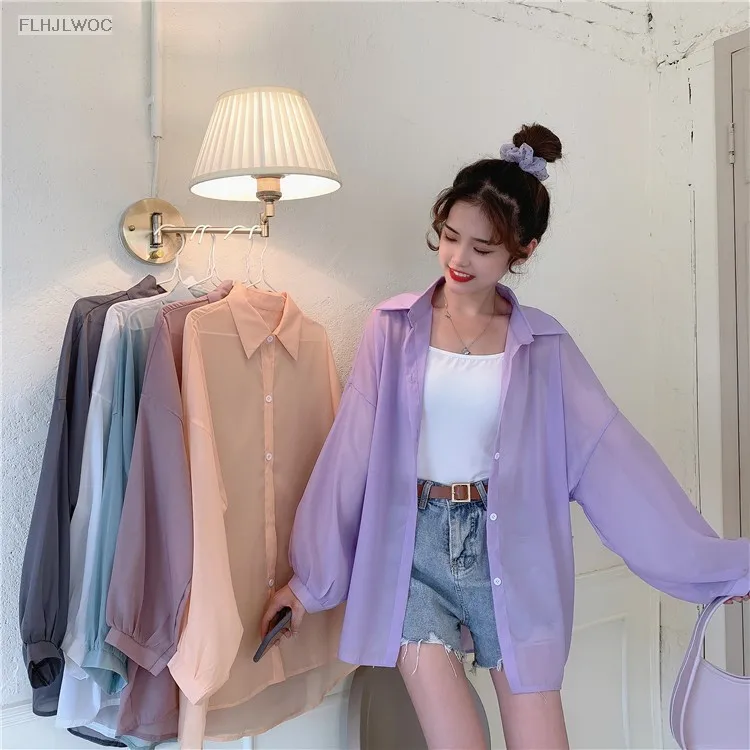 Wholesale 2021 Women Holiday Transparent Boyfriend Shirts Blue Pink Apricot Sunscreen Shirt Summer Vacation Tunic Long Blouses