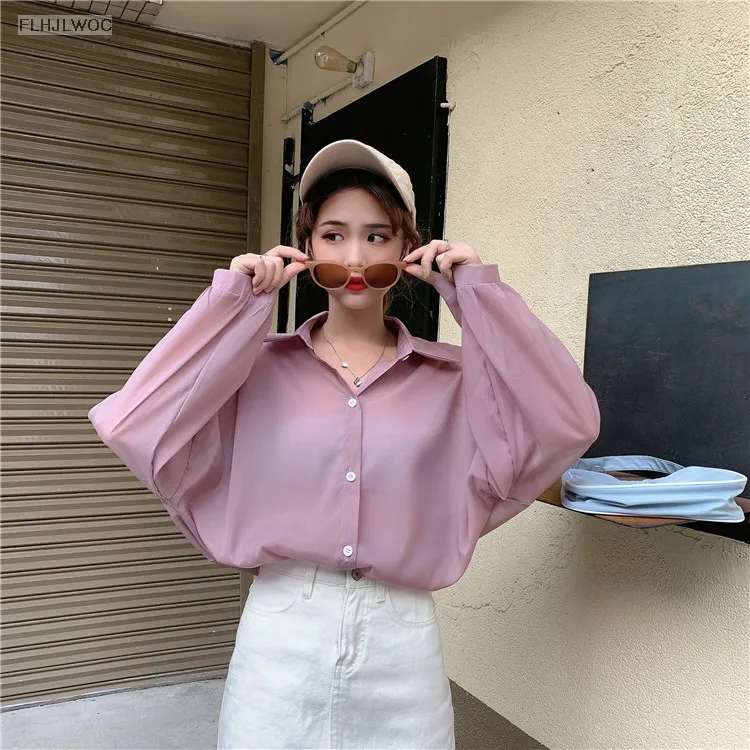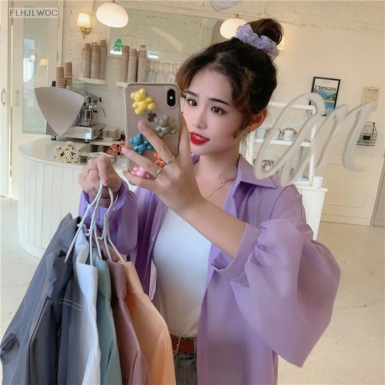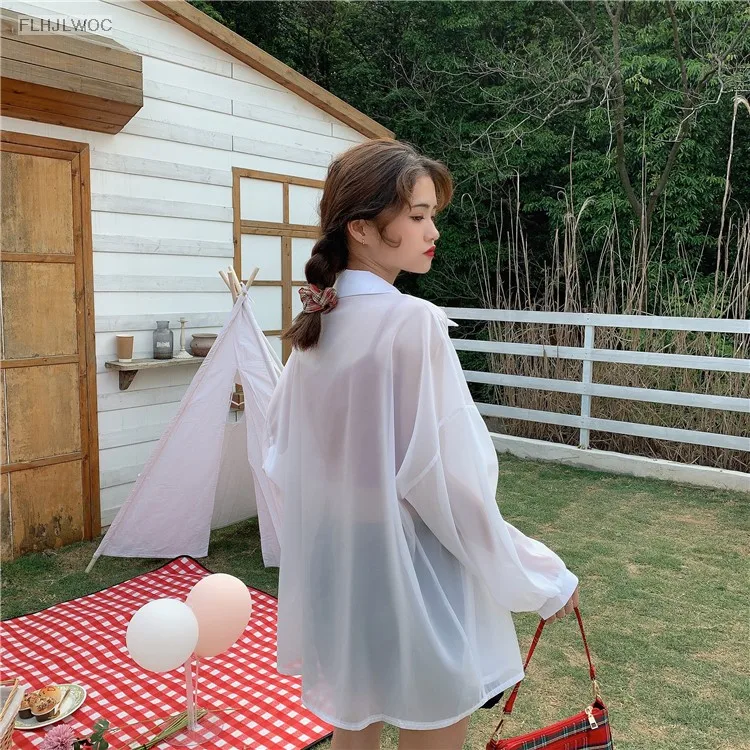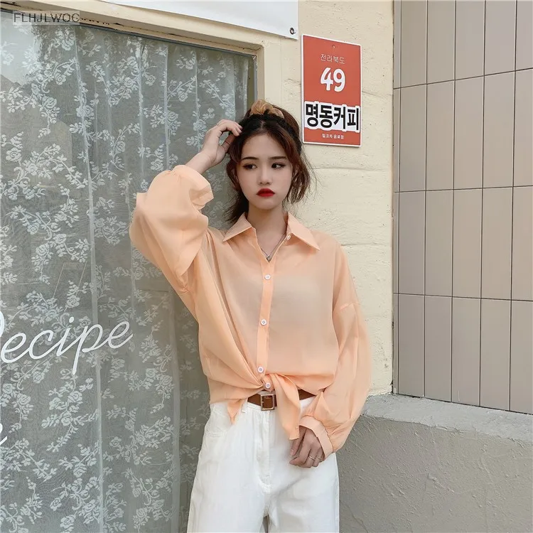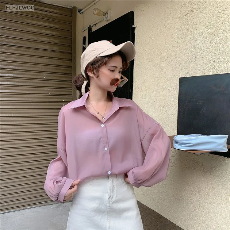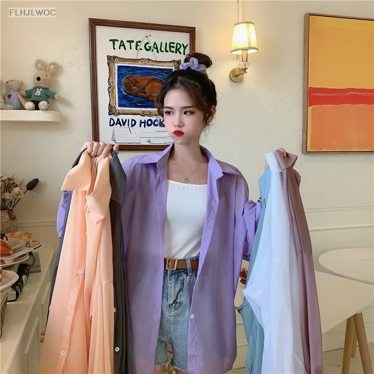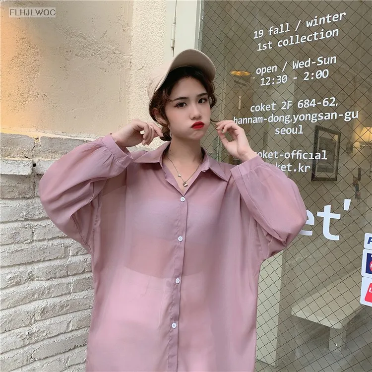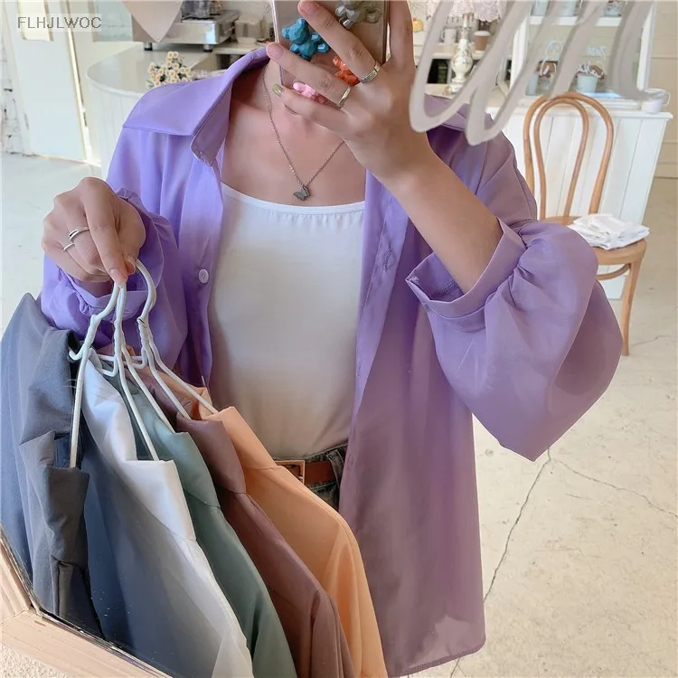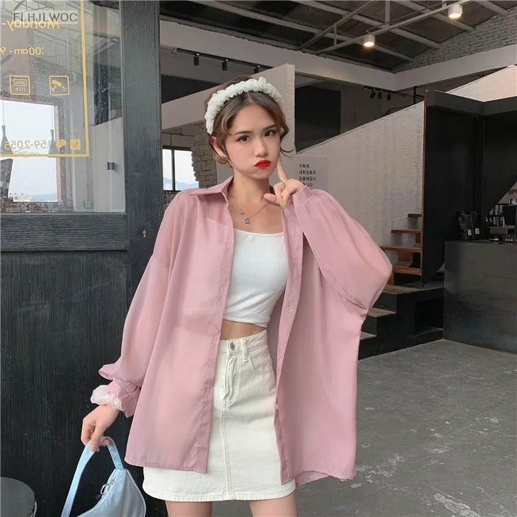 Wholesale 2021 Women Holiday Transparent Boyfriend Shirts Blue Pink Apricot Sunscreen Shirt Summer Vacation Tunic Long Blouses