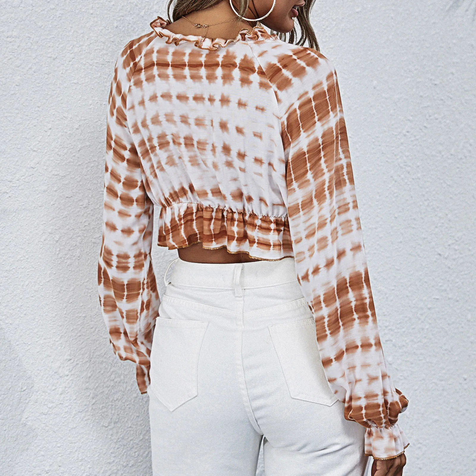 This tie dye print cardigan with frilled V-neck, front drawstring and ruffle hem is eye-catching. Pair it with shorts, skirts and jeans for street and party.